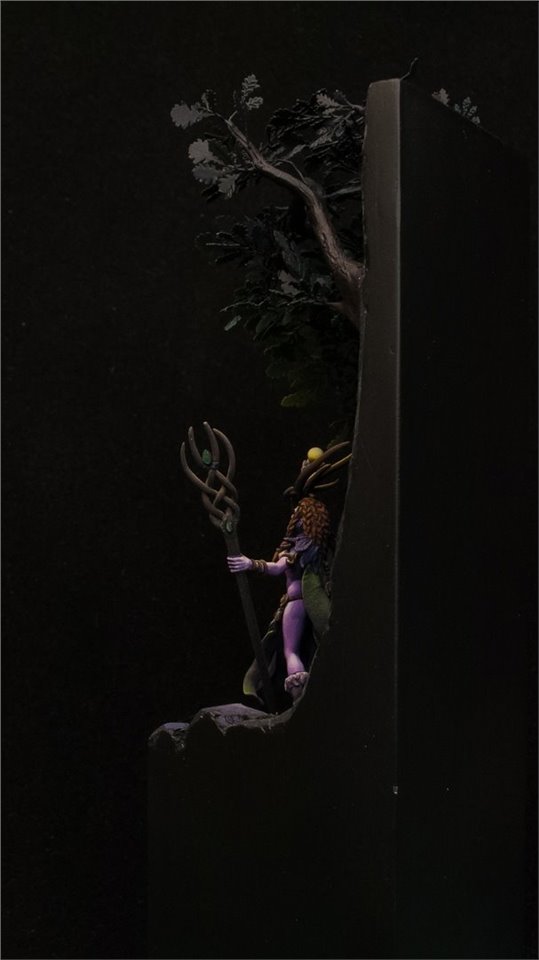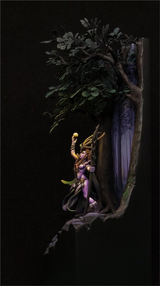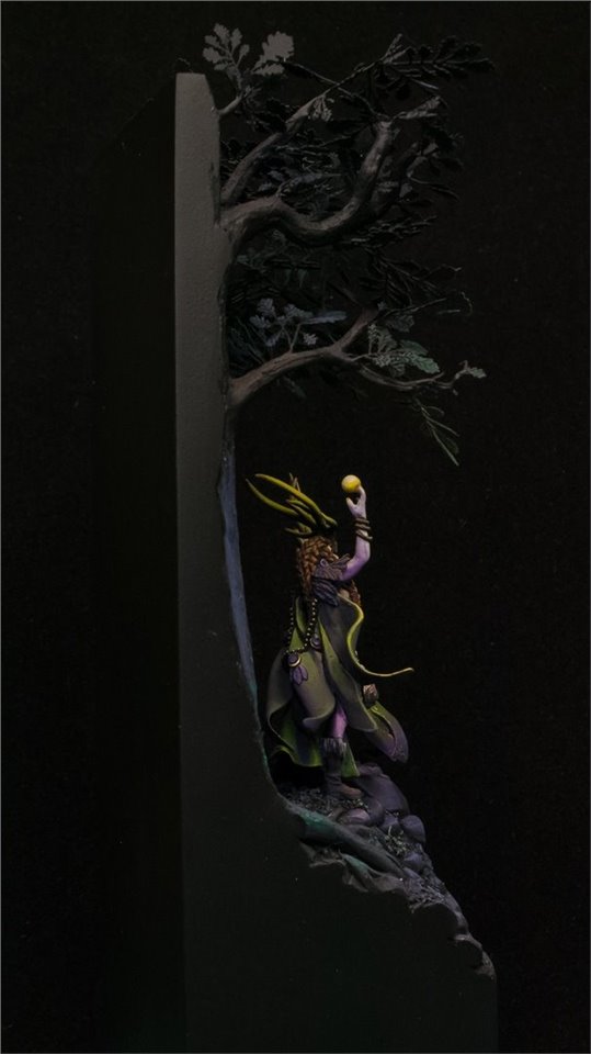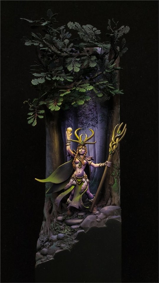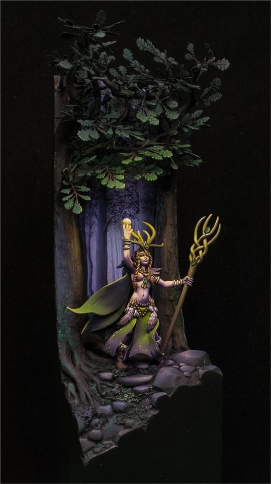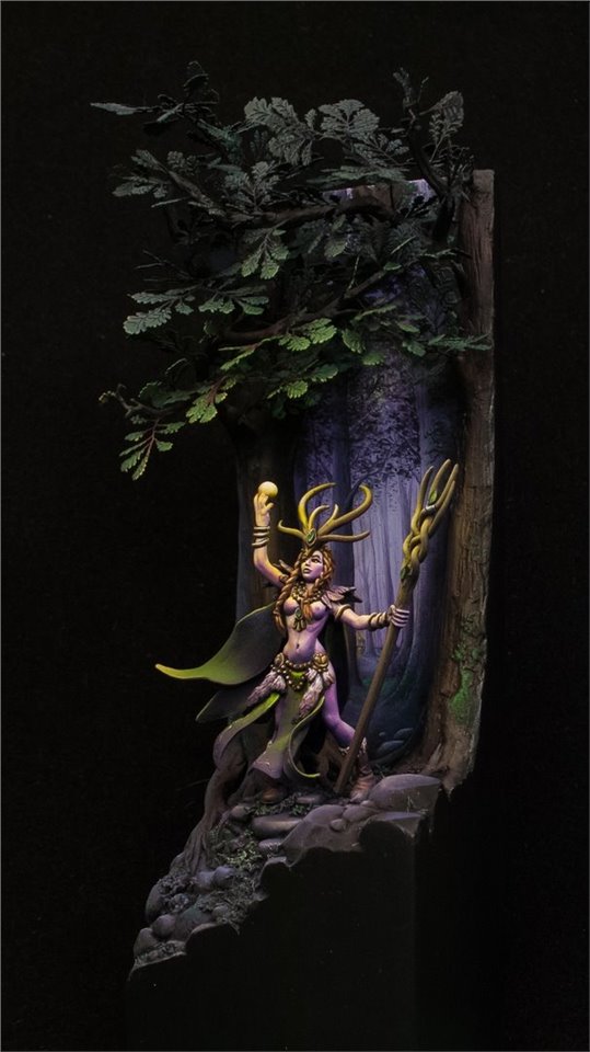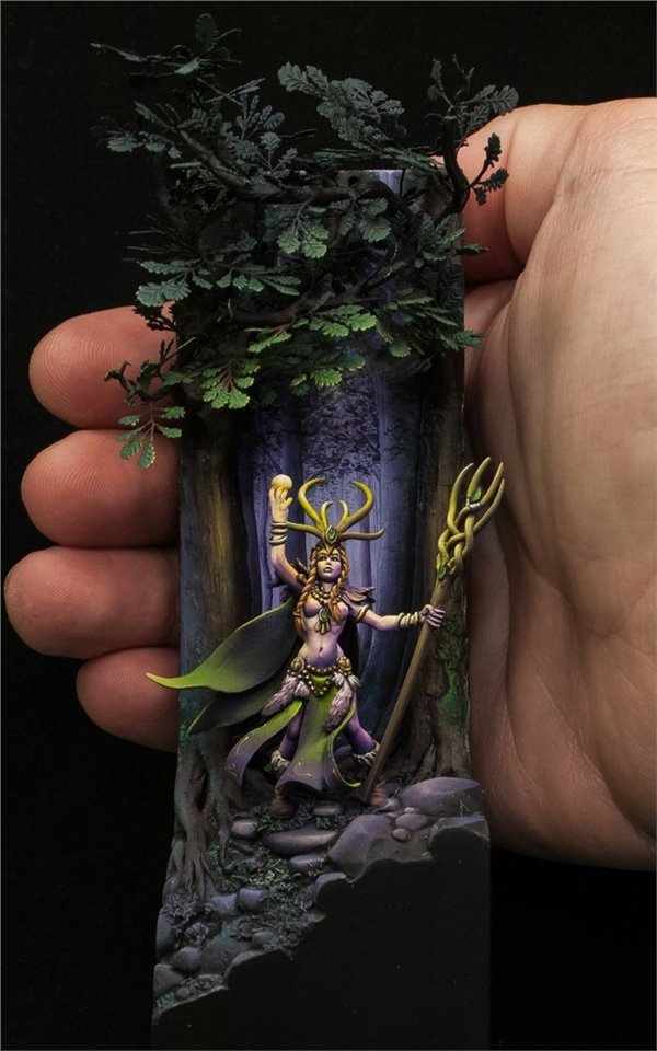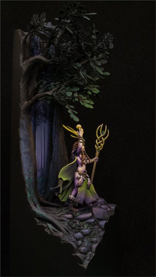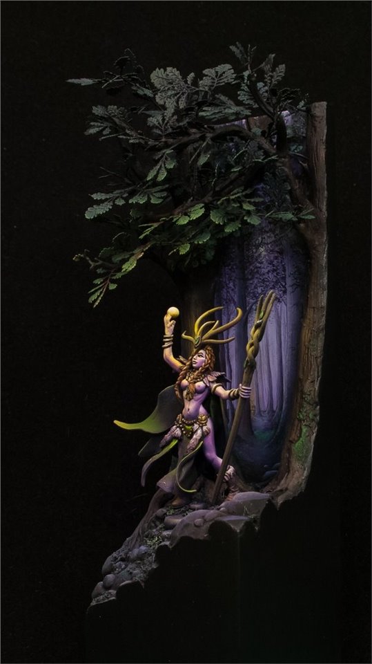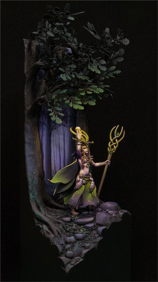 Хочу опубликовать, после длительного, почти годового перерыва в ВК свежую работу! Работа эта задумывалась сразу после того, как я получил от ребят из "ЗОЛОТОЙ ДУБ" замечательную фигурку друида. Мне она очень понравилась, но, как часто бывает "руки не доходили" и она была отложена в долгий ящик, пока я не наелся вездесущим ныне 3D скульптингом и мне не захотелось прикоснуться к классике... Со скульптурой Александра Журбенко я знаком достаточно давно, он делал много замечательных фигур для FIRST LEGION Miniatures и я не мало их покрасил. Тут же работа пошла сама собой, я полностью сам сделал подставку, дополнил её замечательными листьями дуба от MiniWarPaint и нарисовал фон. Слеплено всё было из двухсоставной смеси от HobbyBro, о процессе создания работы я поведаю в этом сообществе в течение недели, надеюсь вам, дорогие читатели, это будет интересно:)