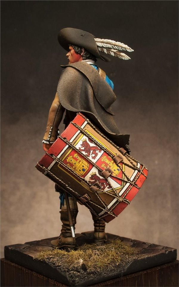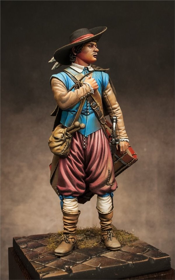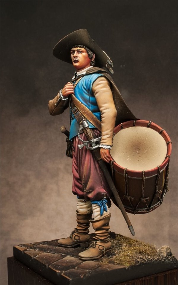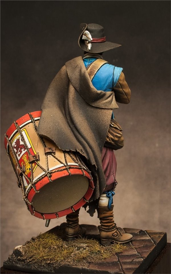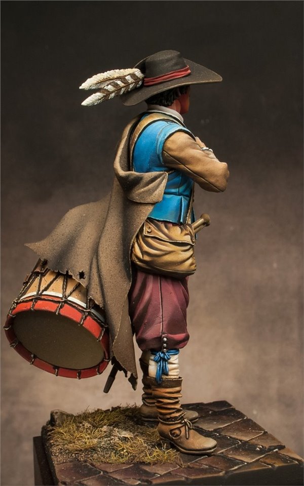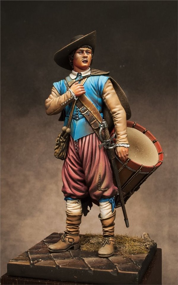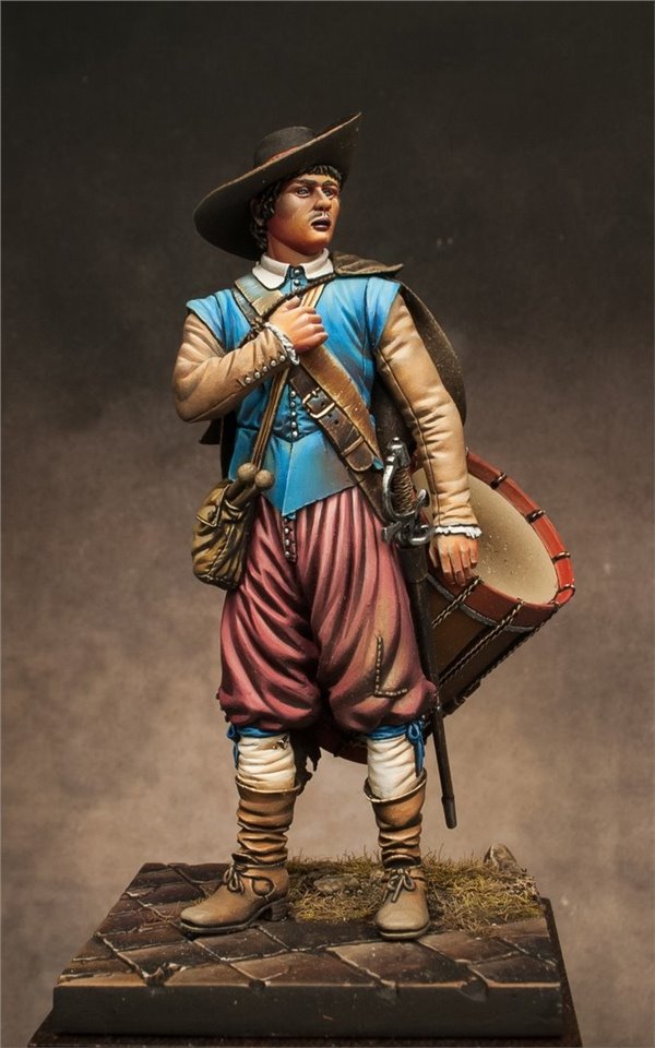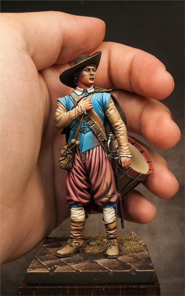 И начну я пожалуй с недавней работы. Фигурка молодого барабанщика испанской терции начала XVII века от ребят из Avanpost Nistorical Miniatures. Юноша этот прошел нелегкий путь длиной в 2 года! Ровно столько прошло