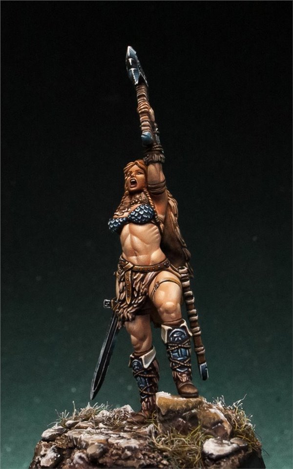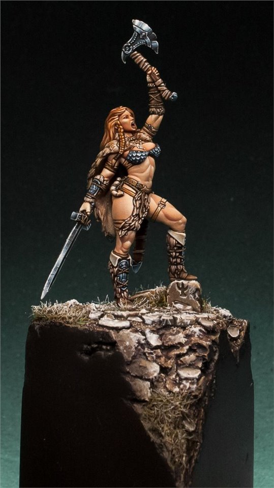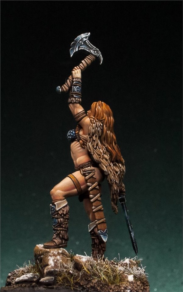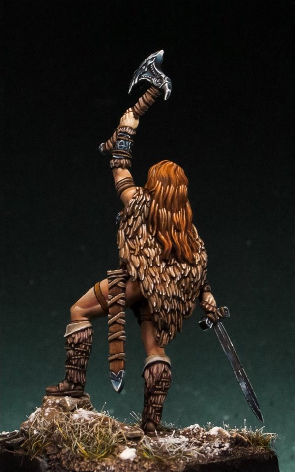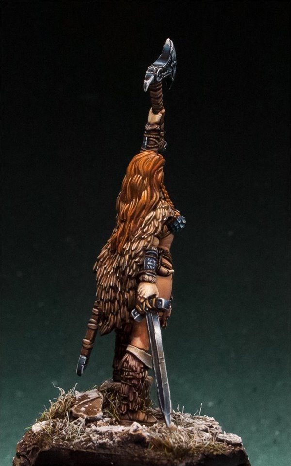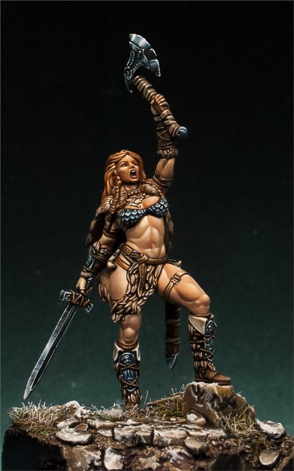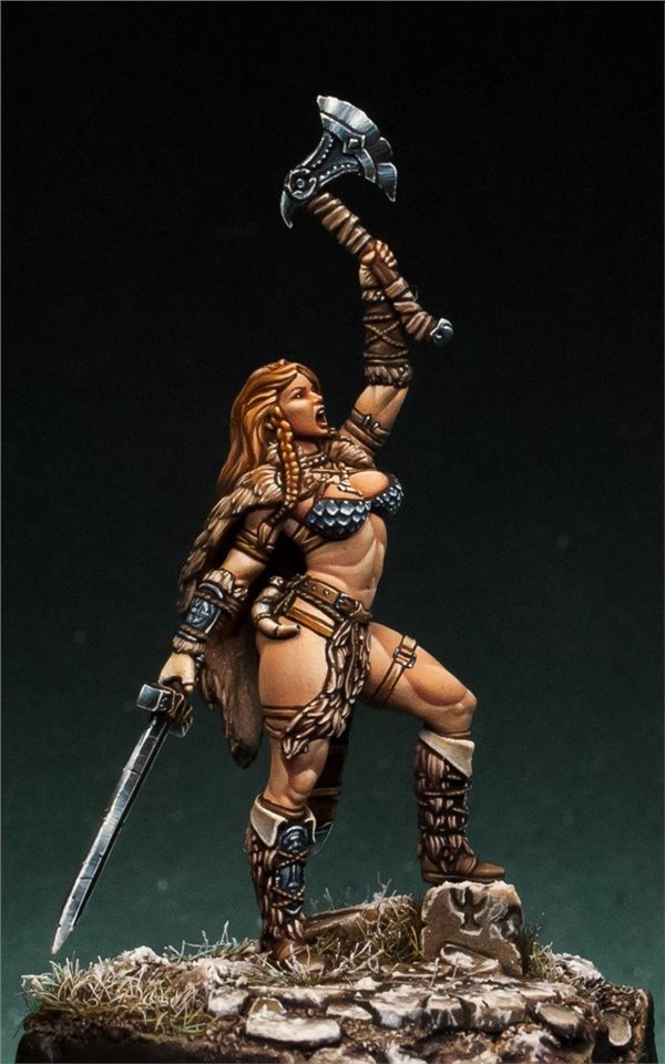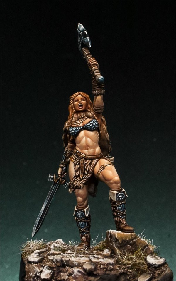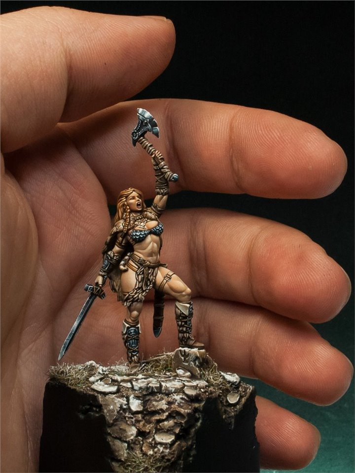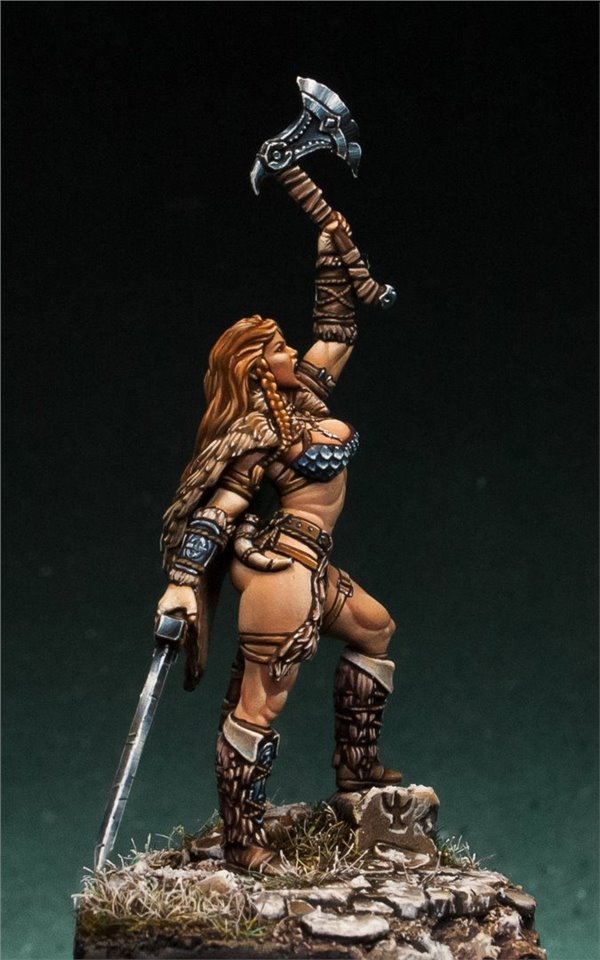 Давно мне не доводилось красить девушек в размере 28 мм, в последний раз (аж 6 лет назад!) это была Красная Шапочка (ссылка на работу www.coolminiornot.com/336290) от ныне покойной испанской студии "Tale of War", сейчас же мне представилась возможность поработать над новой фигурой из недавно завершившегося проекта на кикстартере от моих друзей из FIRST LEGION Miniatures. Встречаем прекрасную рыжую женщину - варвара! Имени, к сожалению, у неё нет, потому если есть какие идеи - пишите в комментарии;)