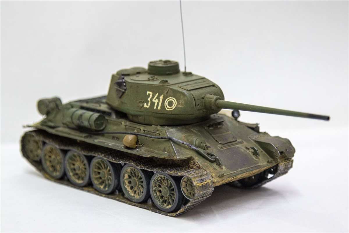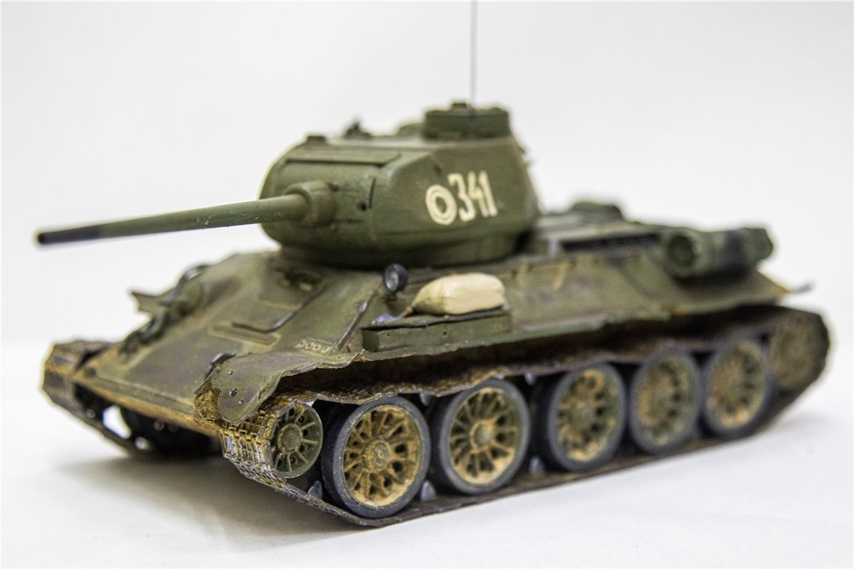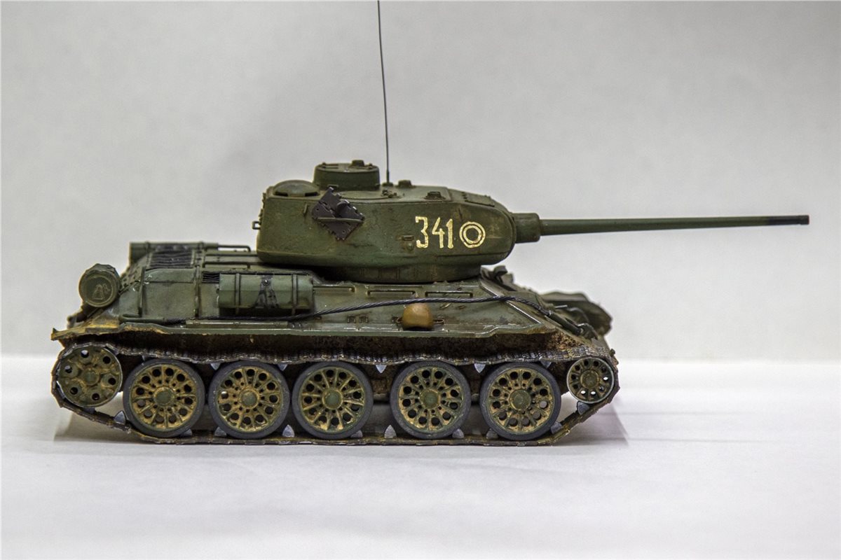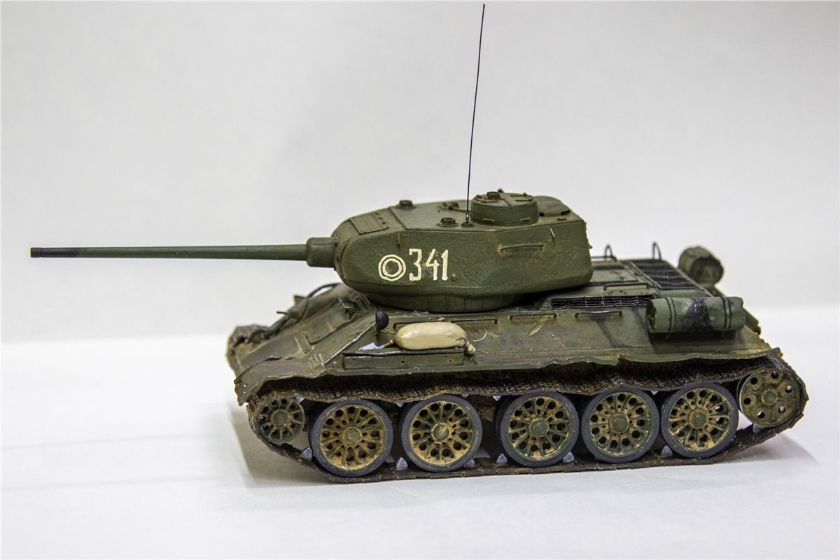 Танк Т-34-85 образца 1944 года. Масштаб 1/35. Фирма-производитель: ICМ. На модели были заменены пластиковые детали на металлические (фототравление) - решетка над отсеком МТО, 5 штук. крепление дополнительного топливного бака. Танковый трос так же заменен на металл. Башня вращается на 360 градусов. Внутри есть частичный интерьер ( в башне казенная часть орудия и пулемет, в корпусе танка - кресла механика-водителя и стрелка-радиста). Гусеницы наборные, катки заменены на более деталированные фирмы MINIART. Доработан ящик ЗиП (полуоткрытый), для придания реалистичности модель танка имеет боевые повреждения, сколы краски, ржавчину, потертости металла, вмятины, следы от рикошета снарядов и осколков, потёки ГСМ, на корме следы выхлопа, на оконечности орудия есть пороховой нагар. На правой надгусеничной полке добавлен мешок, на левой надгусеничной полке солдатский вещмешок. На днище и ходовой части выполнена имитация грязи, грунта и дорожной пыли. Модель танка имеет реальный исторический прототип Т-34-85 бортовой номер 341 из состава 3-ей гвардейской танковой армии 7-й гвардейский танковый корпус.