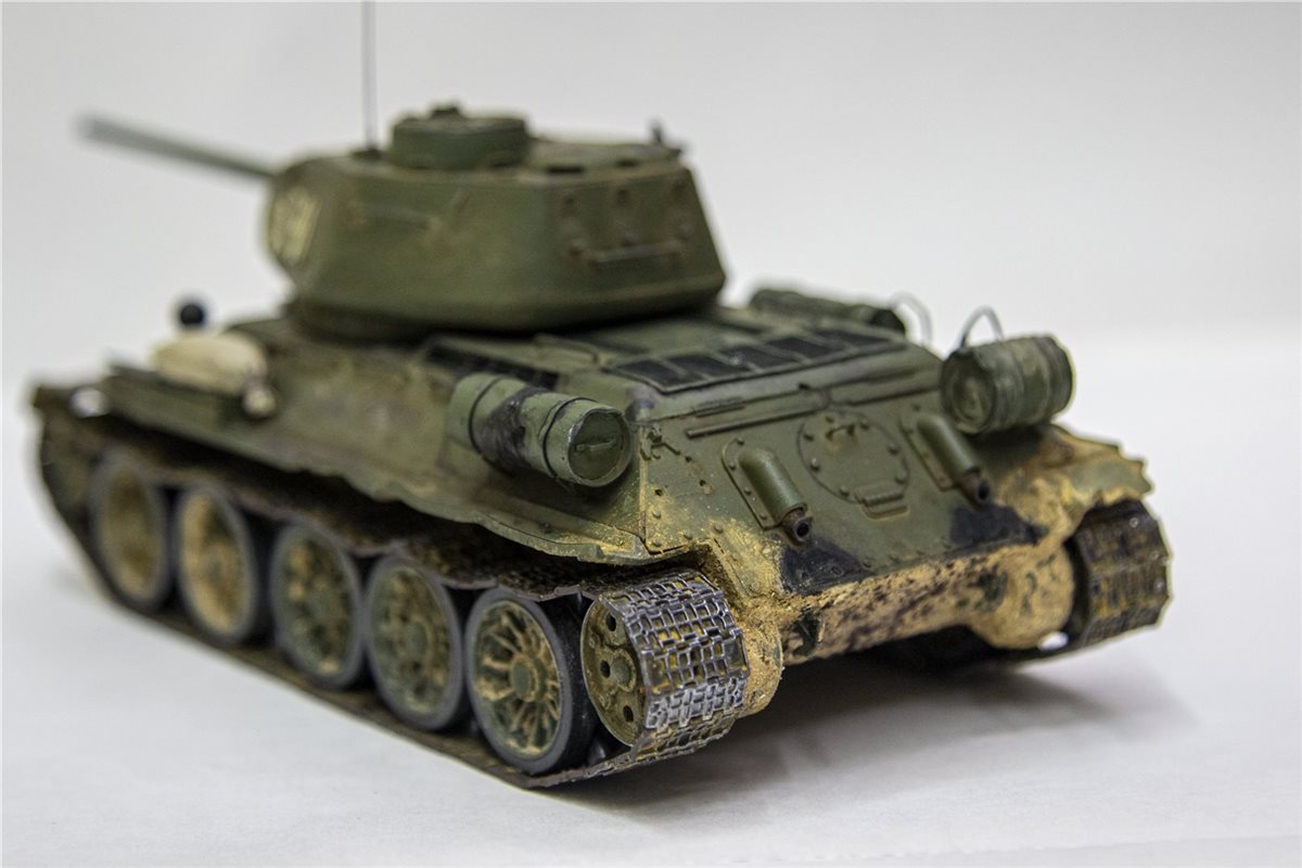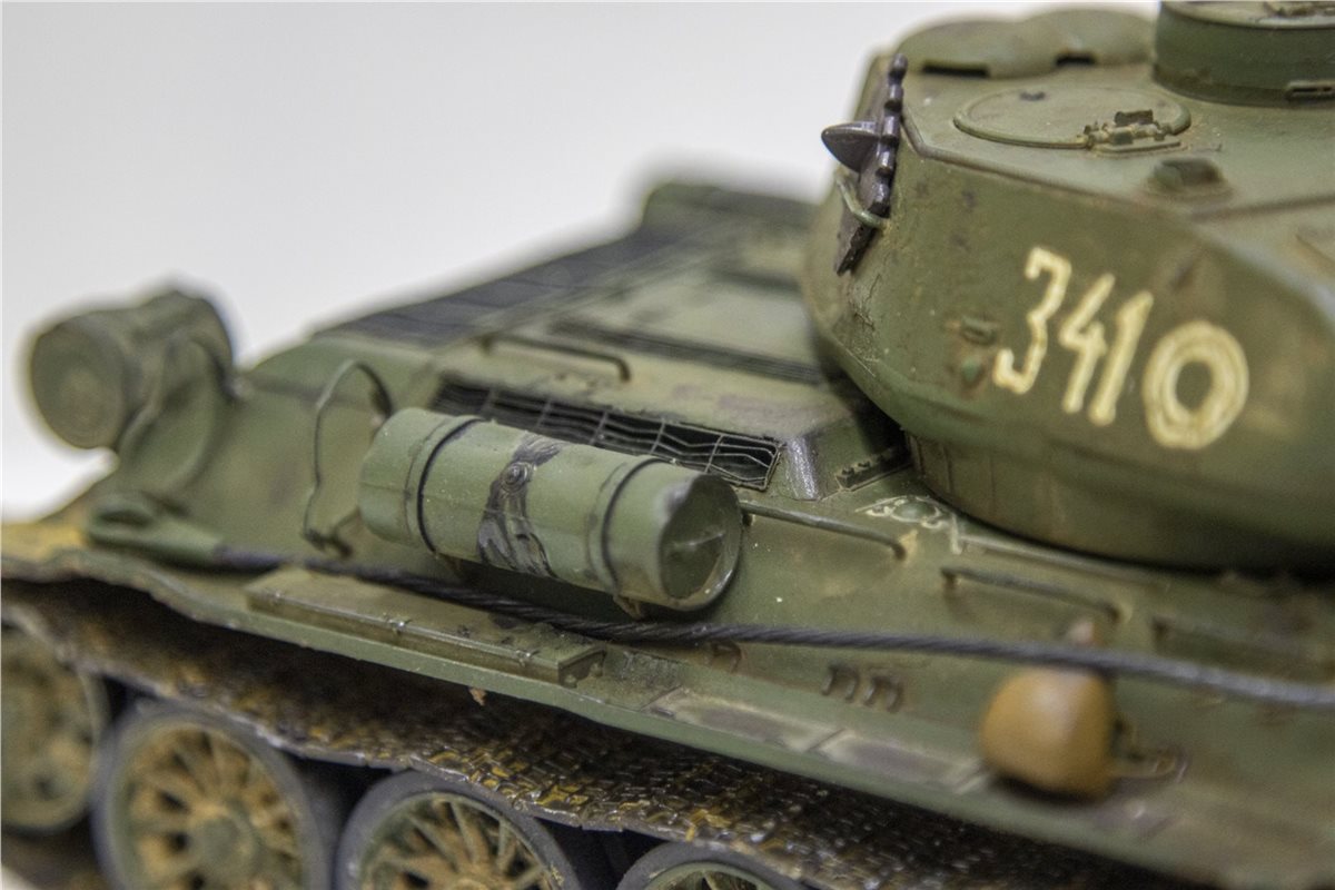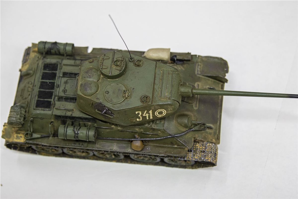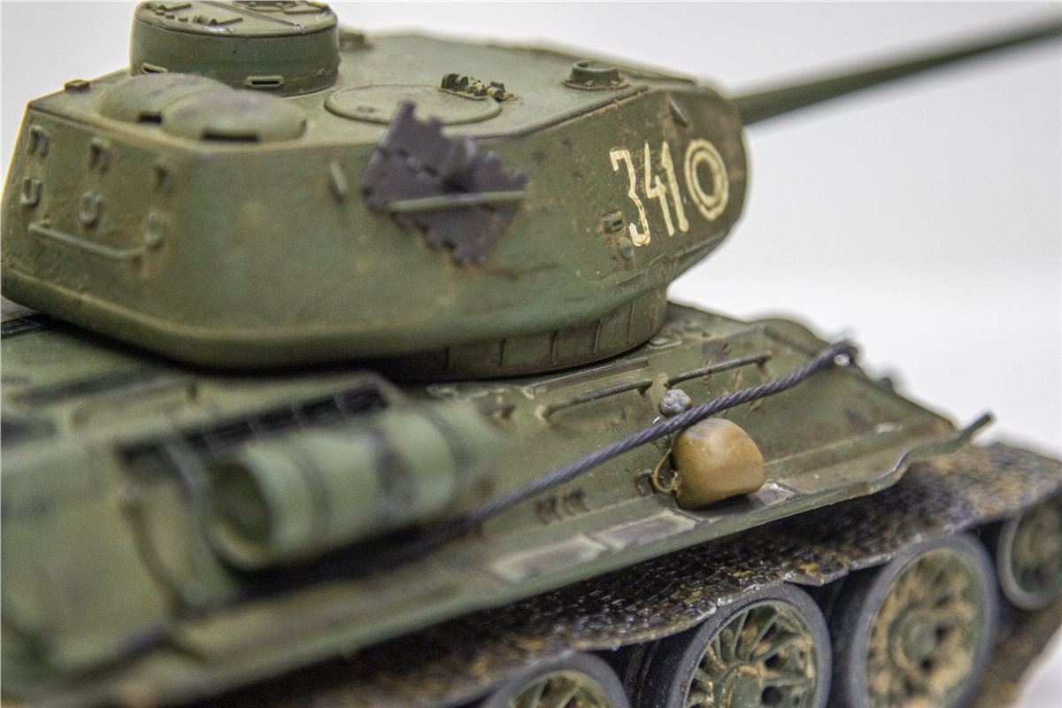 Танк Т-34-85 образца 1944 года. Масштаб 1/35. Фирма-производитель: ICМ. На модели были заменены пластиковые детали на металлические (фототравление) - решетка над отсеком МТО, 5 штук. крепление дополнительного топливного бака. Танковый трос так же заменен на металл. Башня вращается на 360 градусов. Внутри есть частичный интерьер ( в башне казенная часть орудия и пулемет, в корпусе танка - кресла механика-водителя и стрелка-радиста). Гусеницы наборные, катки заменены на более деталированные фирмы MINIART. Доработан ящик ЗиП (полуоткрытый), для придания реалистичности модель танка имеет боевые повреждения, сколы краски, ржавчину, потертости металла, вмятины, следы от рикошета снарядов и осколков, потёки ГСМ, на корме следы выхлопа, на оконечности орудия есть пороховой нагар. На правой надгусеничной полке добавлен мешок, на левой надгусеничной полке солдатский вещмешок. На днище и ходовой части выполнена имитация грязи, грунта и дорожной пыли. Модель танка имеет реальный исторический прототип Т-34-85 бортовой номер 341 из состава 3-ей гвардейской танковой армии 7-й гвардейский танковый корпус.
