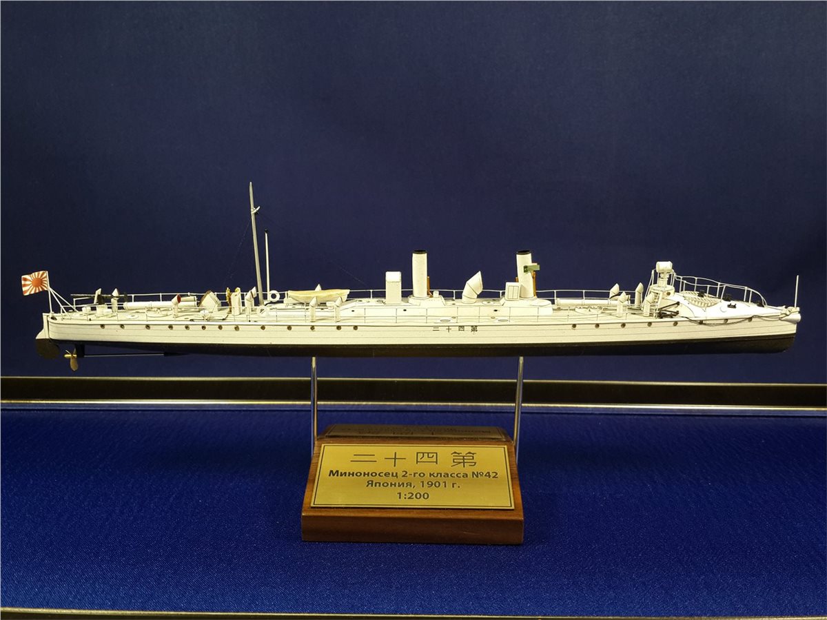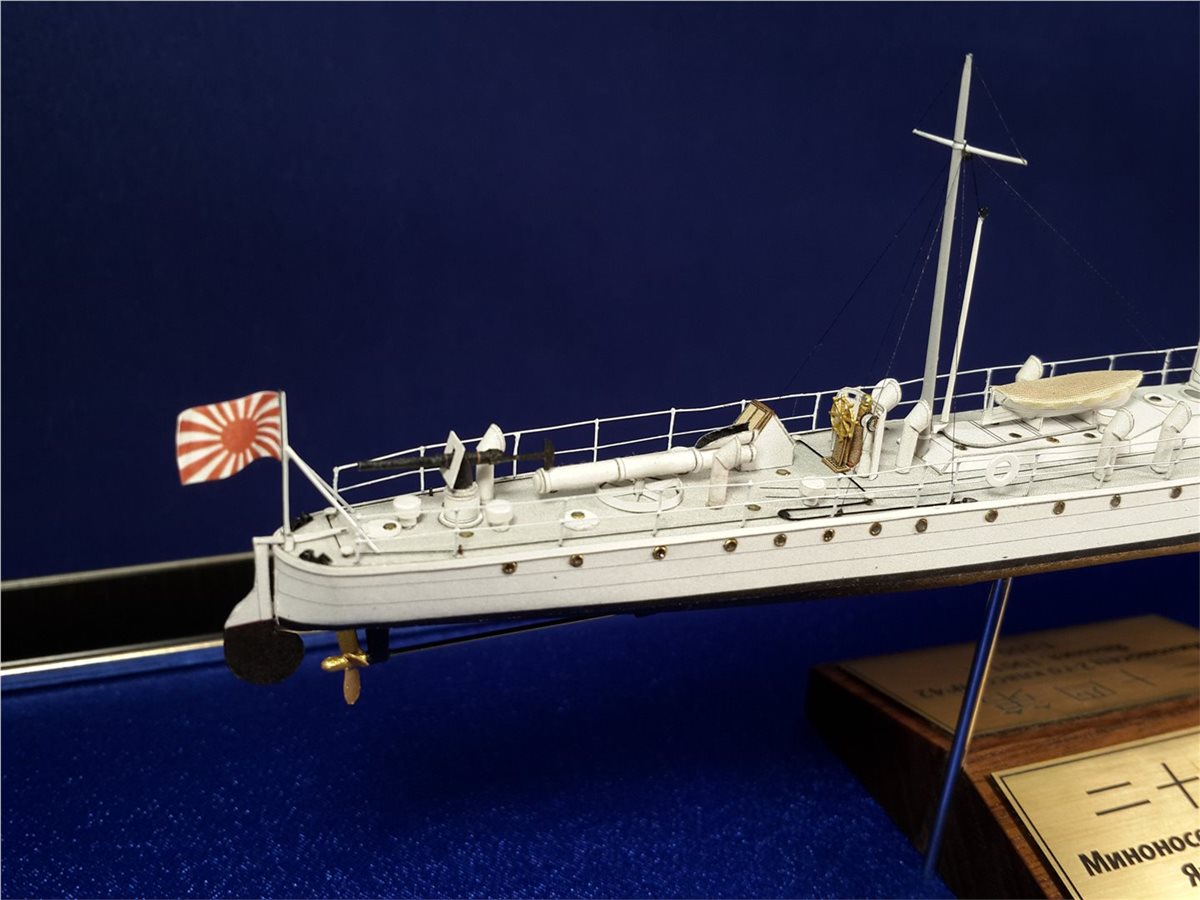 огрехи перенесены на модель, как давал их автор. Сходимость деталей на твёрдую 4. Про уровень сложности, скажу одно, если будете дорабатывать то можно здорово уйти от 2-го заявленного, но и смотрится он совсем по другому тогда. Длина миноносца получилась 23