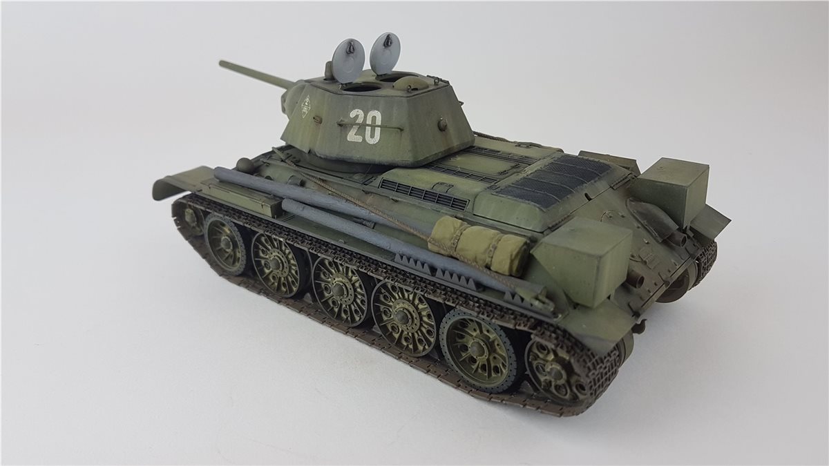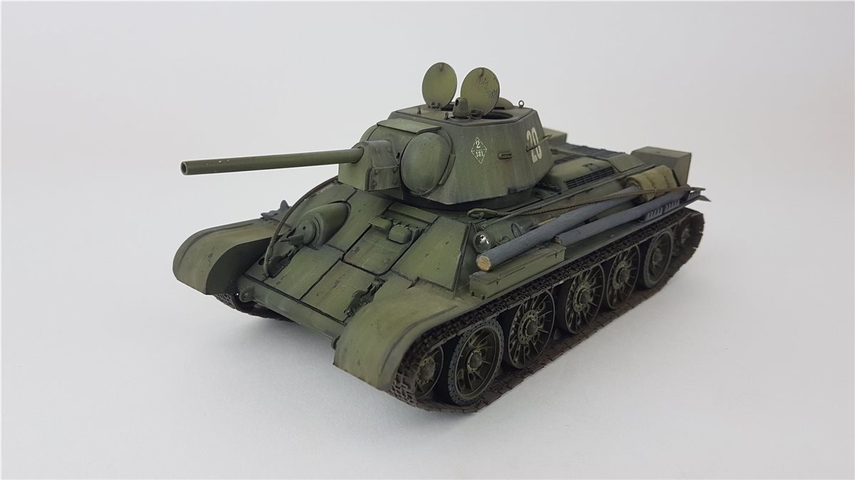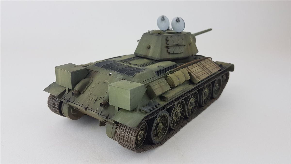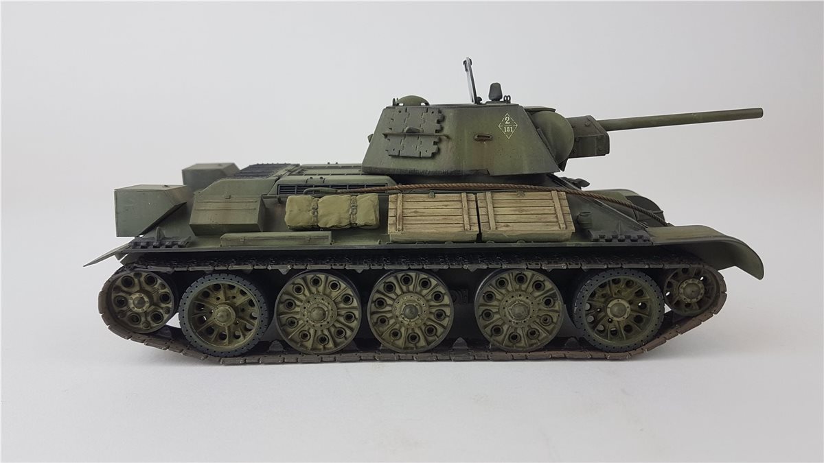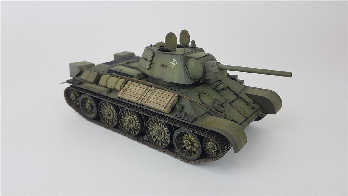 Т-34/76, 1943 года, Тамия. Использован лист доп. брони корпуса, входящий в комлект, но не использующийся при постройке по инструкции. Однако, Т-34/76 гайки с доп. броней были. Фото условного прототипа в галерее.
