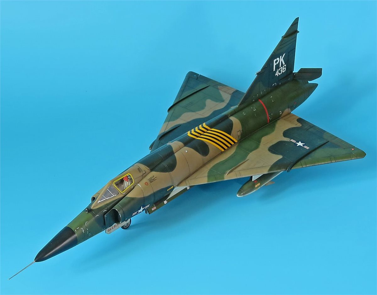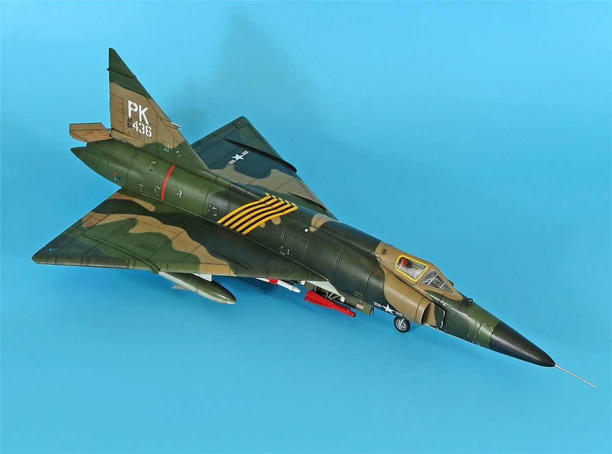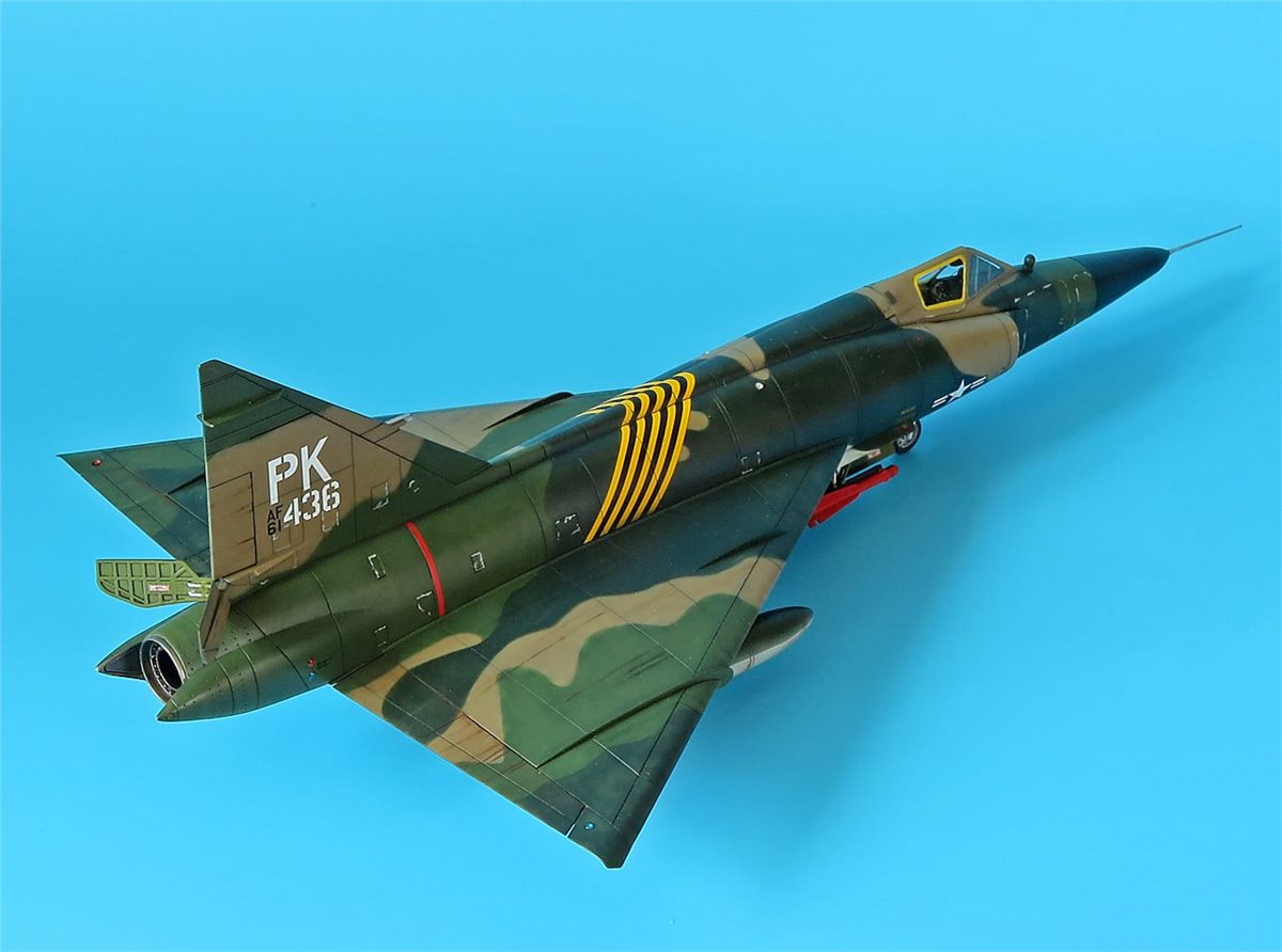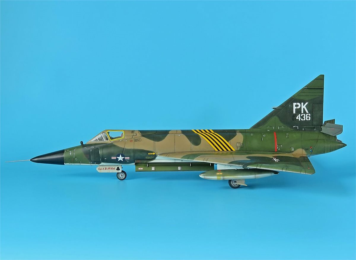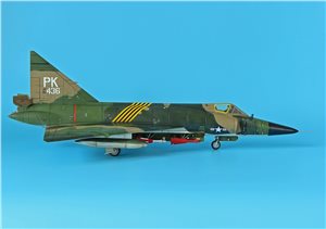 Дельта Даггер от фирмы Meng. Не скажу, что являюсь большим фанатом "сотой серии", но отдаю должное, что самолеты были очень интересные! В очередной раз перебирия свои запасы и рассматривая литники выбрал эту модель. Как мне показалось она будет не слишком сложной в сборке (в общем-то оно так и оказалось). Далее надо было выбрать прототип, решил остановиться на камуфляжном варианте, более редким для этого типа самолетов. Поэтому прототипом послужил самолет из состава 509 эскадрильи перехватчиков, база Udorn, Таиланд 1969 год. Сборка действительно не доставила особых проблем, отсек вооружения решил делать открытым, т.к. на мой взгляд это важная отличительная черта этого самолета. Кое-что по мелочи доработал, но это скорей косметика. Когда была собрана "тушка" был поражен размером, особенно с учетом того, что самолет однодвигательный!