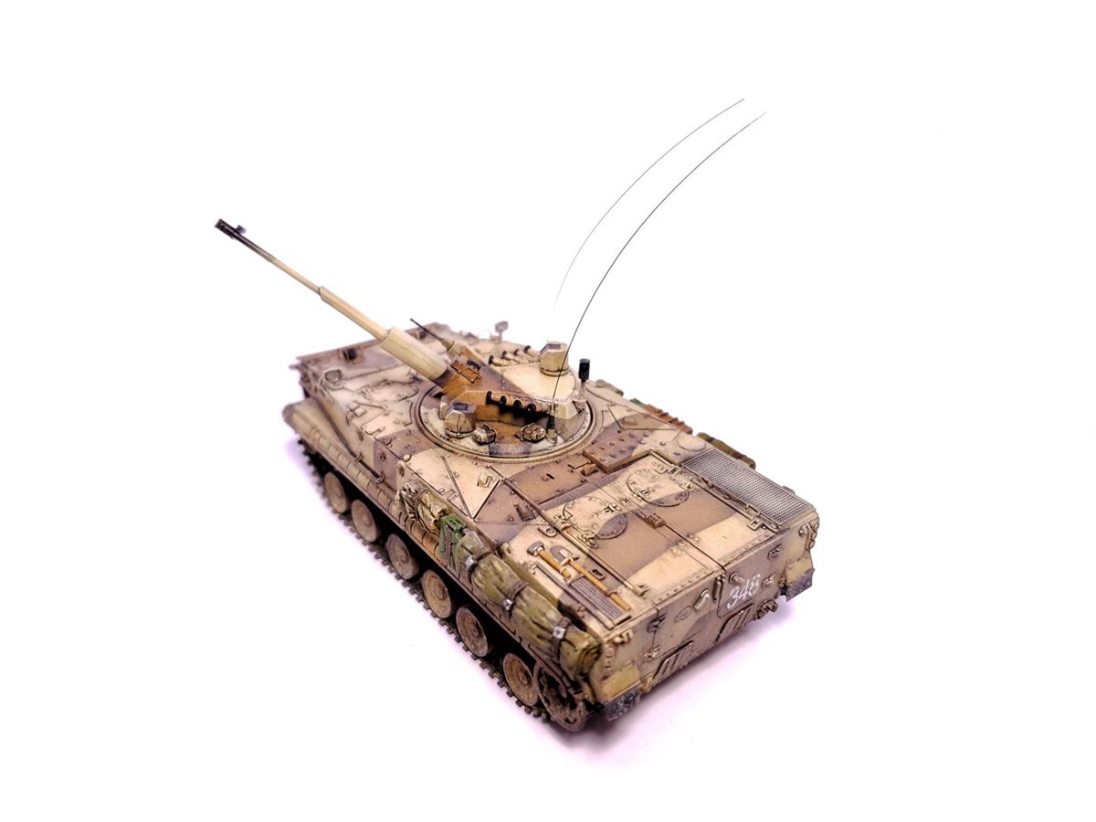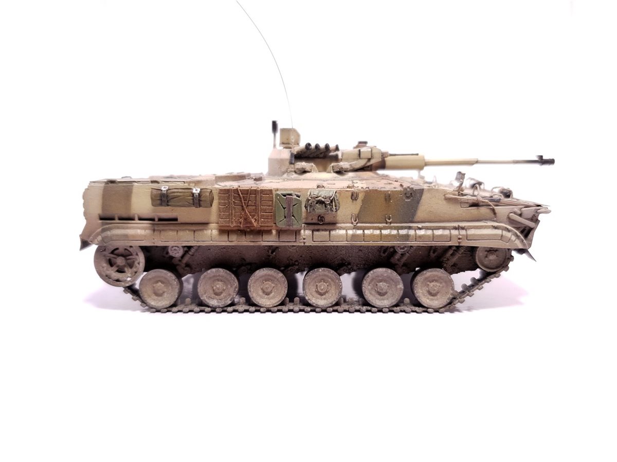 В качестве базы взял один из наборов БМП-3 от ModelCollect, изнчально хотел вариант с решетками для антуража, но набор пришлось бы ждать долго. Сразу к модели заказал на форуме у Димок73 точеный ствол, пулемет и "Тучи". Сначала поставил смоляные "Тучи", но потом заменил на точеные. Позже добавил антенные вводы от Zedval. Долго мучился с антеннами, в итоге сделал из двойной бисерной иглы. В процессе добавил смоляные канистры, сумки, скатки и ящик от Golikov Project и Таран'а. Из проволоки сделал защиту для фар и дополнительные крепления для обвесов на корпусе, а так же защиту для курсовых пулеметов. Камуфляж сделал из головы из серии "What if?".