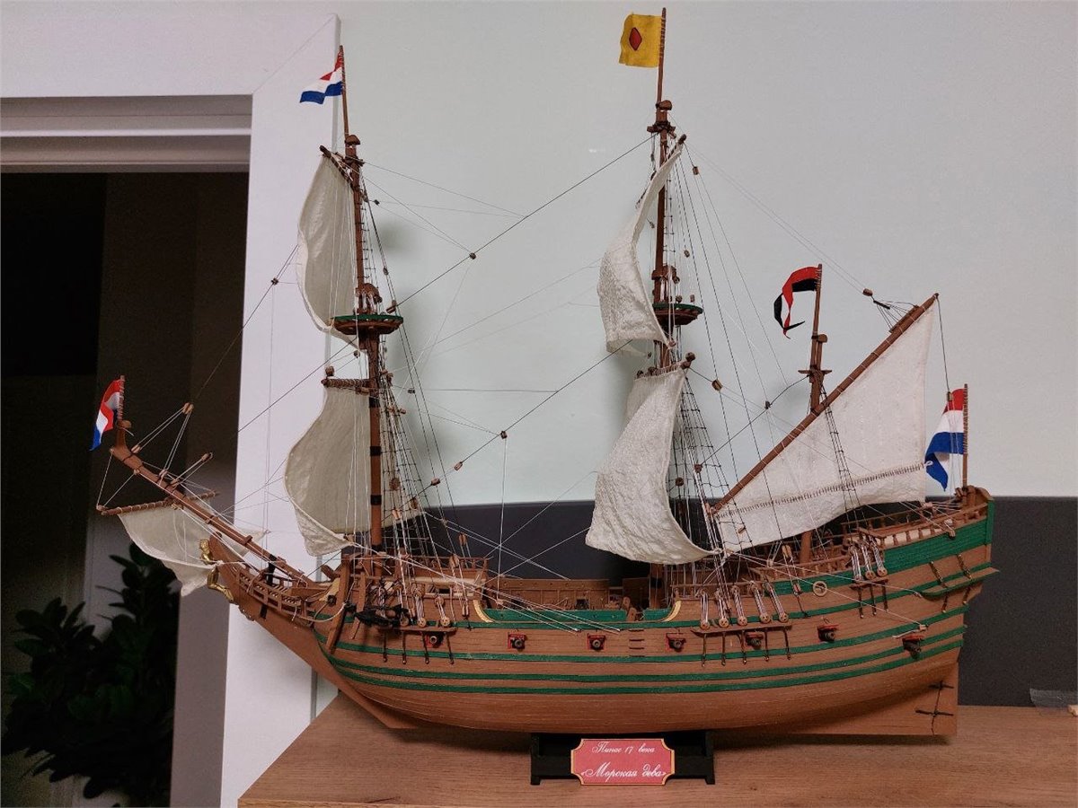 Представленная модель пинаса "Морская дева" относится ко второй половине 17-ого века с традиционным для того времени корпуском, парусным вооружением и раскраской голландской корабельной школы.