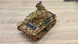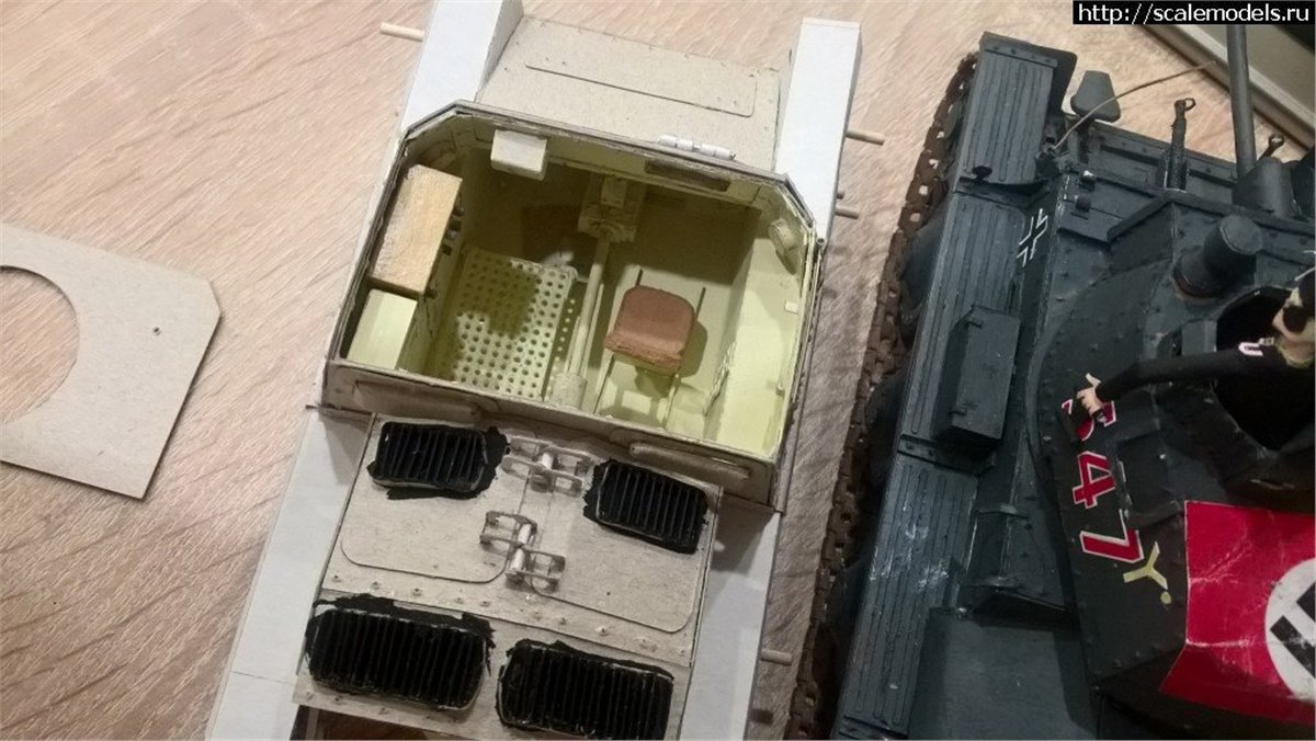 Танк собран по чертежам собственной разработки на основании чертежей и фотографий, имеет полный интерьер, подвижные крышки бронелюков. В те времена я активно экспериментировал с бумагопластикой, поэтому у танка есть экипаж)))