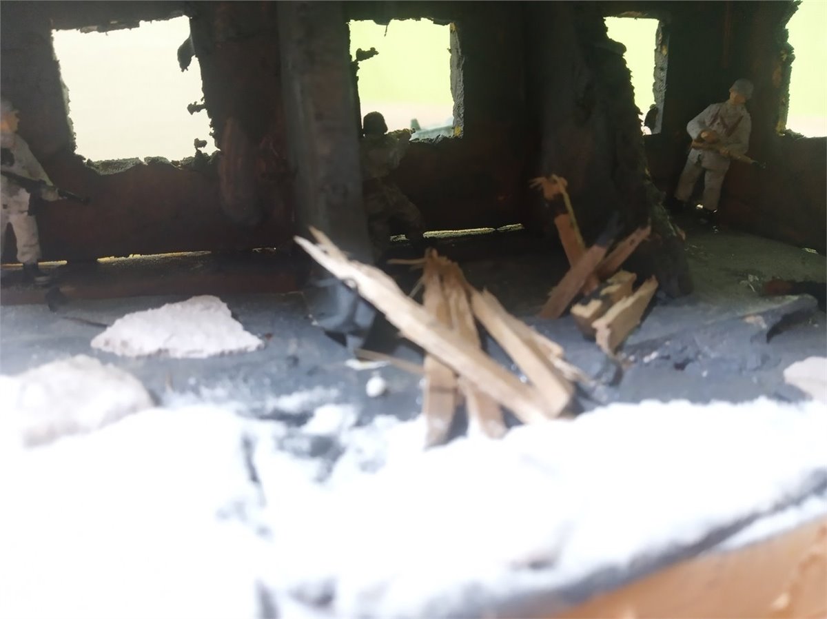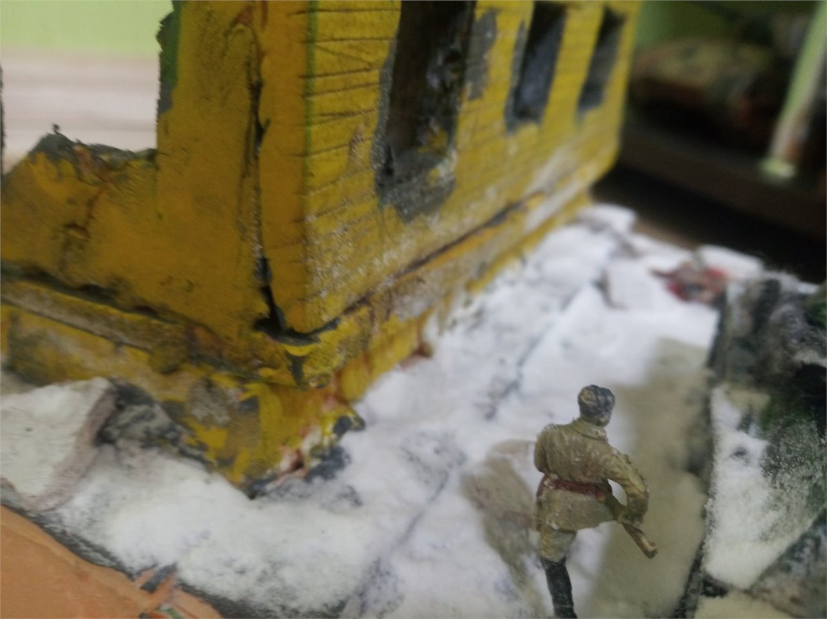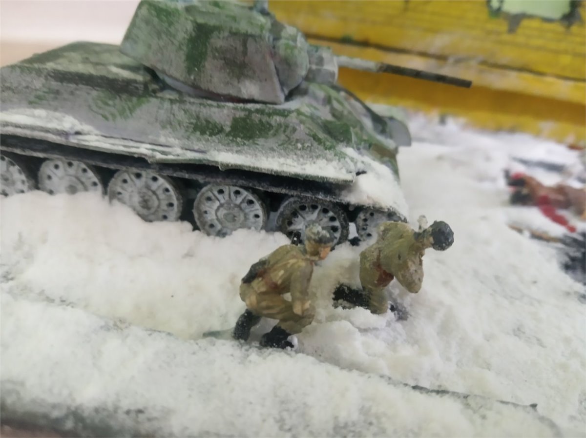 На макете изображена Ржевская мясорубка,где потери советский войск составили 290.000 человек, а немецких солдат составило 16 дивизий (198.000 человек приблизительно).на самой же диораме показано как советские войска попали в немецкую засаду,где и происходит