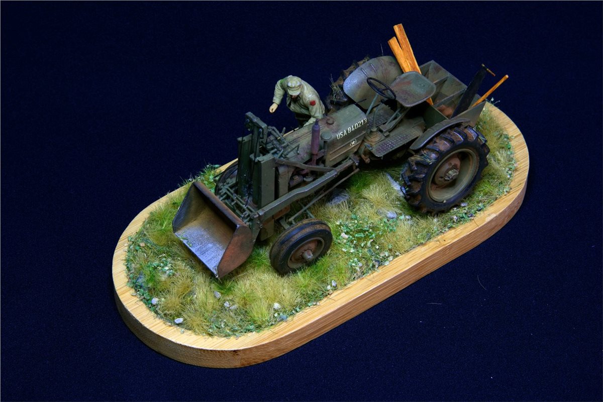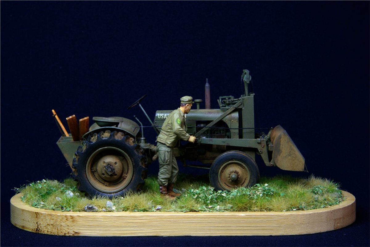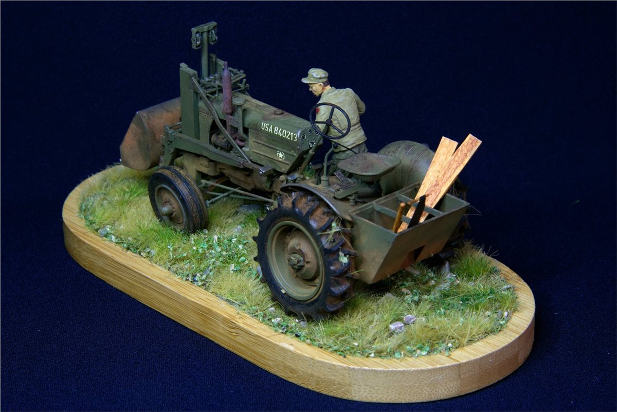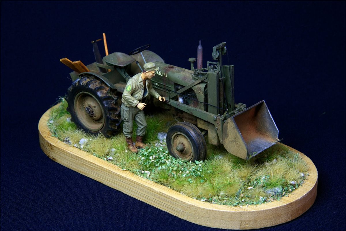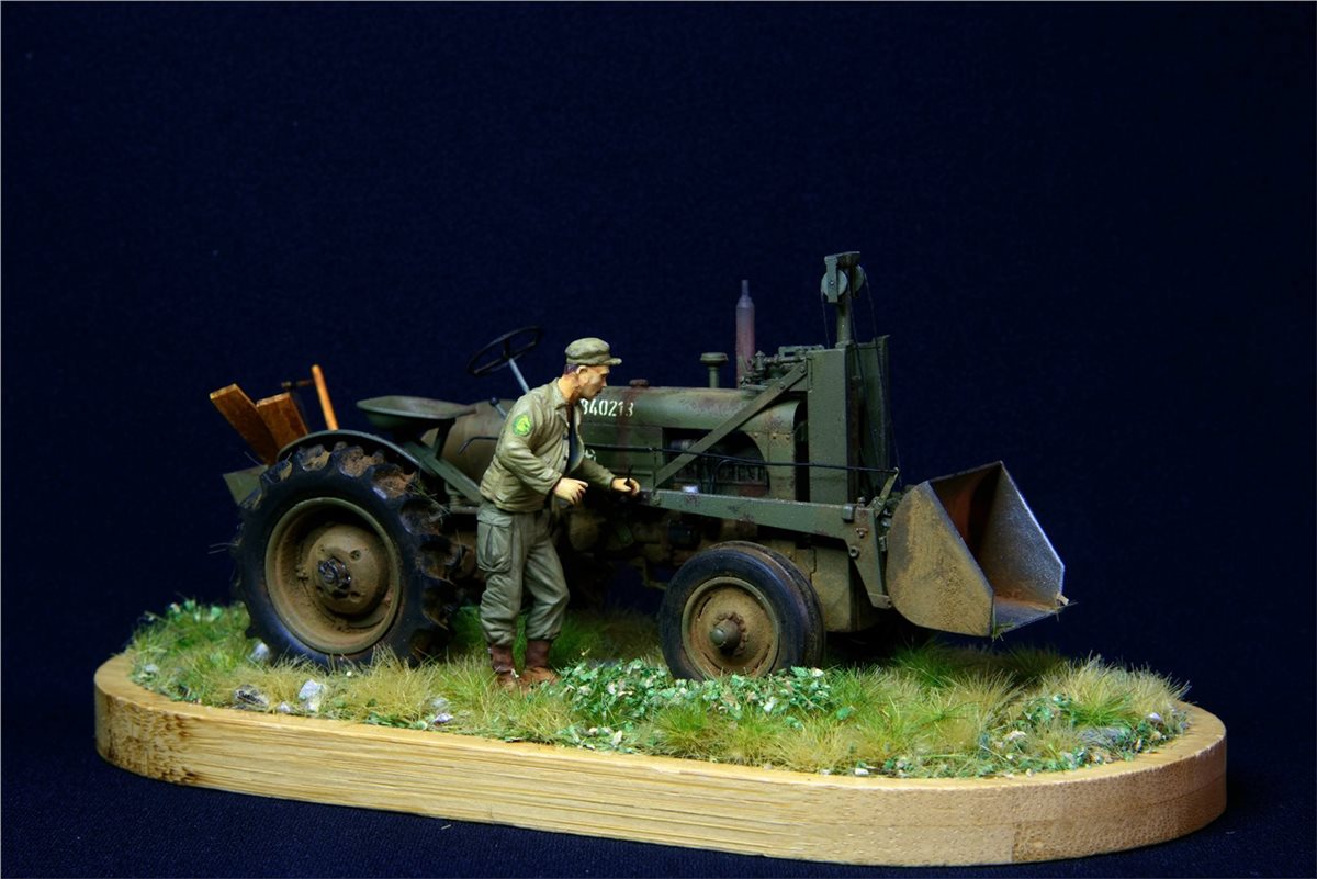 Модель довольно известная, по сборке никаких замечаний. Небольшие доработки по двигателю, переделал глушитель, накидал барахла в кузов. Водитель из набора MiniArt. Основание - готовый мат ( не помню какого производителя) Окрас - Vallejo, пигменты, масло.По задумке: остановился он на полянке и решил чего-то там подкрутить :)