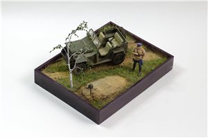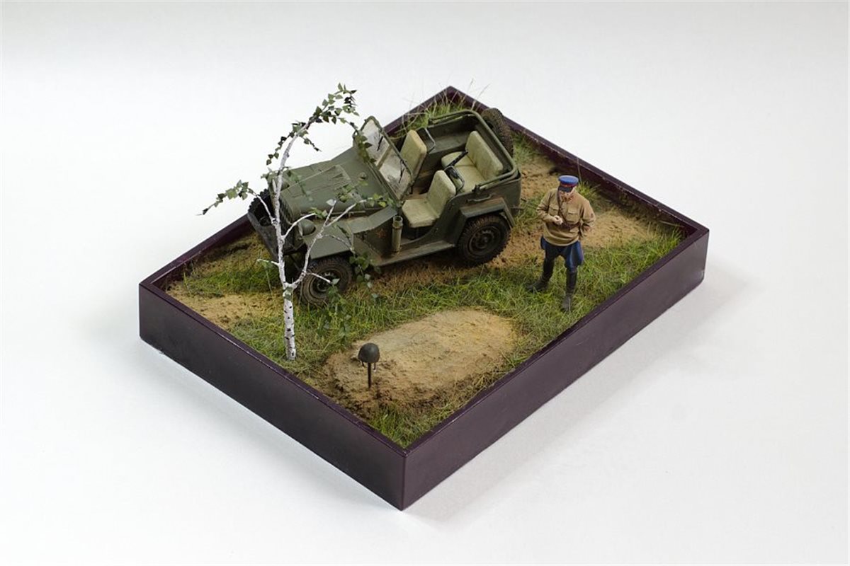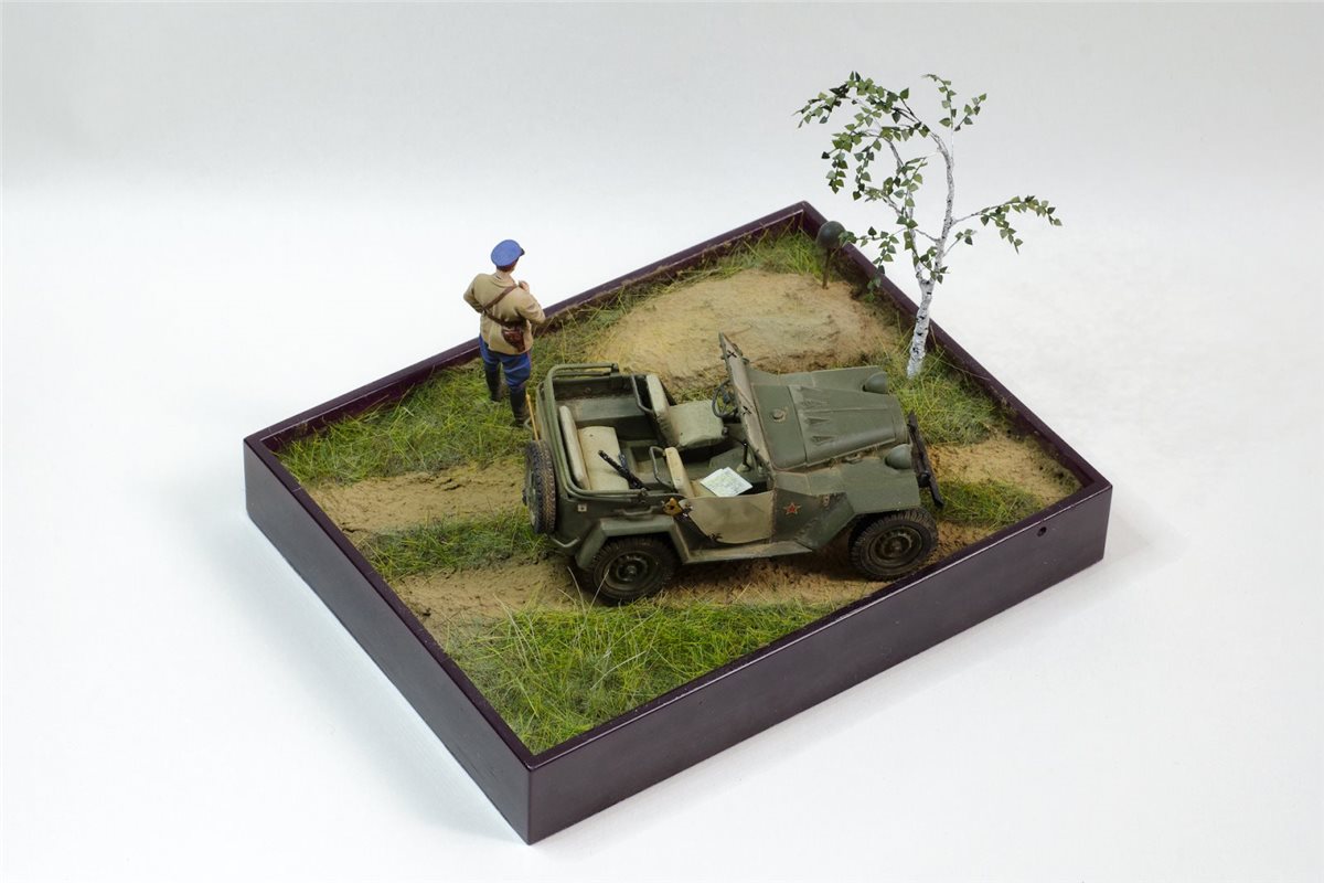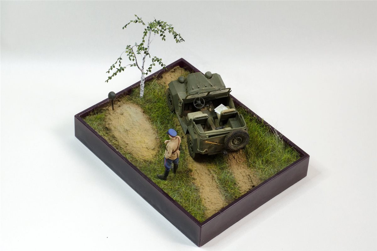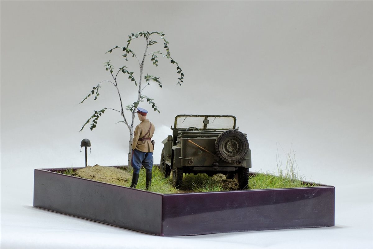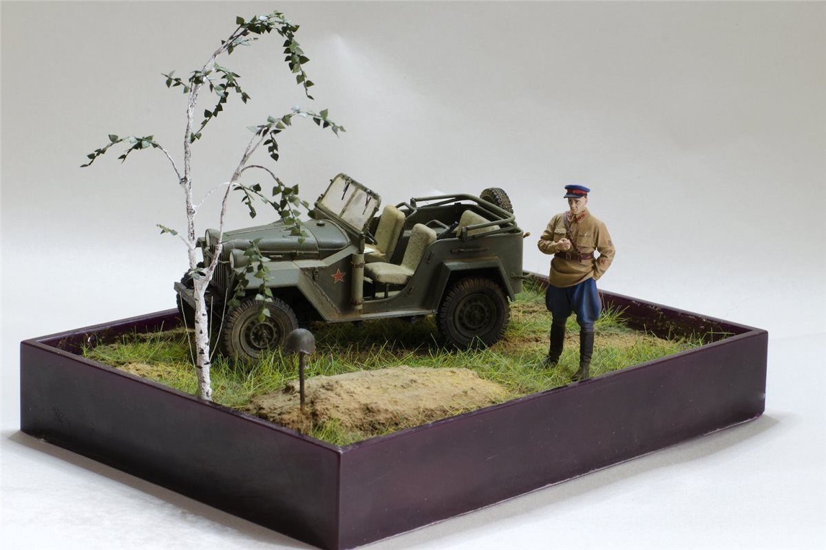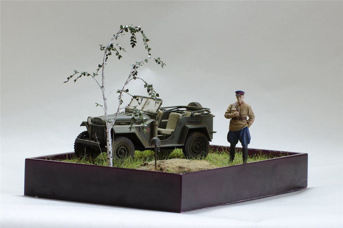 ГАЗ-67Б от Trumpeter с травлением Eduard, смоляная фигура офицера НКВД по всей вероятности от Tank, берёза из проволоки, листья ModelScene. Красил Valejo,фигуру темперой ПВА, попробовал пигменты и текстурную пасту ZiPMaket.