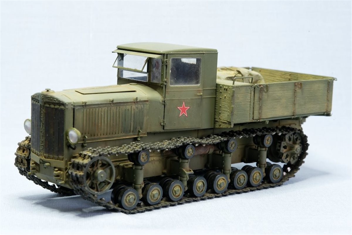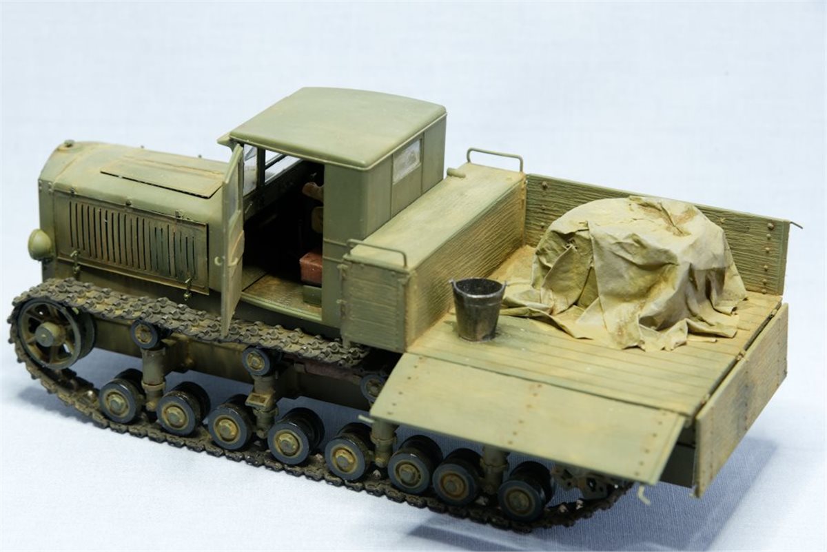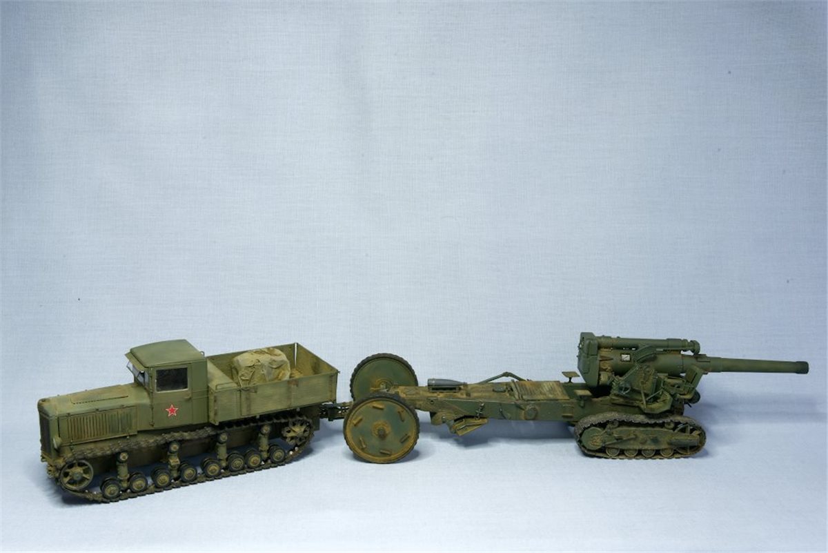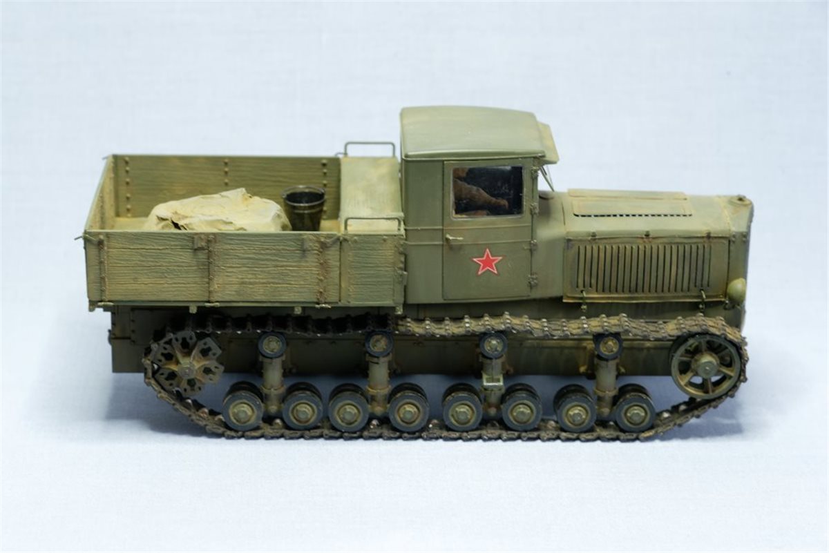 Собирал его специально для гаубицы Б-4. Сильно в матчасть не вдавался, но кое-что поменял: капот с поздними створками от VoyagerModel, петли рабочие из того-же набора, траки металл от Master Club, пересадил водителя ( от Miniart) на правильную сторону, переставил глушитель, скамейки из кузова решил убрать ( что-бы не как у всех), ведро - травление от "Микродизайна", брезент - обёрточная бумага. Окрас, как обычно: Vallejo, художественные масло и пастель, пигменты Wilder.