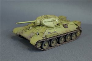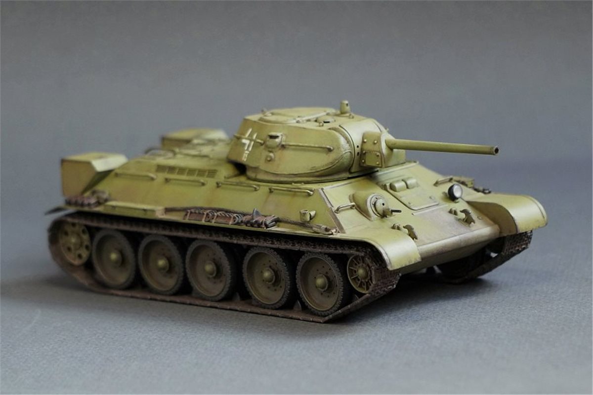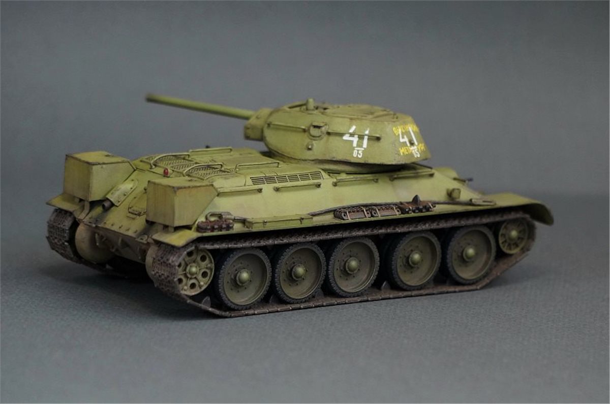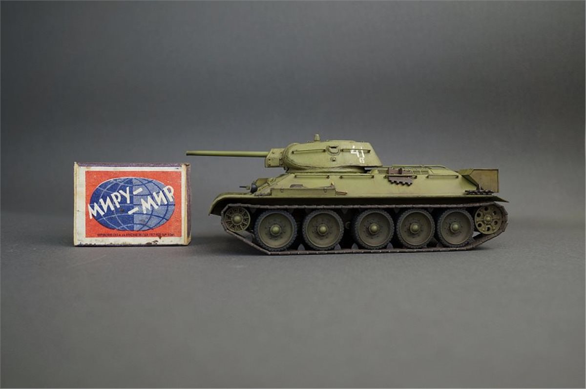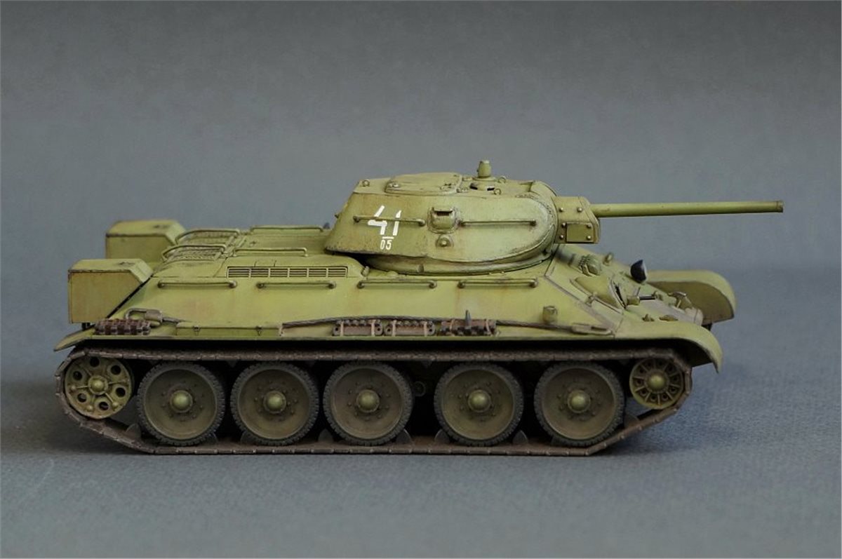Прототипом данной модели был выбран танк из колонны "Выксунский Металлург", построенной на средства, собранные коллективом Выксунского металлургического завода. 13 апреля 1943 года на горьковском заводе "Красное Сормово" состоялась торжественная передача колонны представителям 186-й танковой бригады. Танки эти прошли славный боевой путь, воевали на Курской дуге, участвовали в боях за освобождение Белгорода, Харькова, форсировании Днепра. Модель позиционируется как модификация 1941 года, но насколько я могу судить по матчасти, это скорее зима 1942 - весна 1943. Производитель что-то намудрил с кормовым листом башни - он сделан съемным, но без крепежных болтов, да и к тому же значительно утоплен вглубь башни. Пришлось повозиться со шпатлевкой и восстановлением "литой" текстуры. В сборке использовались некоторые "запчасти" от хоббиБоссовской тридцатьчетверки и металлический ствол от RB Model. Задний габаритный фонарь представлял из себя одну сплошную утяжину, заменил его на выточенный из красной прозрачной шпажки. Добавил металлический трос и ствол пулемета из инъекционной иглы. Покраска - акрил и лаки Tamiya (очередная попытка намешать 4БО из тамиевских цветов), худ. масло, пигменты. Из явных недостатков модели могу отметить серебрение декалей при некоторых ракурсах, видимо сказалась неровность "литой" текстуры башни, хотя приваривал как всегда МаркФитом на глянцевый лак. Еще одна проблема возникла при сборке ходовой: гусеницы ни в какую не желали нормально стыковаться и садиться на задние ведущие катки, вплоть до того, что пришлось подрезать ролики внутри этих