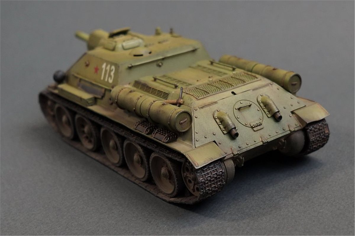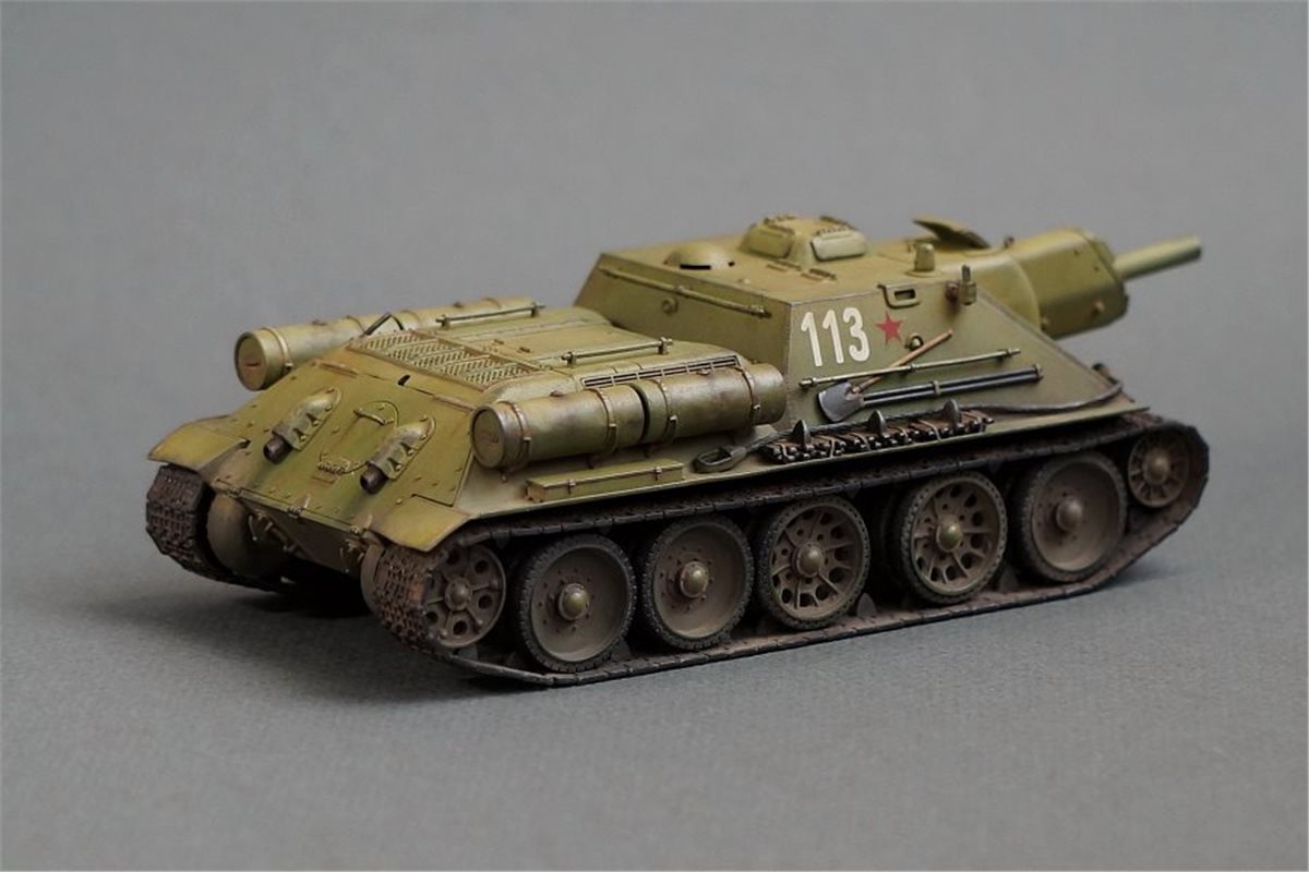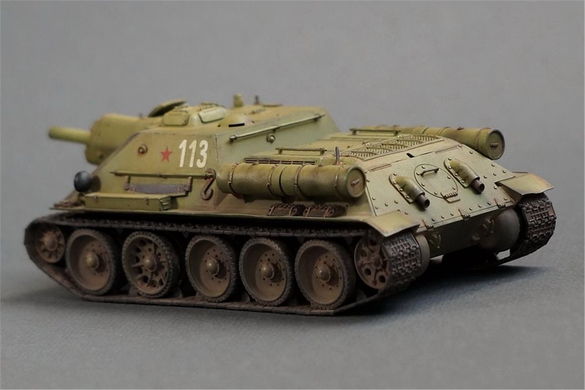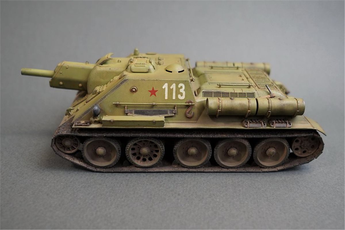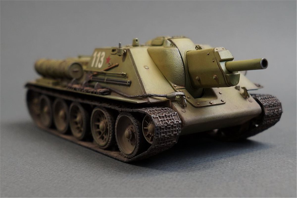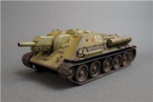 Модель самоходной артиллерийской установки СУ-122 от фирмы Тамия в масштабе 1:48. Сама по себе модель собирается приятно и достаточно легко, утяжин и облоя нет. Правда, "изкоробочная" версия мне показалась скучноватой, поэтому при сборке были использованы некоторые детали от Т-34-76 производства ХоббиБосс, а именно: крышка МТО с травленой сеткой, литые катки раннего типа, ящики ЗИП, фара и шанец. Также был добавлен металлический трос, проволочная ручка-скоба на лючке в заднем броневом листе и ремни крепления запасных траков. Проблема возникла во время установки гусениц, на них есть щели между траками под задними брызговиками. Красил модель акрилом от Тамии, базу 4БО мешал из XF-4 и XF-58 1:1, высветлял добавлением в базовый цвет темно-желтого XF-60. Фильтр и смывки Pacific88, пигменты Wilder, художественное масло.