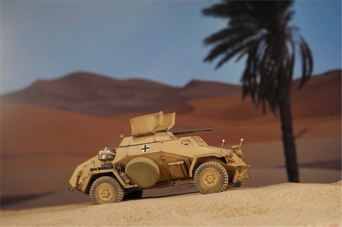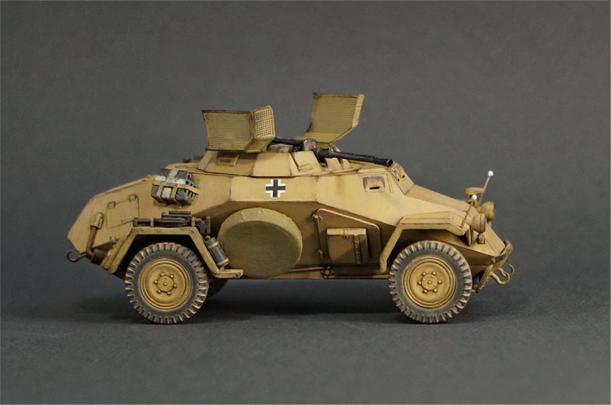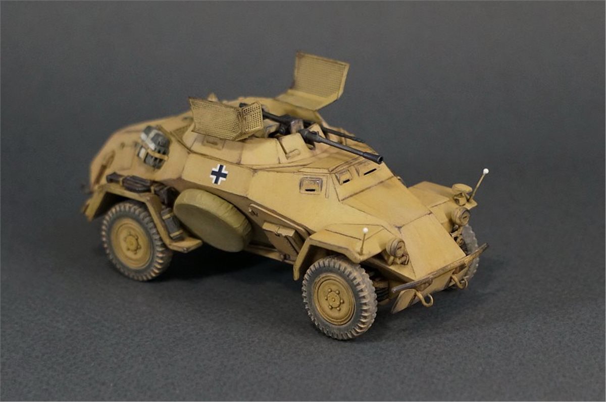 Модель немецкого бронеавтомобиля Sd.Kfz.222 от фирмы ICM в масштабе 1:48. Модель довольно приятная в сборке, хотя и имеет много упрощений детализации и из коробки смотрится бедно и пусто. Поэтому при постройке использовал много всяческой мелочевки и кое-какое