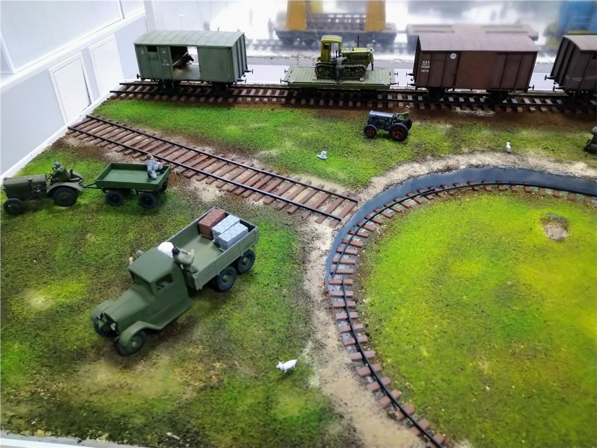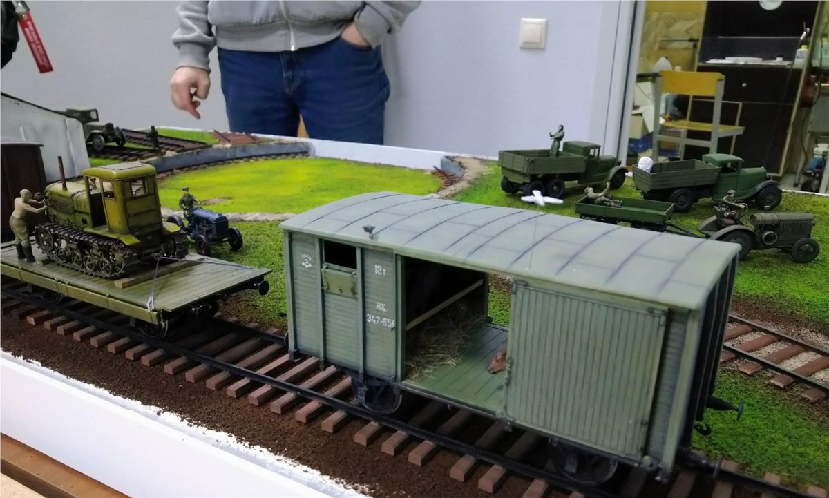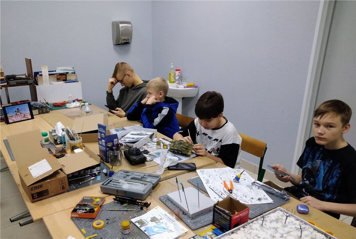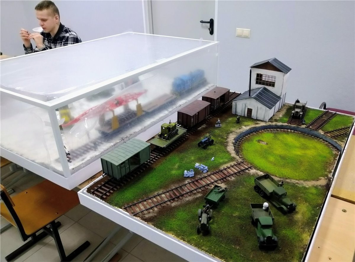 Разместили пути в депо, и в первом приближении расположили технику, людей, зверей и птиц.Юноши красили и клеили свои проекты.