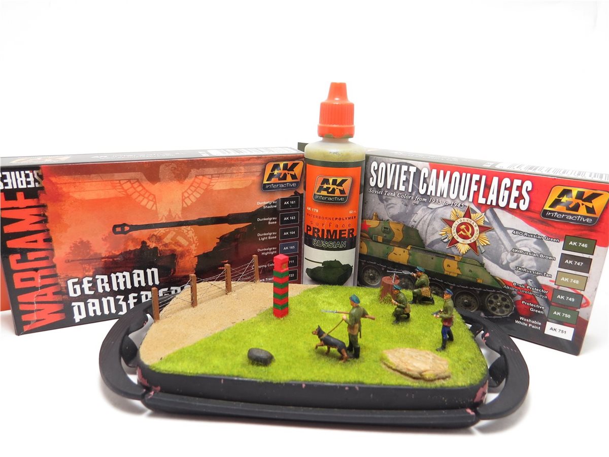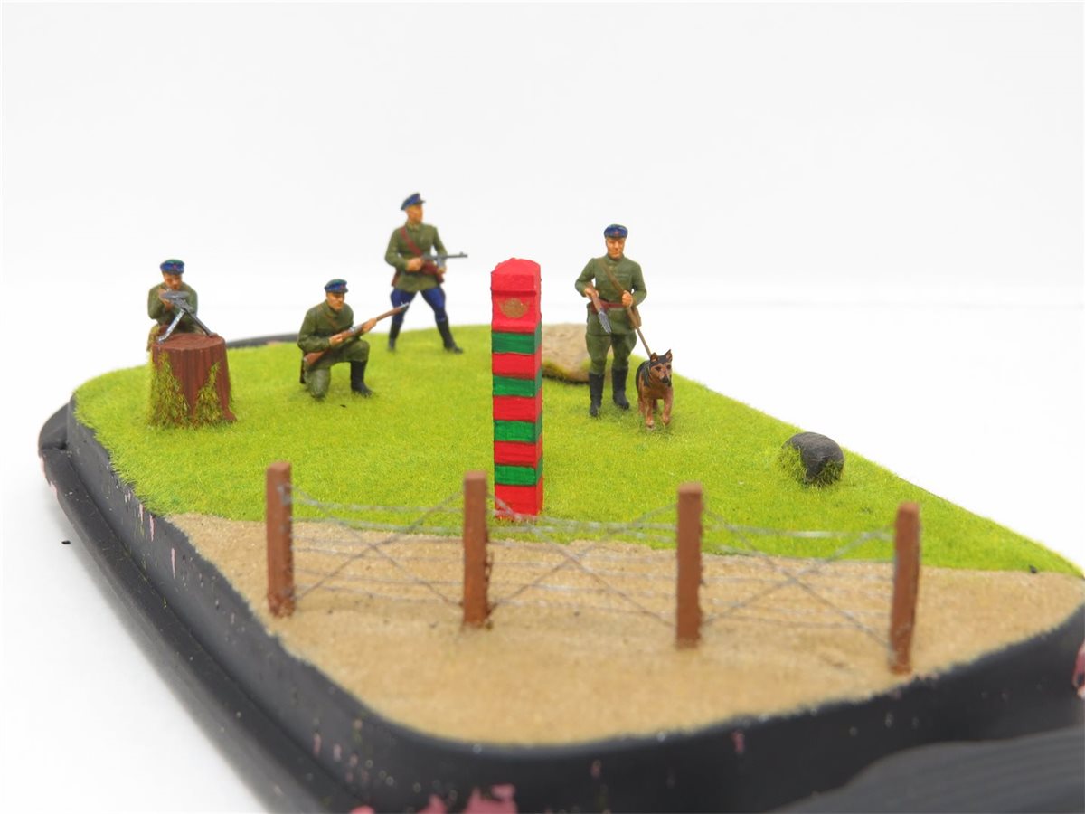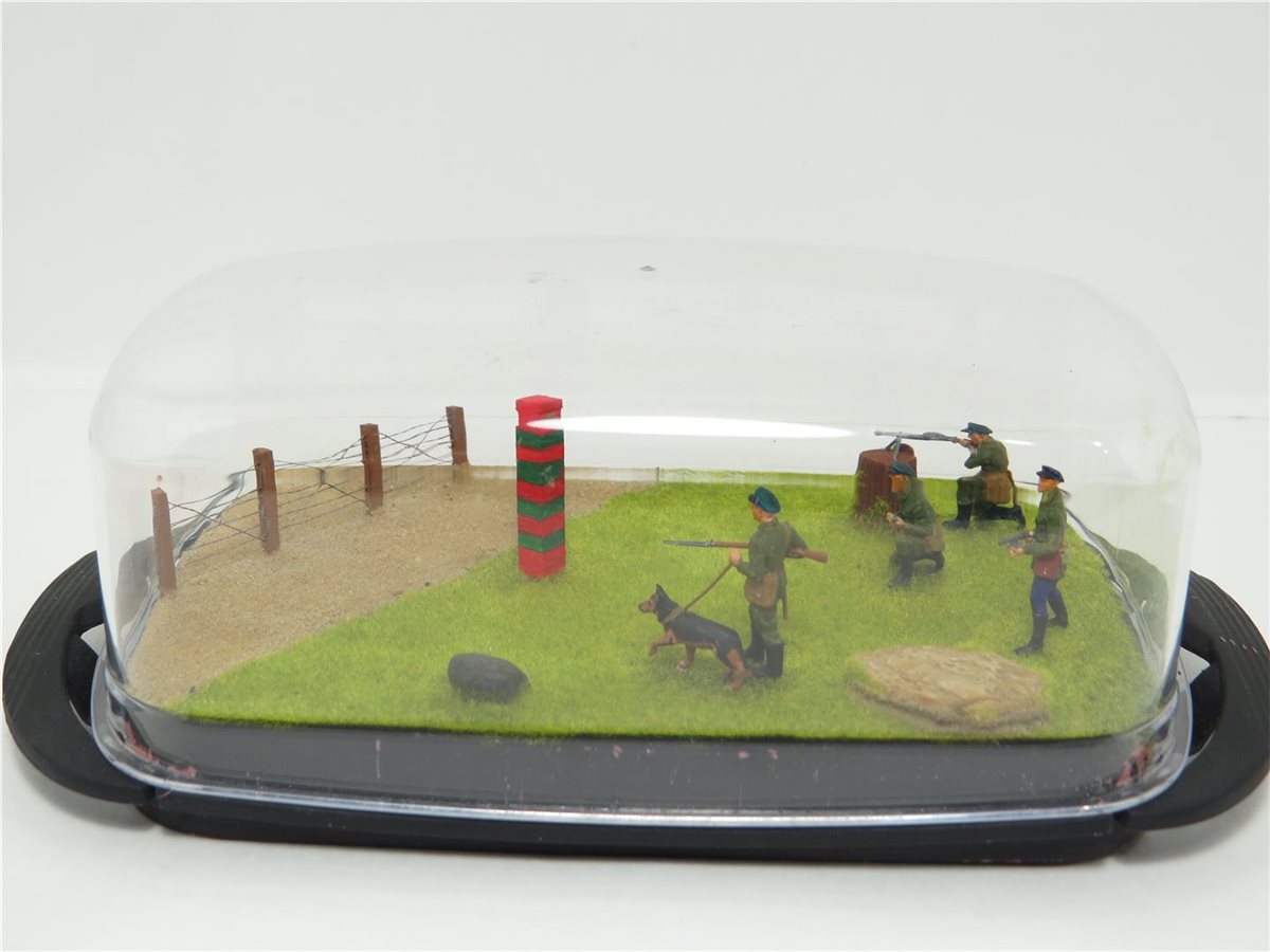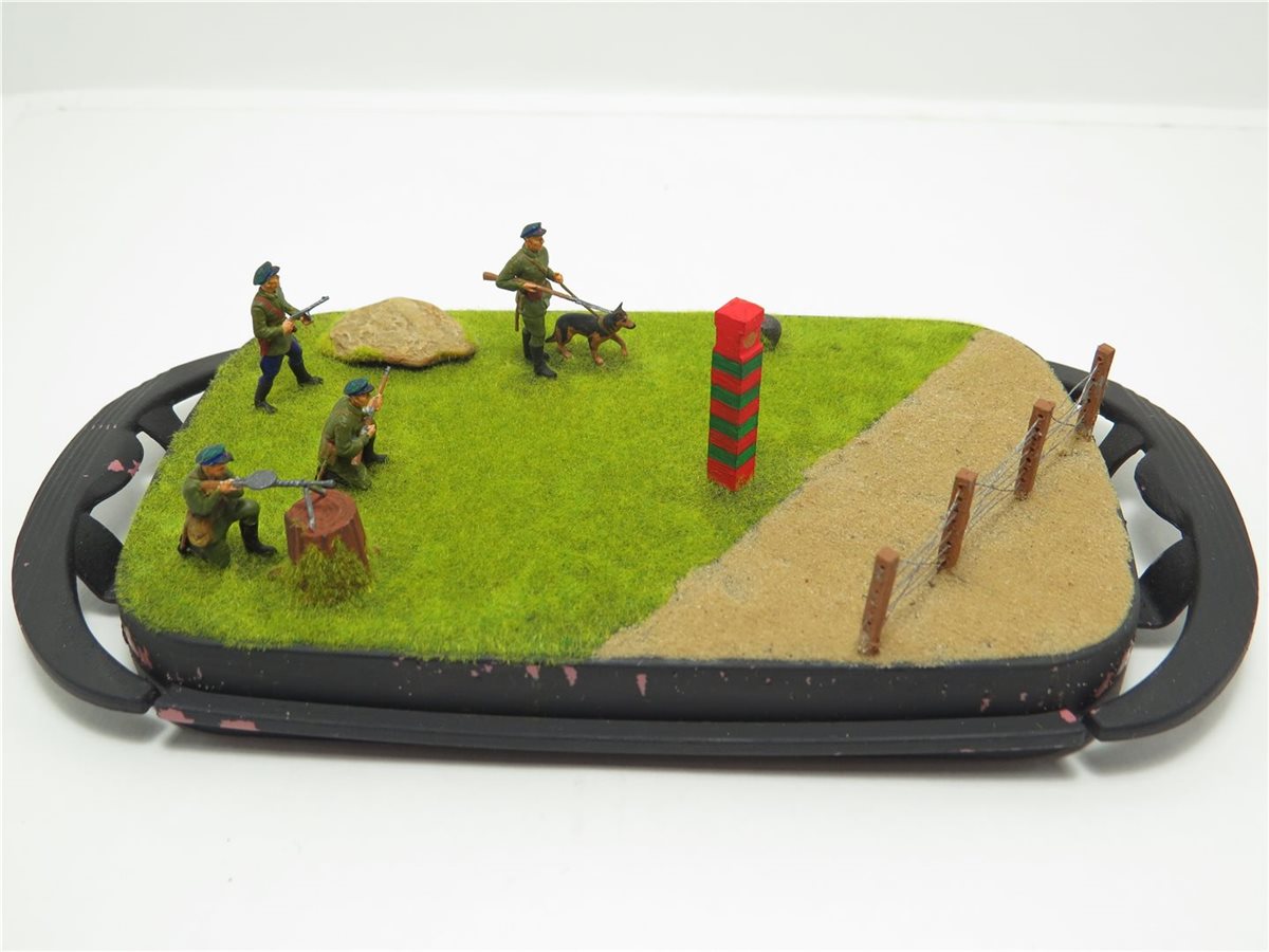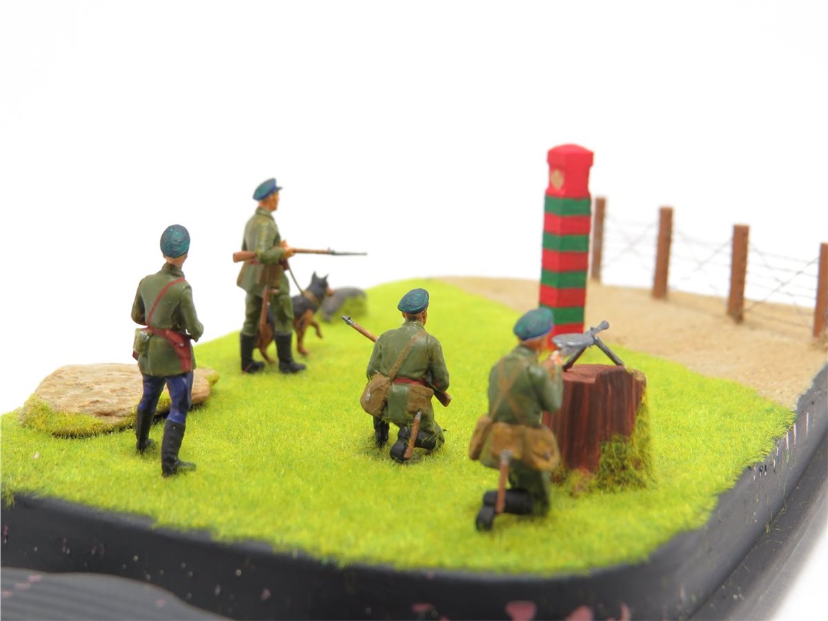 Советские пограничники в 1941 году первые приняли на себя удар немецко-фашистких захватчиков. В работе использовался набор фирмы "Звезда", подставка, она же короб из маслёнки. Дополнительно сделал пограничный столб деревянный. Забор сделан из спичек высотой 15мм. с восемью отверстиями, через которые пропущена скрученная вдвое тонкая проволока из маленьких наушников. Трава сделана флоком. Песок и камни оригинал. Расписывал красками Pacific и художественным акрилом.