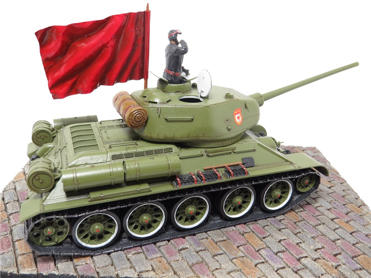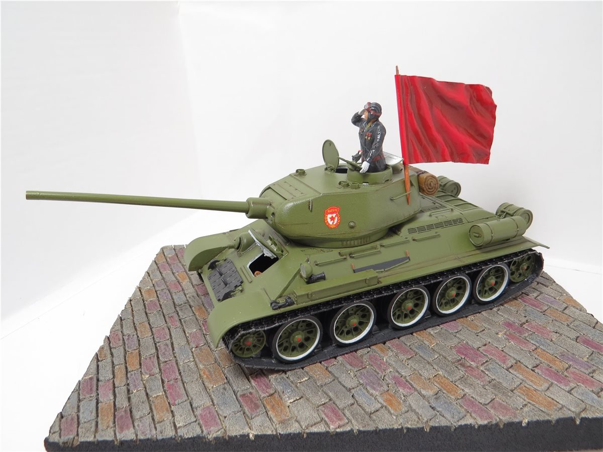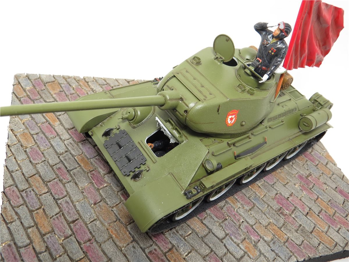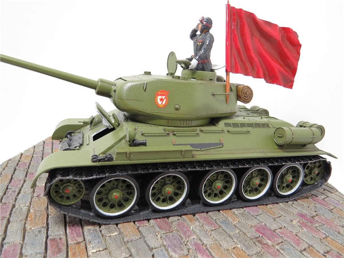 Легендарный танк победы Т-34/85 обр. 1944 года. Идея и желание сделать легендарный танк Т-34/85 в парадном варианте была всегда, так как любимый танк с детства. В постройке данной модели использовались наборы фирмы "Звезда": Танк Т-34/85; Механик водитель - набор "Советские танкисты"; Командир танка набор - "Российские современные танкисты в парадной форме". Основание работы сделано из пеноплекса с имитацией брусчатки. Знамя сделано из пищевой толстой фольги и зубочистки. Знак "Гвардия" взят из набора "ЗИС-5В". Для танка, фигур и знамени использовал 759 грунт PRIMER фирмы AK Interactive. Краски для танка использовал Mr.Hobby 511 "4BO", а для фигур и знамени краску Pacific. Смывку делал сам из художественных масленых красок и уайт-спирита Tikkurila. Использовал глянцевый и матовый лак фирмы Tamiya. Брусчатка покрашена с помощью художественных акриловых красок и акварельных карандашей.