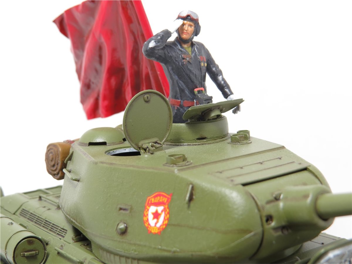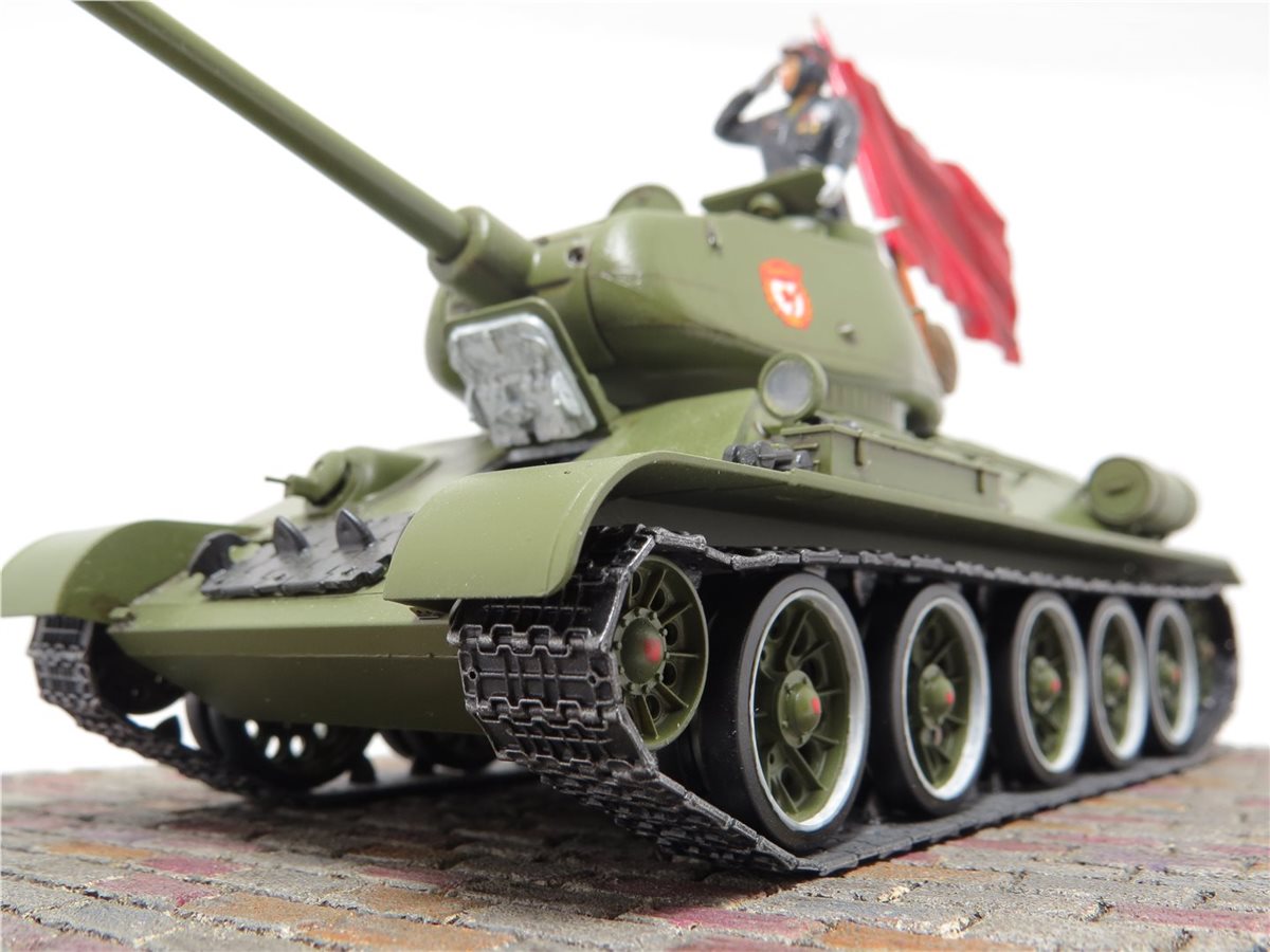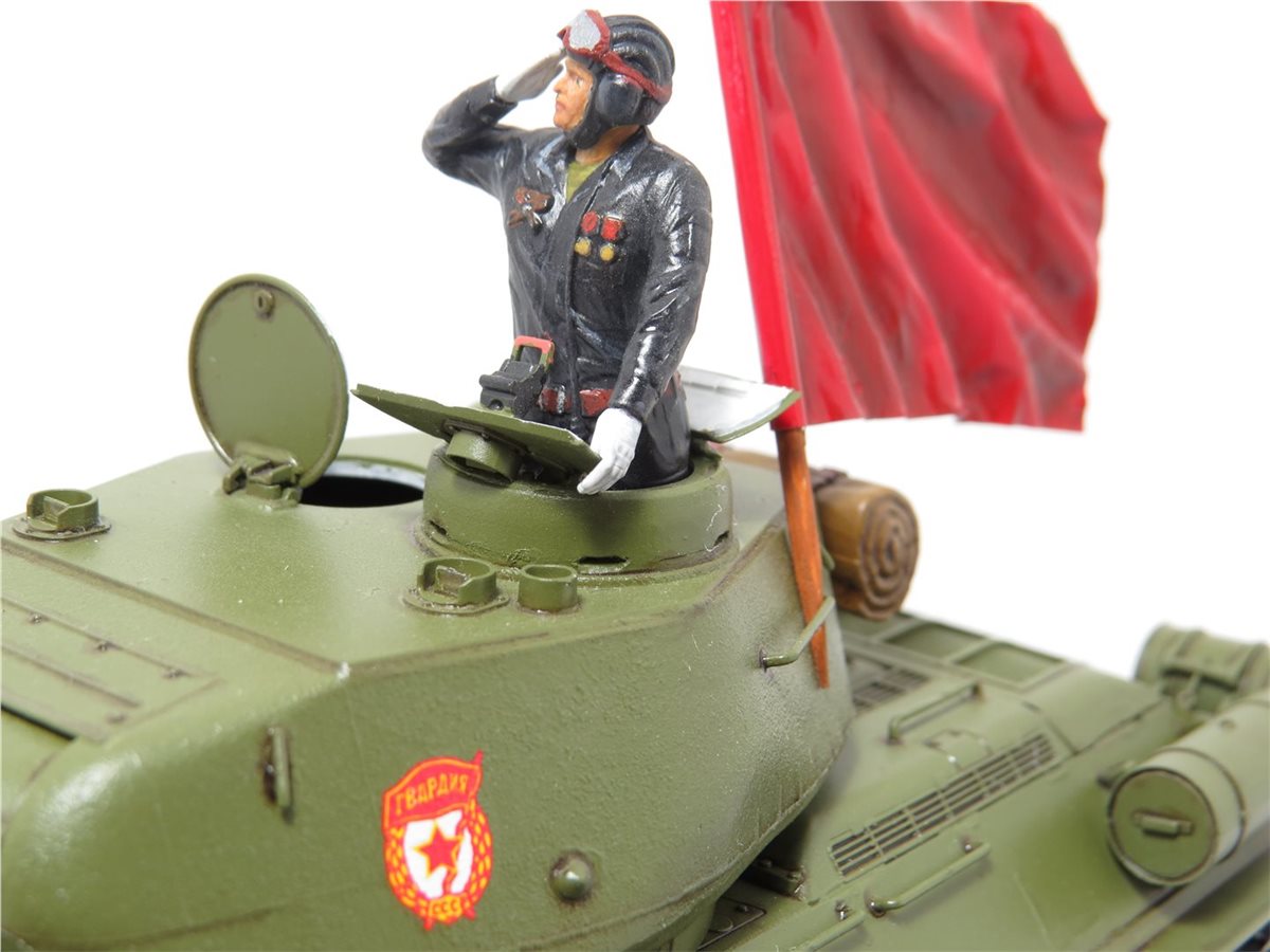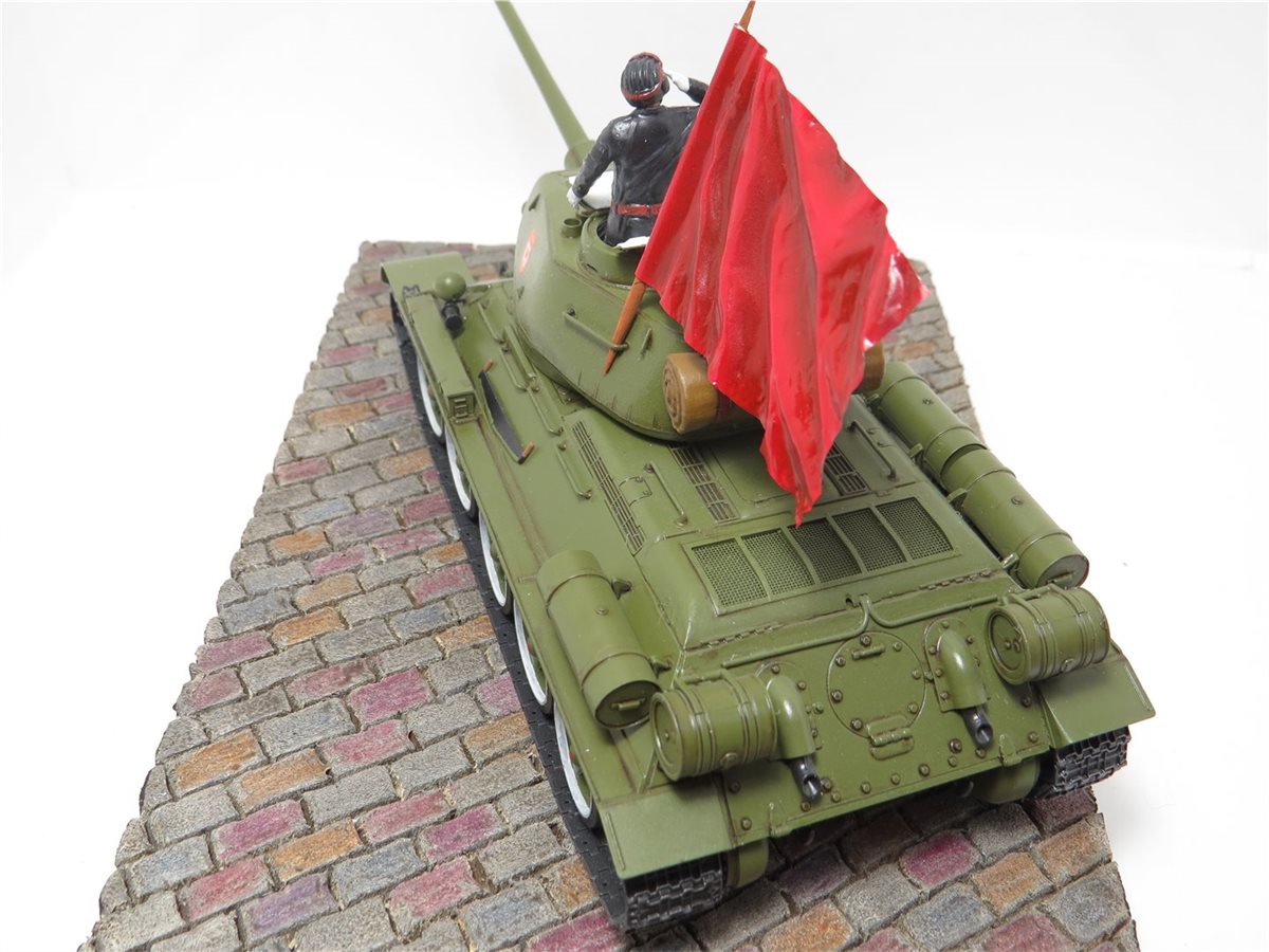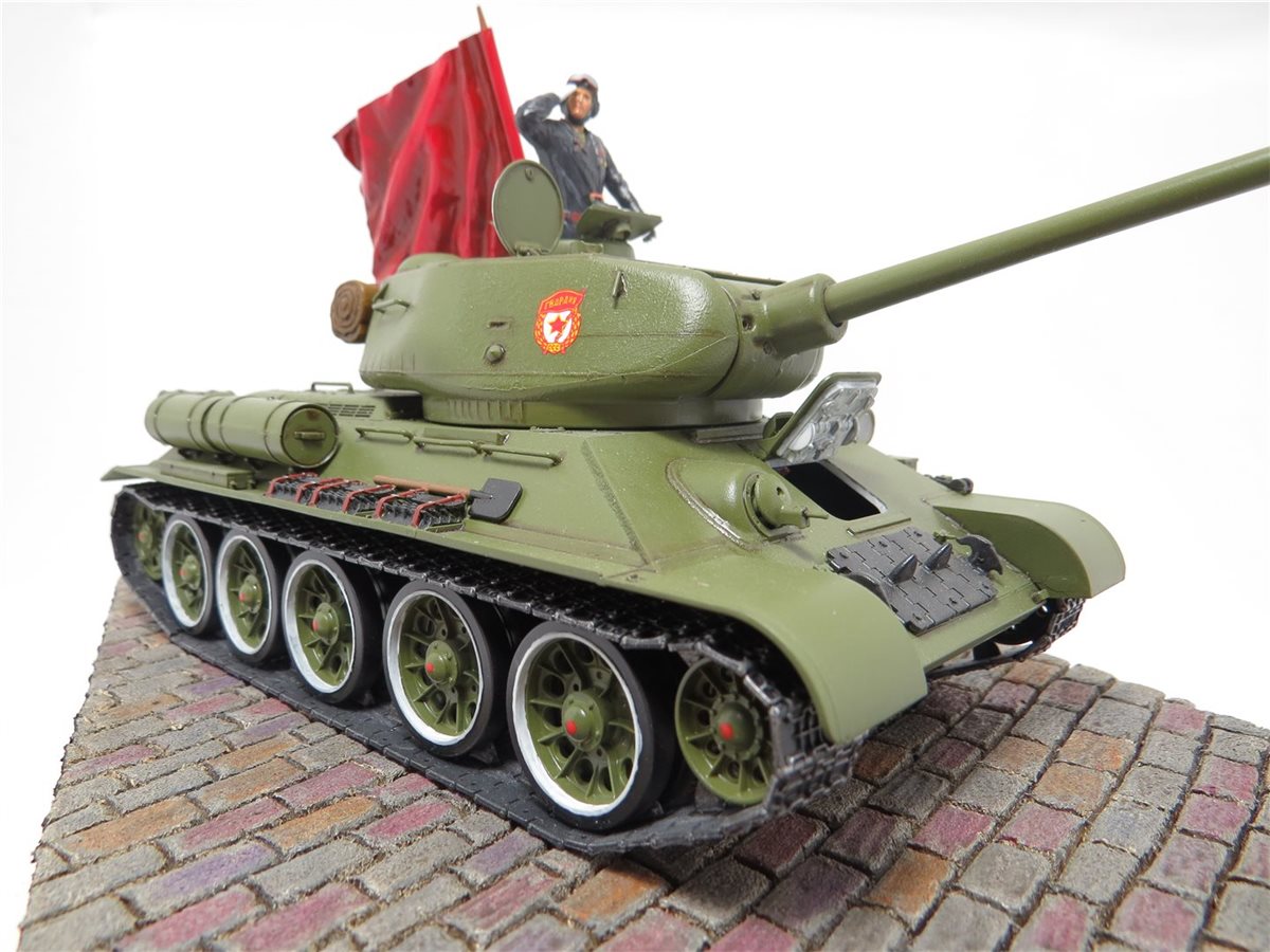 Легендарный танк победы Т-34/85 обр. 1944 года. Идея и желание сделать легендарный танк Т-34/85 в парадном варианте была всегда, так как любимый танк с детства. В постройке данной модели использовались наборы фирмы "Звезда": Танк Т-34/85; Механик водитель - набор "Советские танкисты"; Командир танка набор - "Российские современные танкисты в парадной форме". Основание работы сделано из пеноплекса с имитацией брусчатки. Знамя сделано из пищевой толстой фольги и зубочистки. Знак "Гвардия" взят из набора "ЗИС-5В". Для танка, фигур и знамени использовал 759 грунт PRIMER фирмы AK Interactive. Краски для танка использовал Mr.Hobby 511 "4BO", а для фигур и знамени краску Pacific. Смывку делал сам из художественных масленых красок и уайт-спирита Tikkurila. Использовал глянцевый и матовый лак фирмы Tamiya. Брусчатка покрашена с помощью художественных акриловых красок и акварельных карандашей.