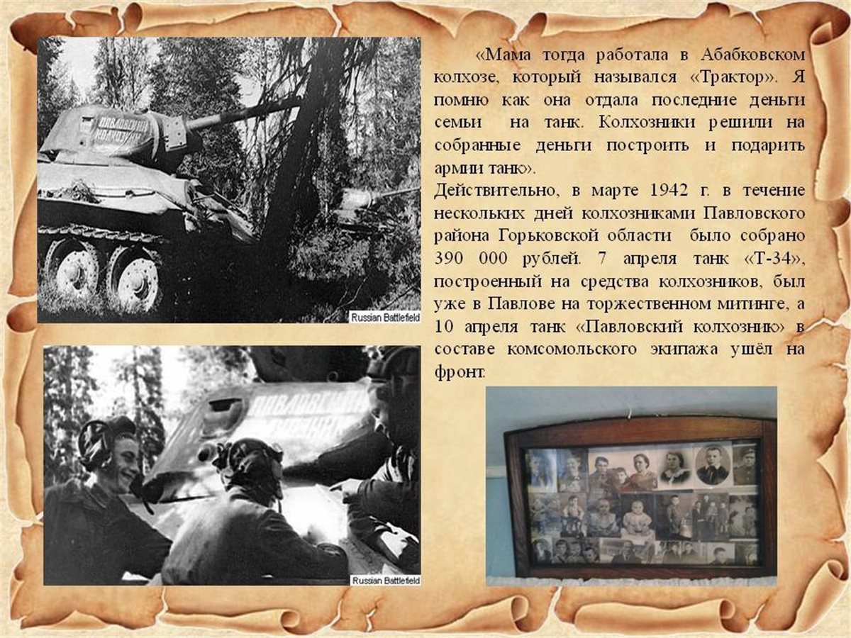 два танка). Уже 7 апреля 1942 года в г. Павлово состоялось торжественная передача танка Т-34 экипажу.