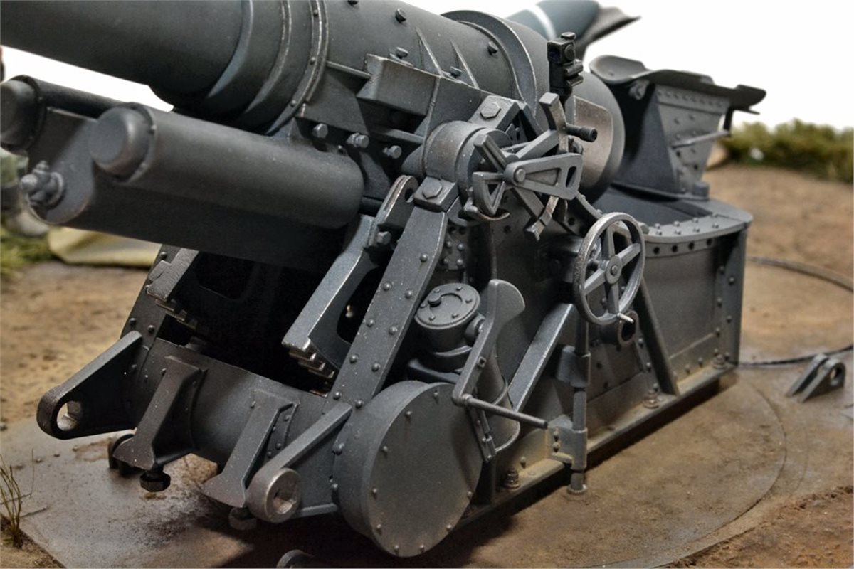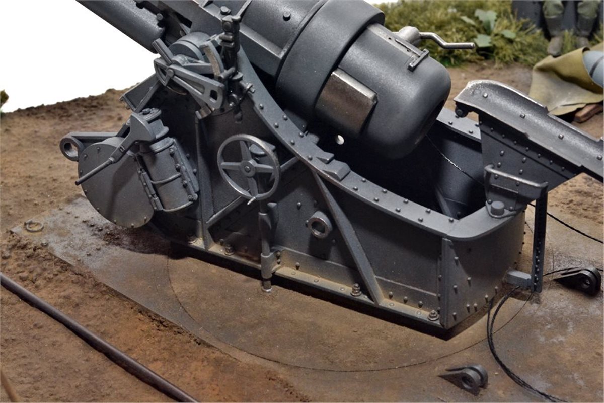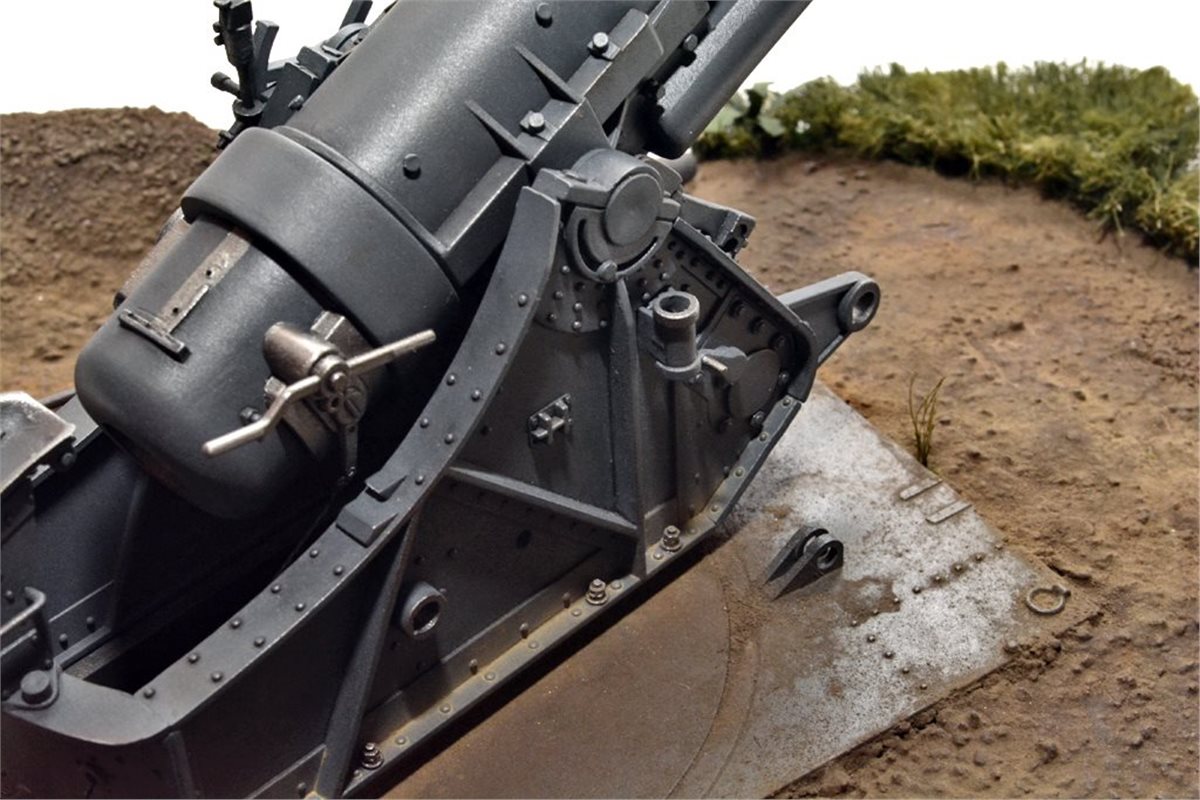 Исходный набор Takom арт.№2011. Мнение о нем у меня сложилось двоякое. С одной стороны, если делать изкоробочный вариант, то сборка его не будет сложной. Деталей в наборе немного. Качество литья хорошее. Сходимость деталей нормальная. То есть на выходе получится этакая простенькая, но при этом весьма эффектная "модель выходного дня". Если-же начать копаться в матчасти орудия, то все становится не так просто. Модель в наборе сильно упрощена. Часть элементов имеют неверные размеры или форму (например, слишком короткие рукоятки маховиков, отсутствует характерный элемент на казеннике, неверная форма передней части люльки, на поворотной части платформы нет приямка для отката ствола, неправильный прицел, отверстия на зубчатых секторах расположены слишком низко и прочее). Также, отсутствует ряд деталей (нет проушин и фиксатора на зубчатых секторах, а также шпилек и гаек крепления станка к платформе). Все это влечет за собой достаточно большой объем доработок модели. Кроме того необходимо отметить и не совсем удачное членение отдельных деталей в наборе. В результате, после их склейки на модели образуются швы там, где их быть не должно, и нужно их шпаклевать. Таким образом, для того чтобы привести матчасть модели в соответствие с оригиналом нужно изрядно повозиться. В ходе сборки я не ставил себе цель устранить все недостатки модели по матчасти, а сосредоточился лишь на исправлении только самых явных и видимых косяков. Все выполненные доработки можно посмотреть здесь: https://karopka.ru/forum/forum191/topic28466/