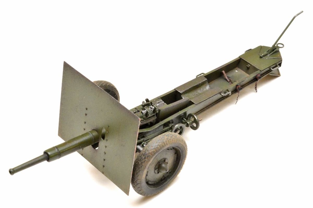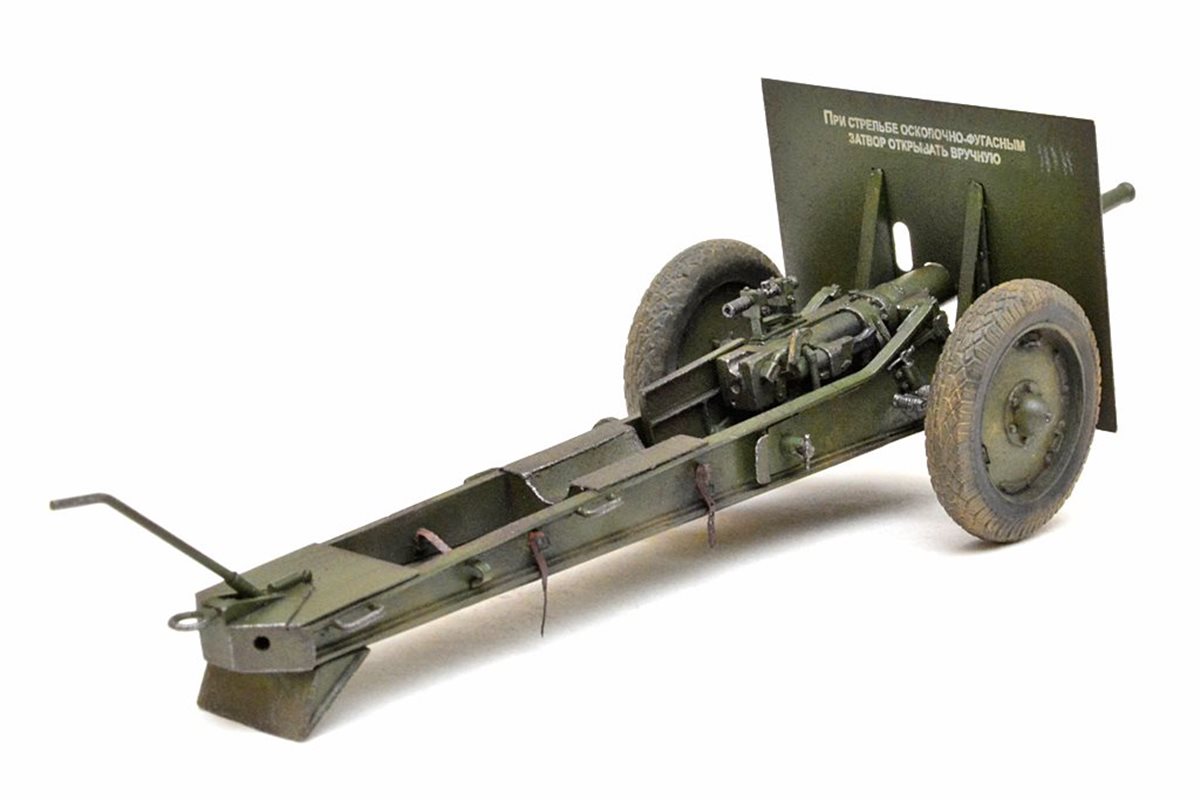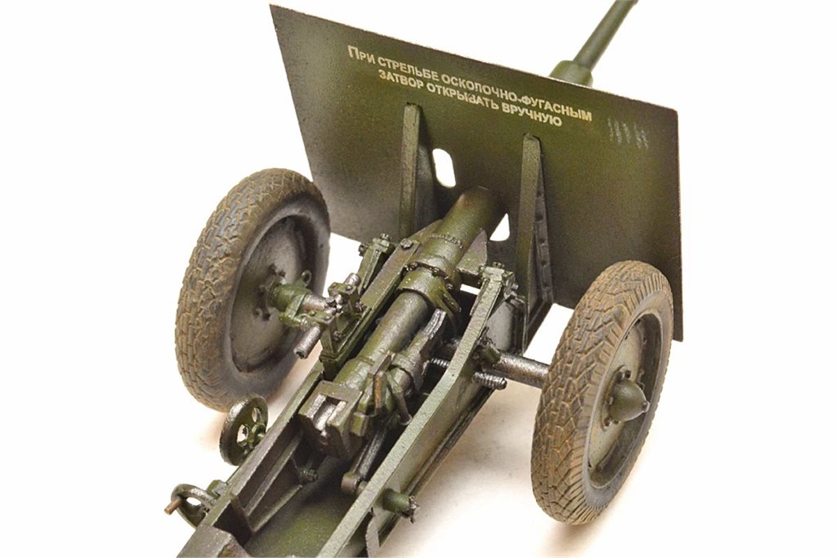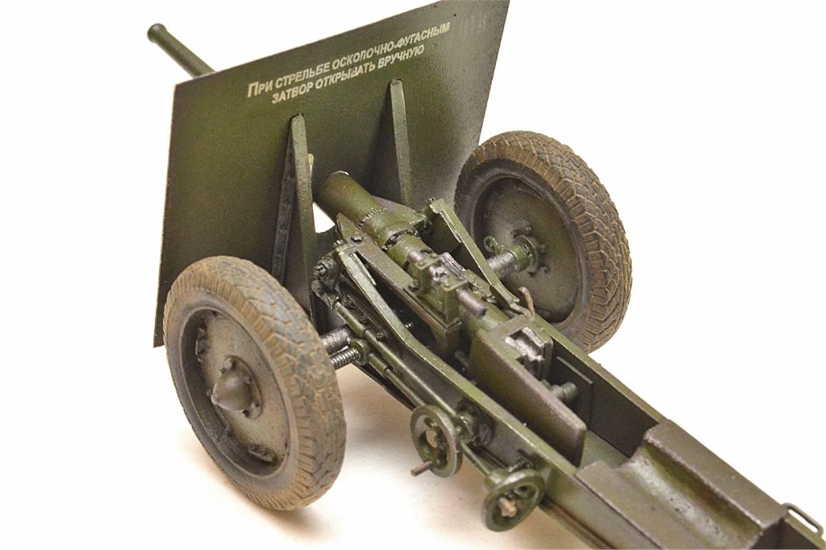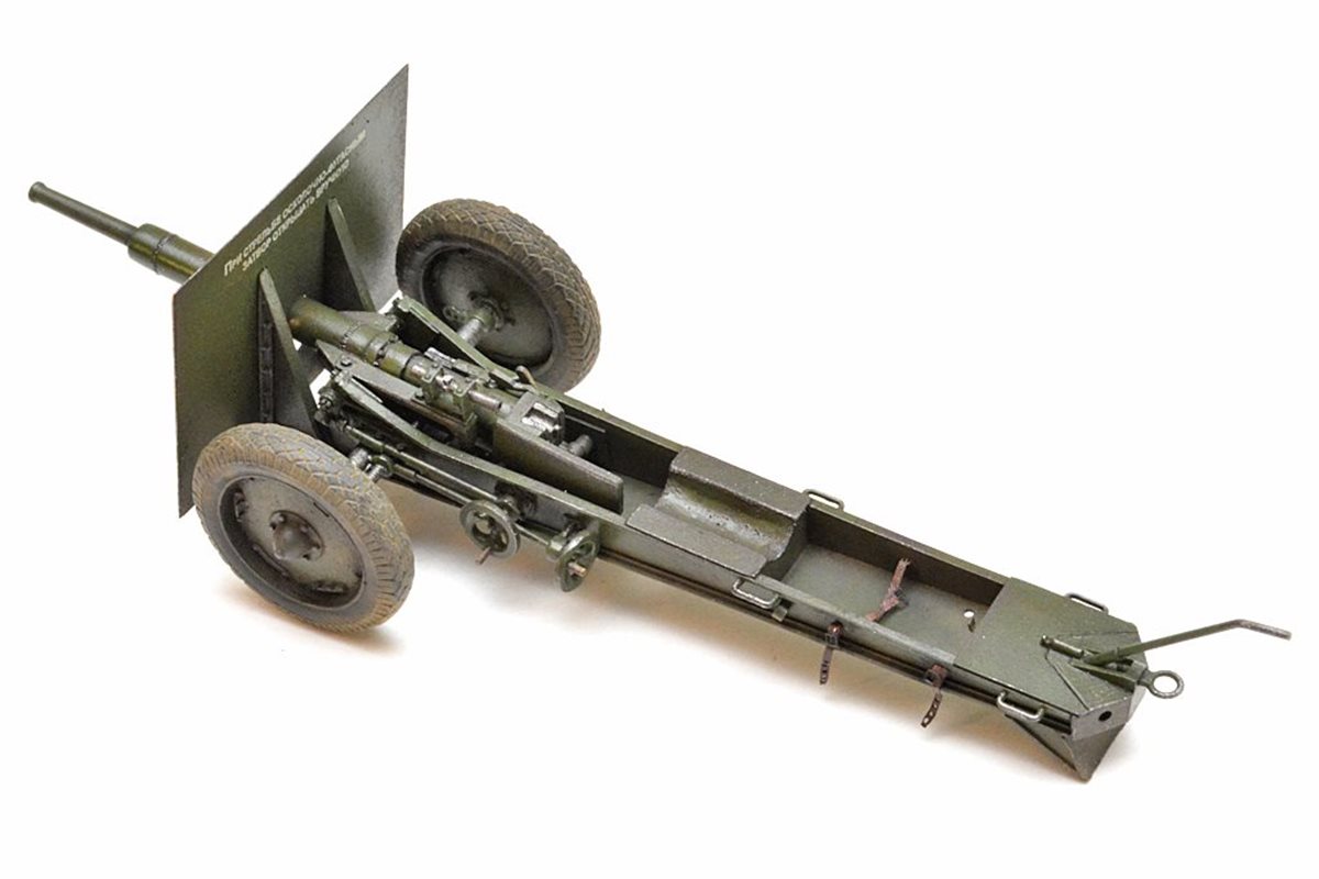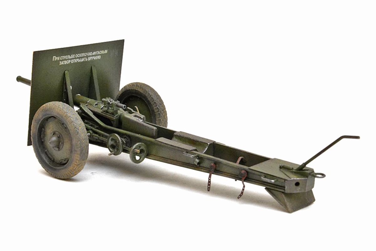 Исходный набор: Zebrano арт.№35001. Это ЛНД очень низкого качества. Из 80 имеющихся в нем деталей в сборке было использовано от силы штук 25, да и те с доработкой. Все остальное пришлось самоделить. Учитывая это, принял решение сделать модель в другом варианте нежели чем тот, что лежит в коробке, а именно с радиусной выемкой с средней части лафета и с прицелом от снайперской винтовки взамен имеющегося танкового. Сборку вел по фотографиям пушек из музеев в Падиково и Санкт-Петербурге. Весь объем доработок, а также покраску модели можно посмотреть здесь: https://karopka.ru/forum/forum191/topic29447/