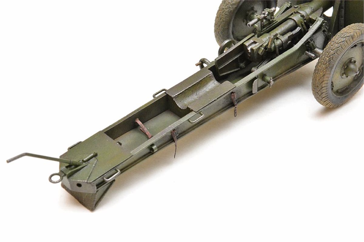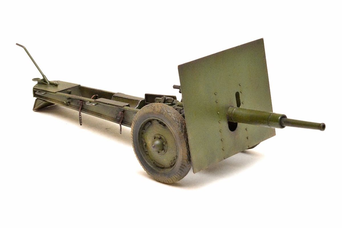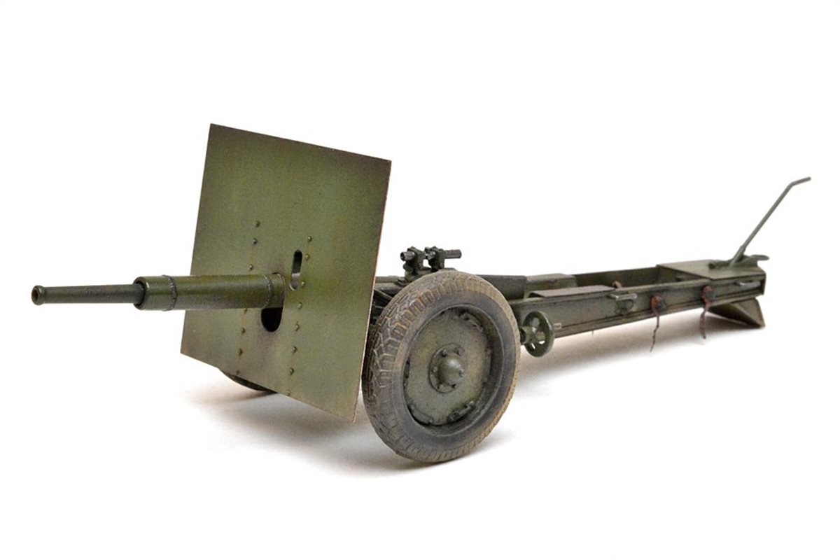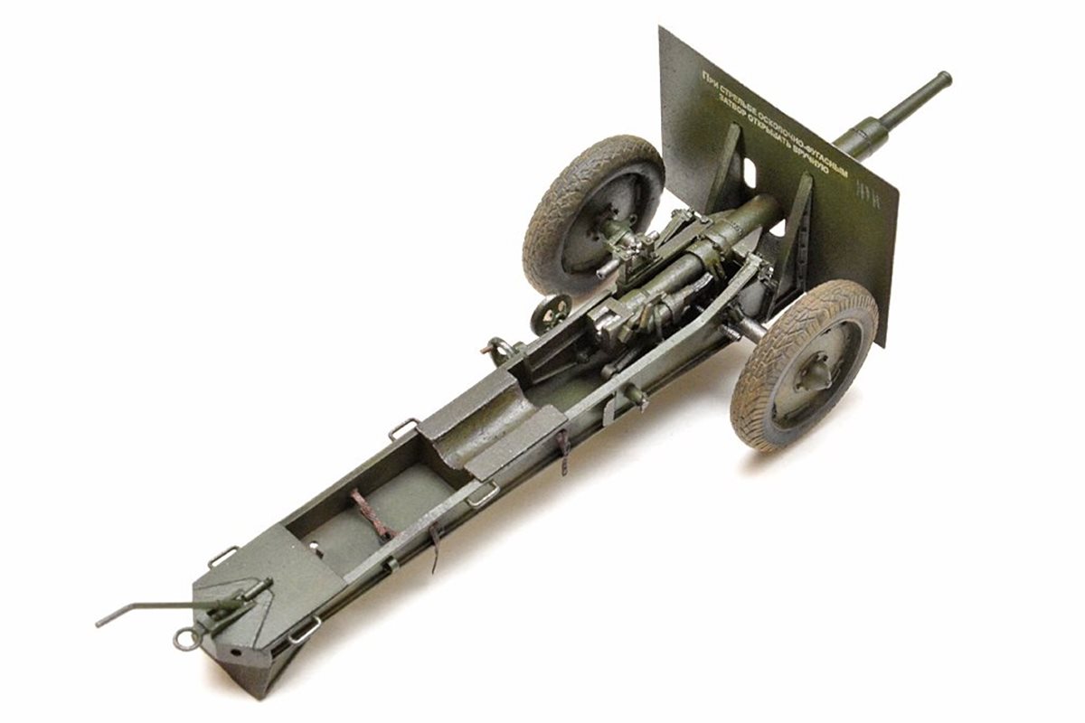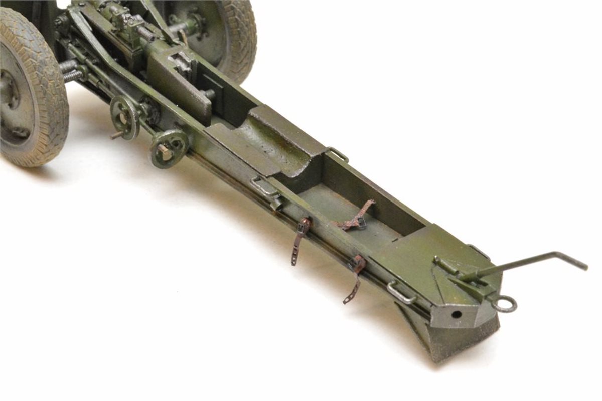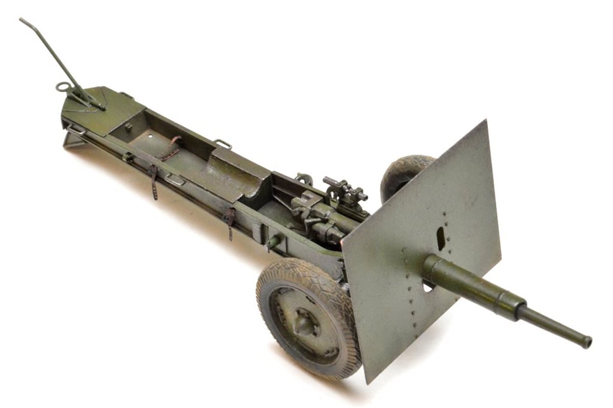 Исходный набор: Zebrano арт.№35001. Это ЛНД очень низкого качества. Из 80 имеющихся в нем деталей в сборке было использовано от силы штук 25, да и те с доработкой. Все остальное пришлось самоделить. Учитывая это, принял решение сделать модель в другом варианте нежели чем тот, что лежит в коробке, а именно с радиусной выемкой с средней части лафета и с прицелом от снайперской винтовки взамен имеющегося танкового. Сборку вел по фотографиям пушек из музеев в Падиково и Санкт-Петербурге. Весь объем доработок, а также покраску модели можно посмотреть здесь: https://karopka.ru/forum/forum191/topic29447/