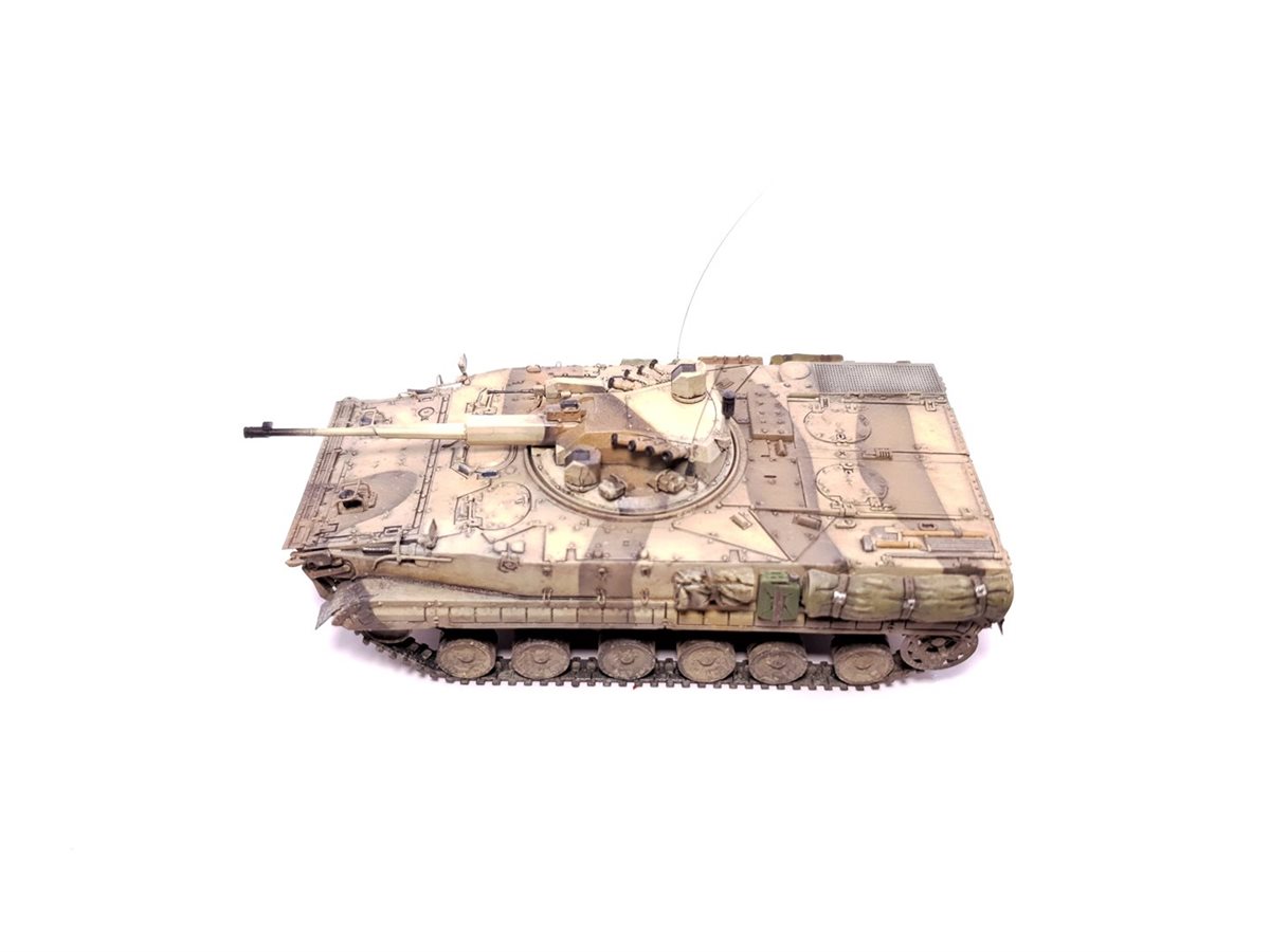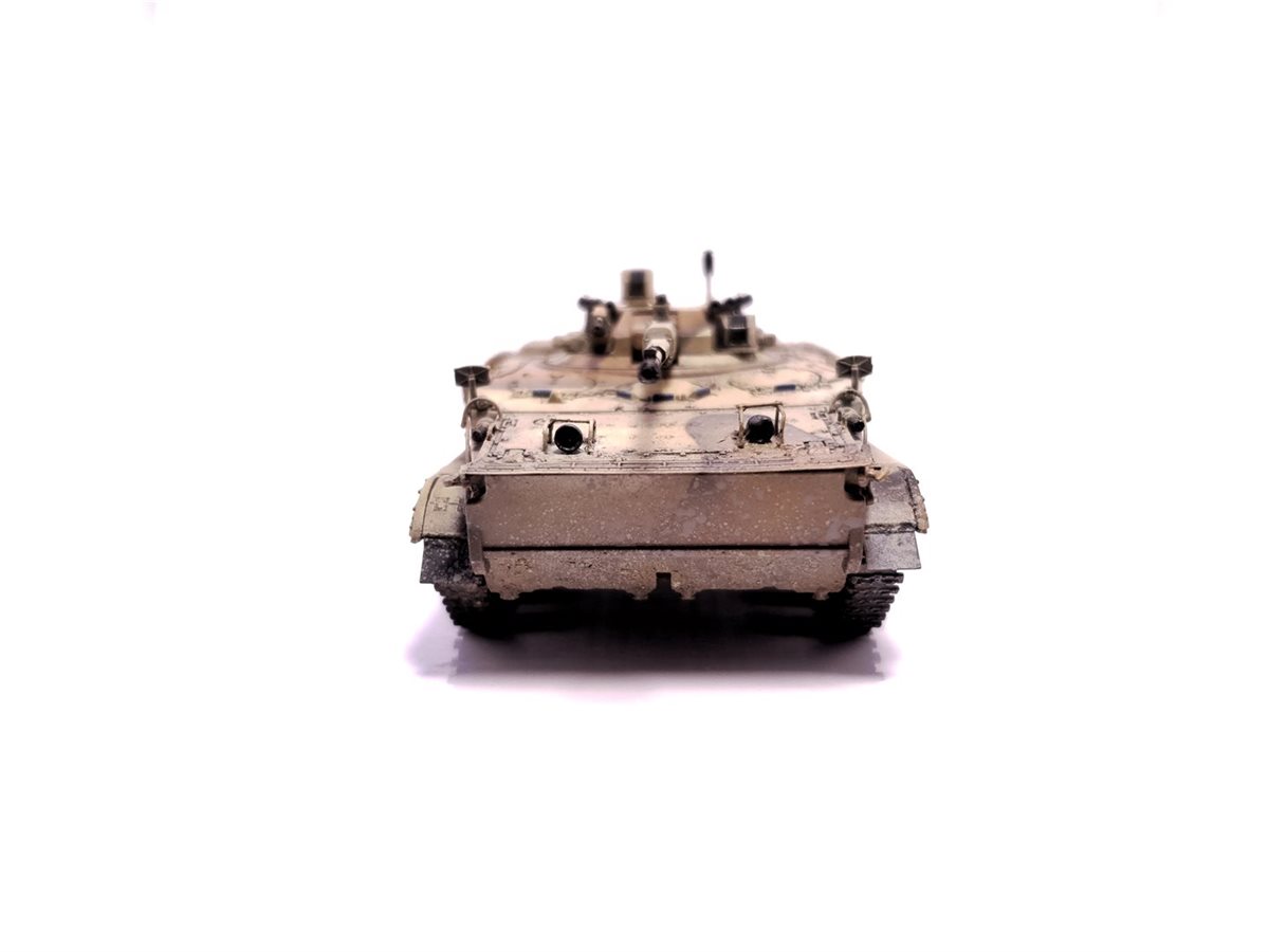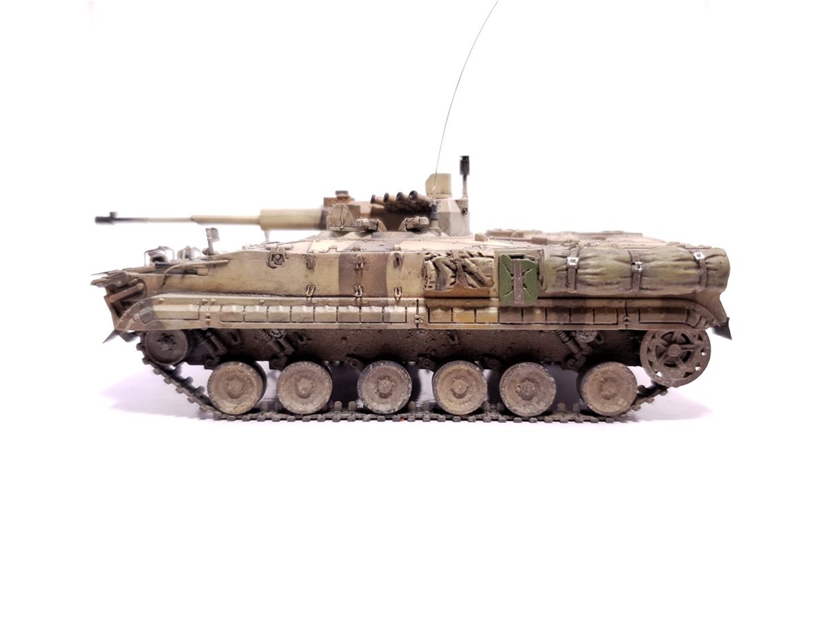 В качестве базы взял один из наборов БМП-3 от ModelCollect, изнчально хотел вариант с решетками для антуража, но набор пришлось бы ждать долго. Сразу к модели заказал на форуме у Димок73 точеный ствол, пулемет и "Тучи". Сначала поставил смоляные "Тучи", но потом заменил на точеные. Позже добавил антенные вводы от Zedval. Долго мучился с антеннами, в итоге сделал из двойной бисерной иглы. В процессе добавил смоляные канистры, сумки, скатки и ящик от Golikov Project и Таран'а. Из проволоки сделал защиту для фар и дополнительные крепления для обвесов на корпусе, а так же защиту для курсовых пулеметов. Камуфляж сделал из головы из серии "What if?".