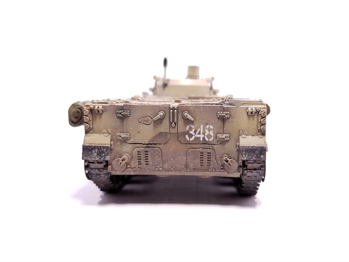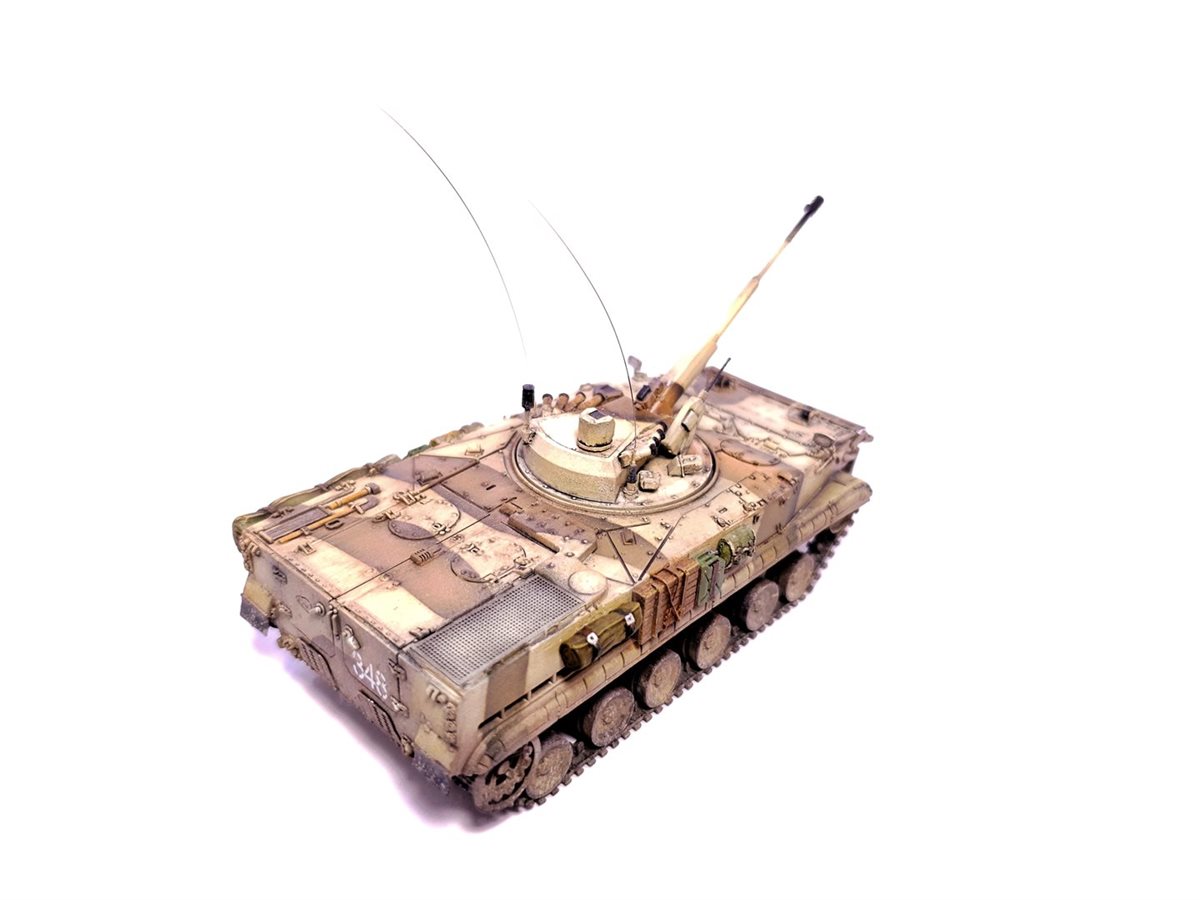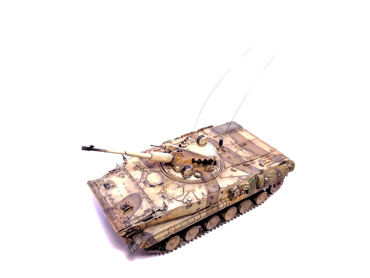 В качестве базы взял один из наборов БМП-3 от ModelCollect, изнчально хотел вариант с решетками для антуража, но набор пришлось бы ждать долго. Сразу к модели заказал на форуме у Димок73 точеный ствол, пулемет и "Тучи". Сначала поставил смоляные "Тучи", но потом заменил на точеные. Позже добавил антенные вводы от Zedval. Долго мучился с антеннами, в итоге сделал из двойной бисерной иглы. В процессе добавил смоляные канистры, сумки, скатки и ящик от Golikov Project и Таран'а. Из проволоки сделал защиту для фар и дополнительные крепления для обвесов на корпусе, а так же защиту для курсовых пулеметов. Камуфляж сделал из головы из серии "What if?".