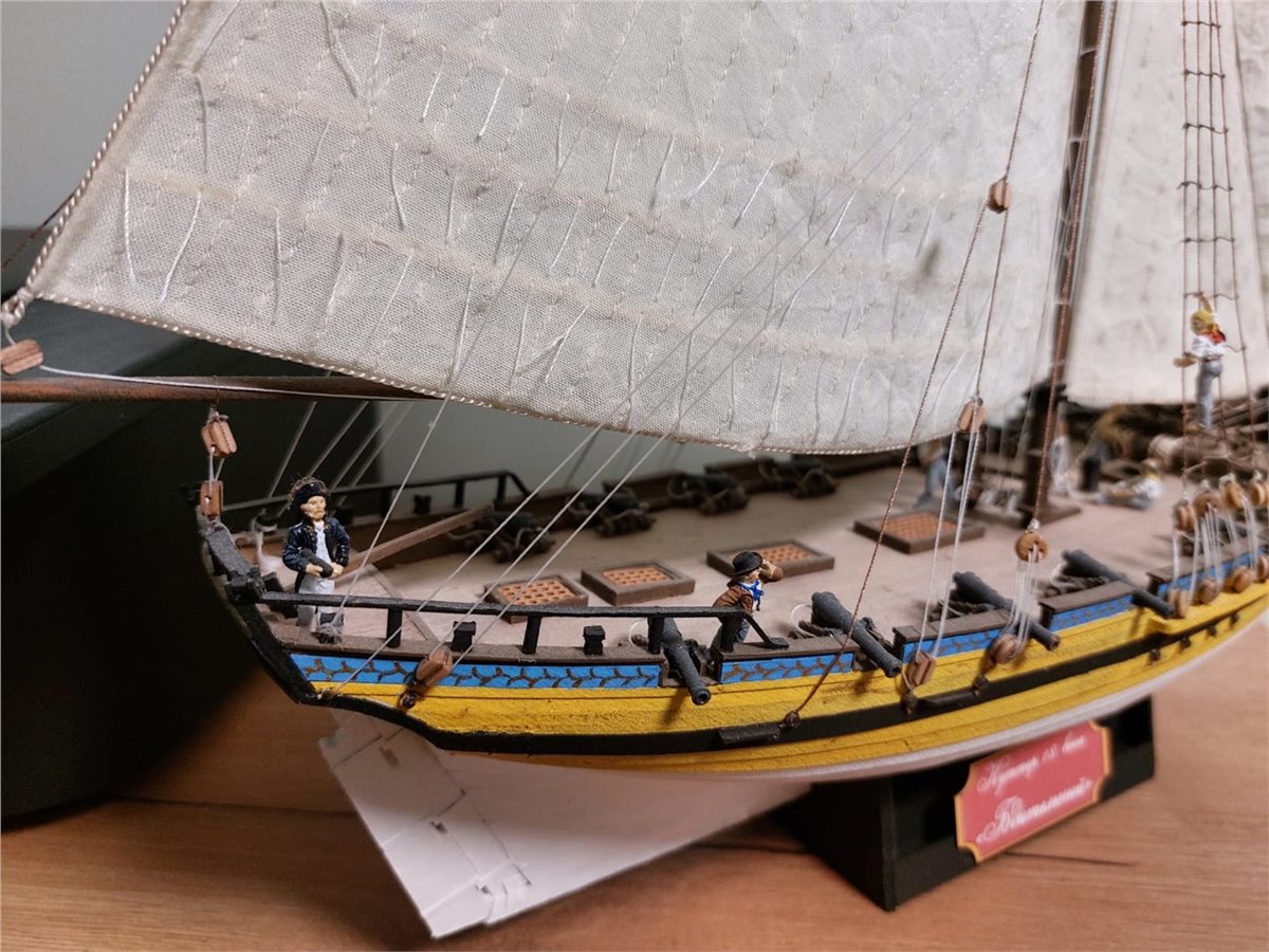 Представленная модель британского катера относится к первой половине 18 века, когда на смену традиции "пряничного домика" уже давно и прочно пришла традиция строгой аскетичности и утилитарности. Тем не менее, некоторые суда продолжали украшать рисунками, барельефами и резьбовыми элементами. Особенно это касается судов, несших службу в колониях Великобритании.