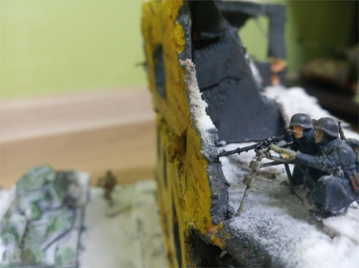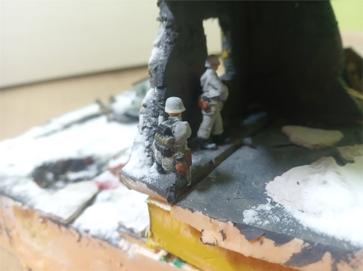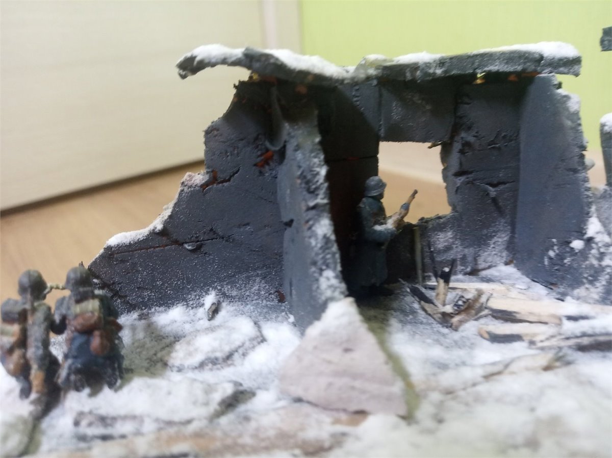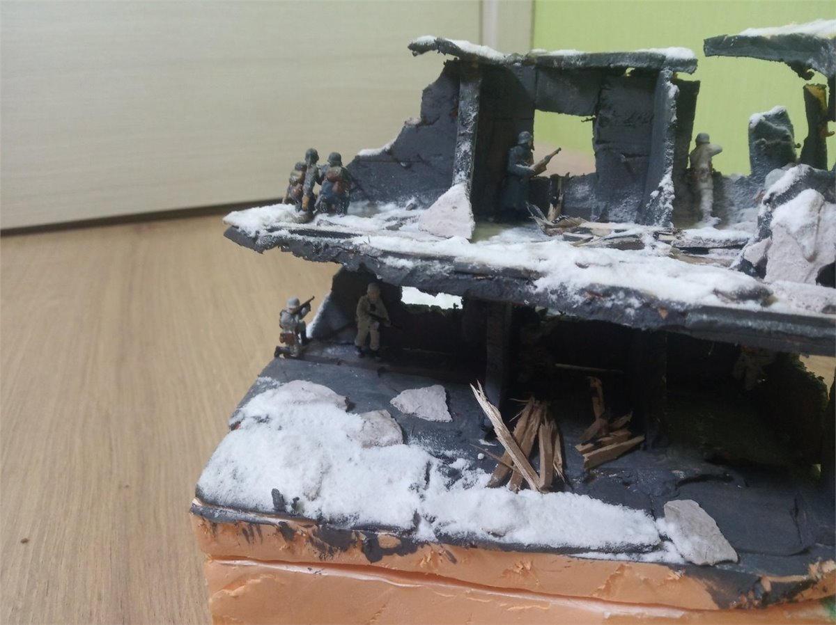 На макете изображена Ржевская мясорубка,где потери советский войск составили 290.000 человек, а немецких солдат составило 16 дивизий (198.000 человек приблизительно).на самой же диораме показано как советские войска попали в немецкую засаду,где и происходит
