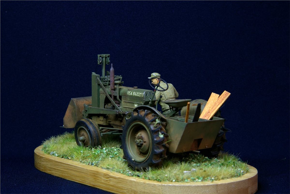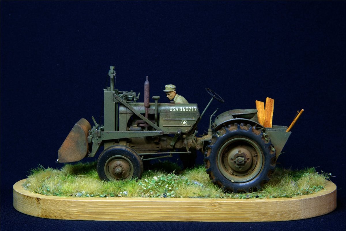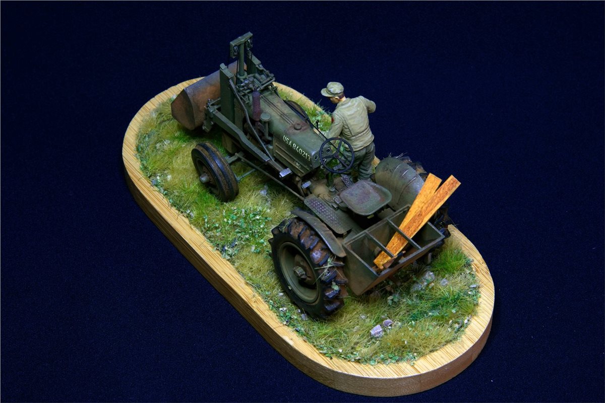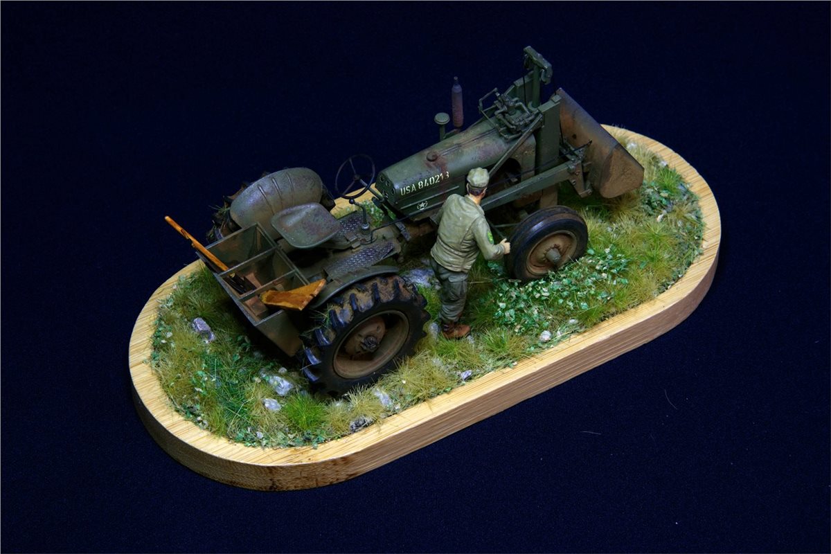 Модель довольно известная, по сборке никаких замечаний. Небольшие доработки по двигателю, переделал глушитель, накидал барахла в кузов. Водитель из набора MiniArt. Основание - готовый мат ( не помню какого производителя) Окрас - Vallejo, пигменты, масло.По задумке: остановился он на полянке и решил чего-то там подкрутить :)