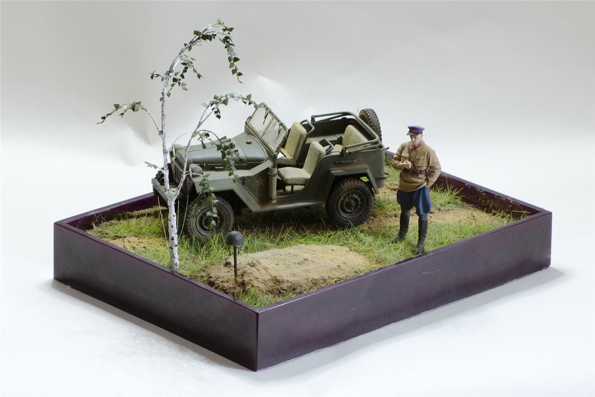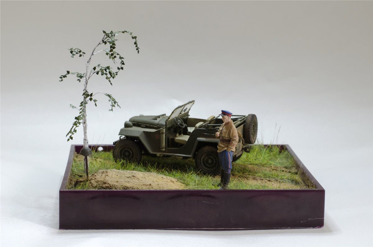 ГАЗ-67Б от Trumpeter с травлением Eduard, смоляная фигура офицера НКВД по всей вероятности от Tank, берёза из проволоки, листья ModelScene. Красил Valejo,фигуру темперой ПВА, попробовал пигменты и текстурную пасту ZiPMaket.