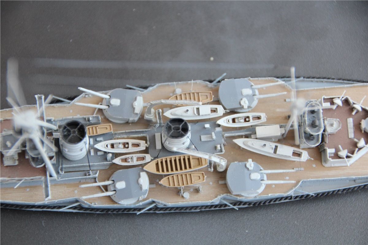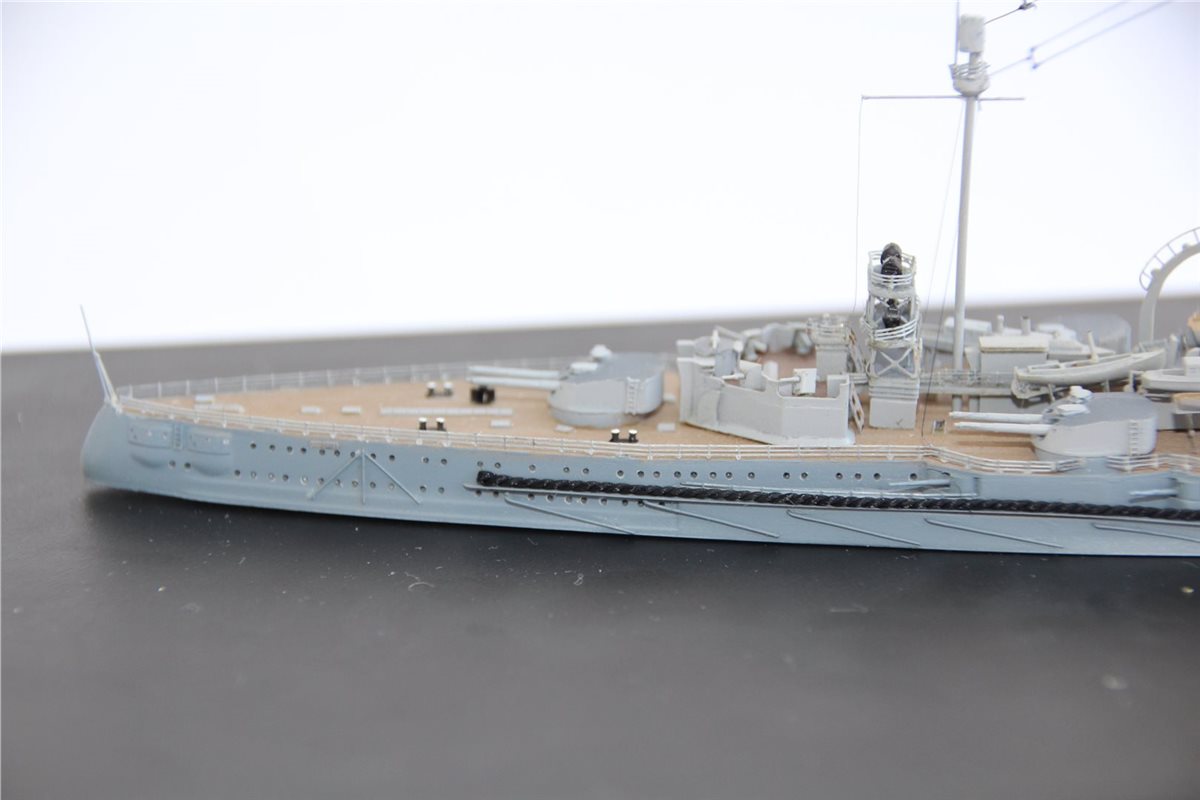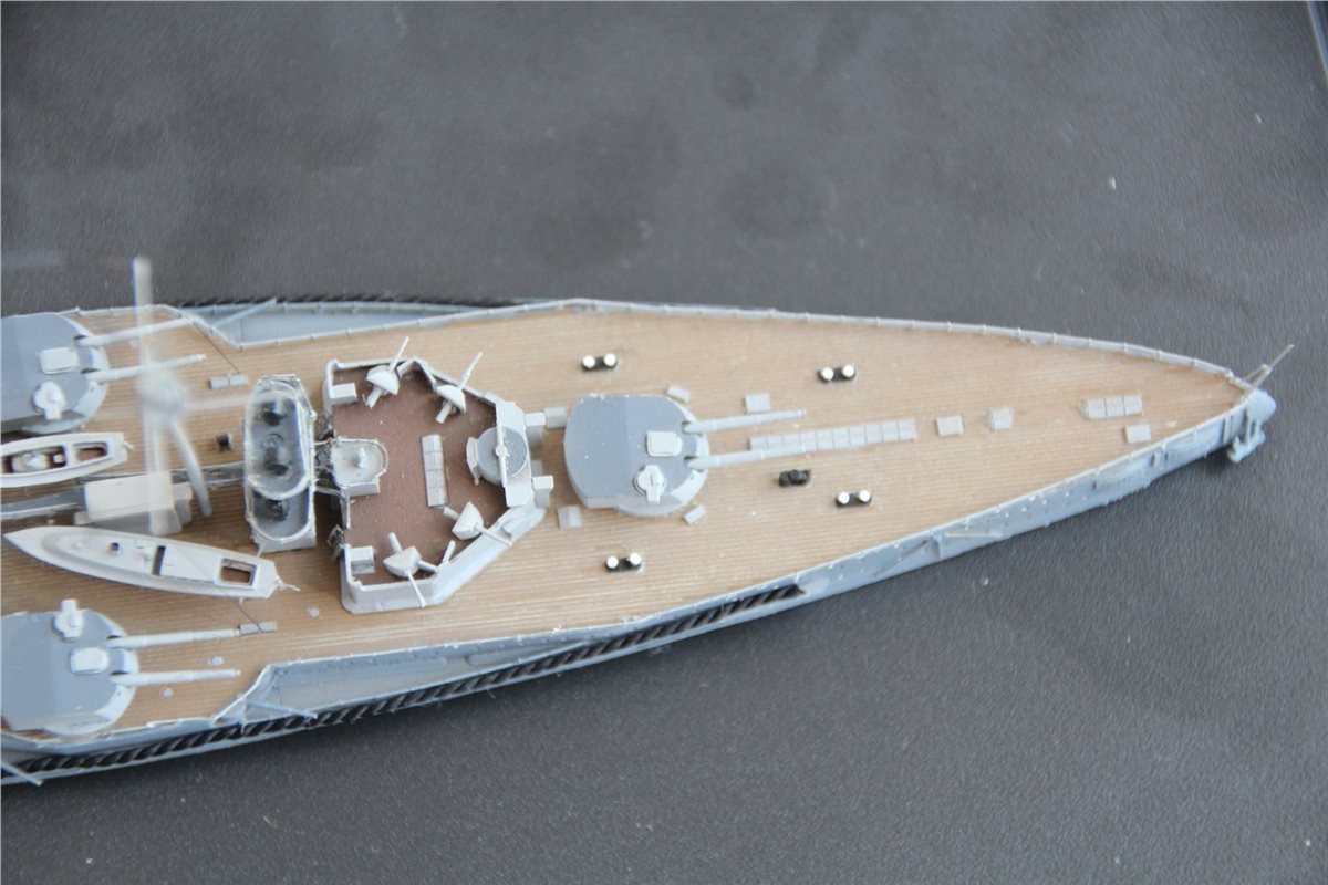 Покраска: все красилось эмалями от Тамии, светло-коричневая палуба с темно-коричневым линолеумом, нейтрально-серый корпус со светло-серыми надстройками и башнями, темно-серые крыши башен и палуба надстроек.