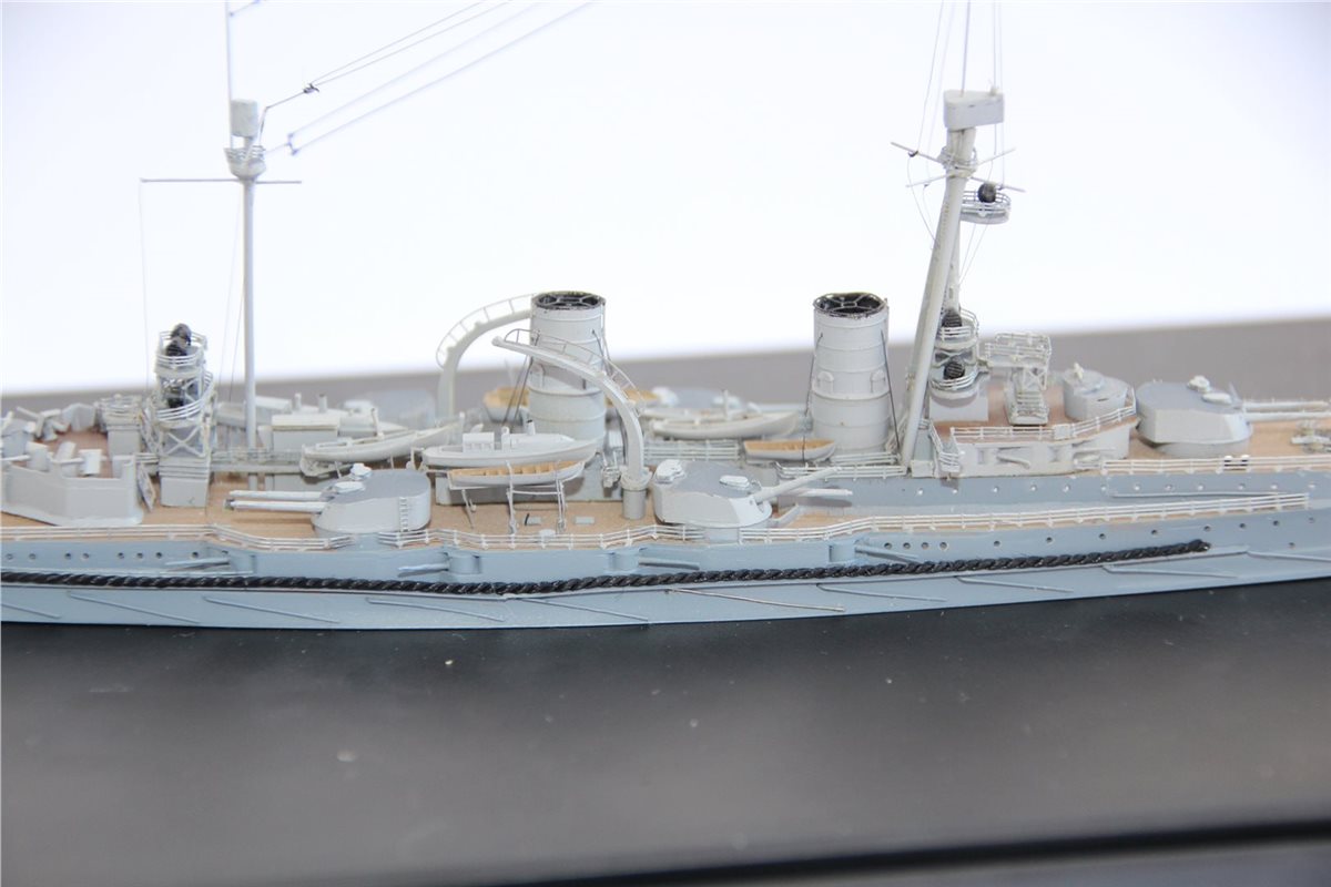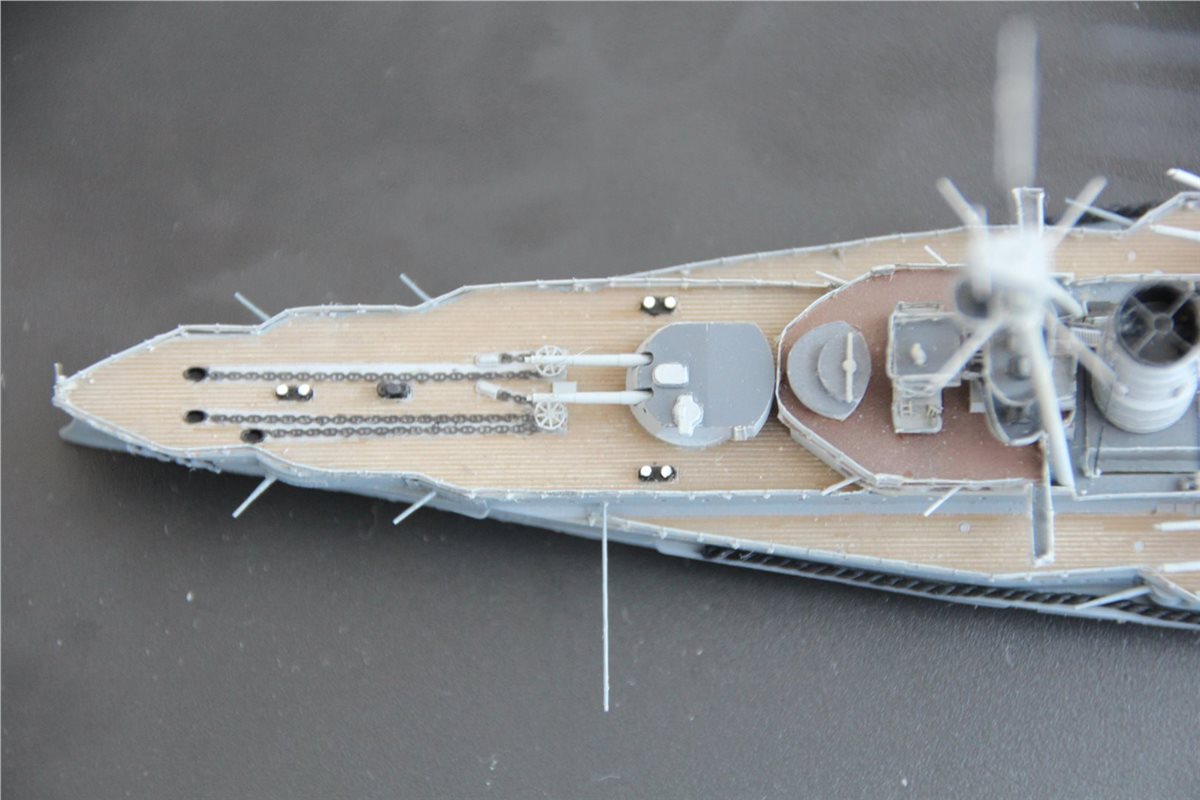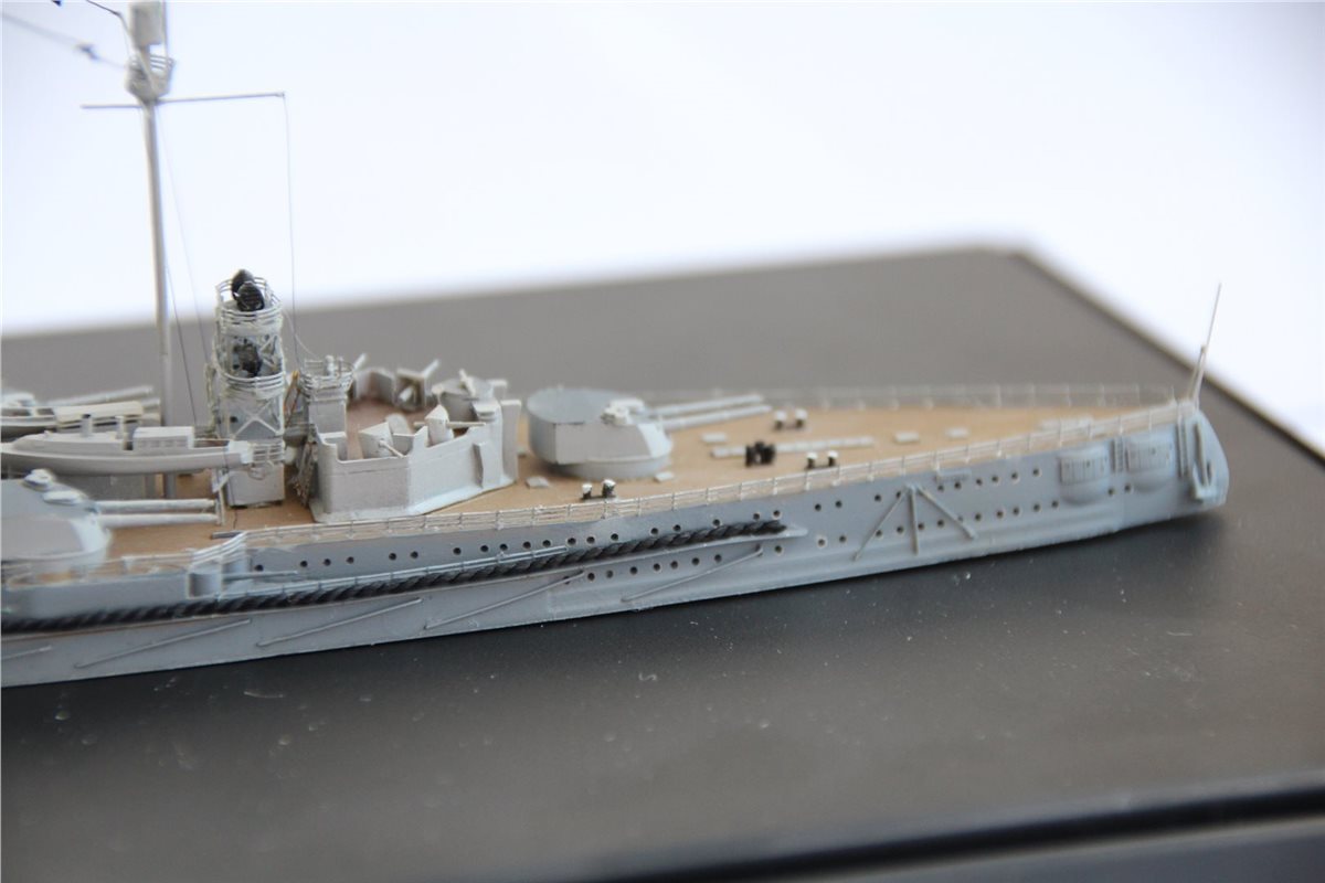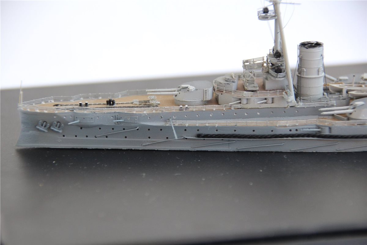 Покраска: все красилось эмалями от Тамии, светло-коричневая палуба с темно-коричневым линолеумом, нейтрально-серый корпус со светло-серыми надстройками и башнями, темно-серые крыши башен и палуба надстроек.