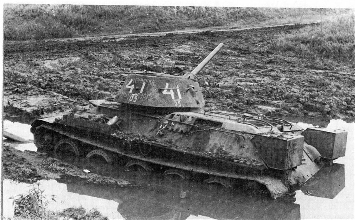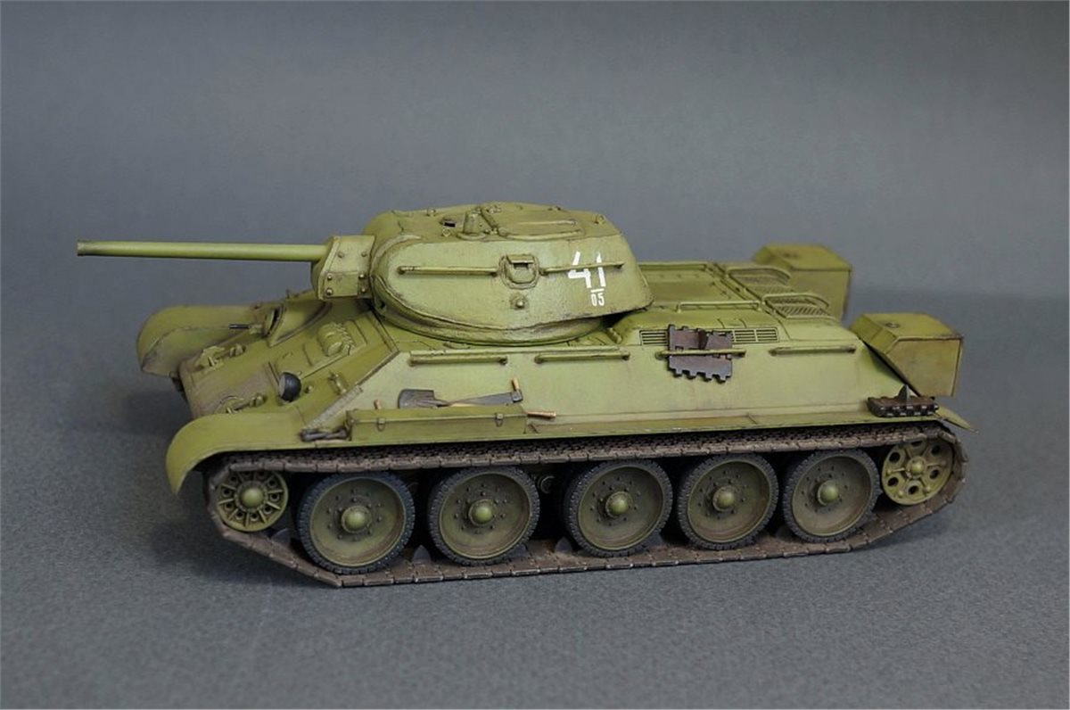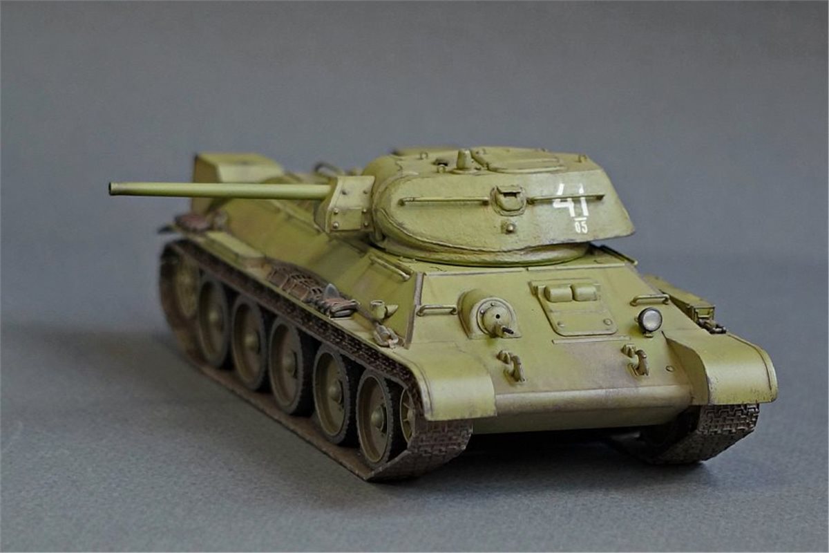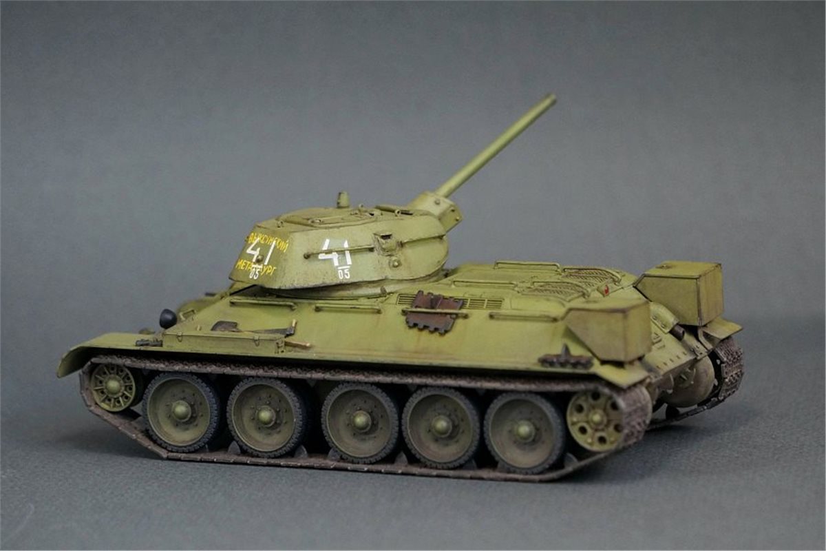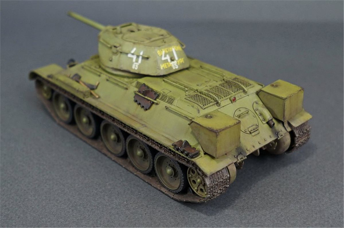Прототипом данной модели был выбран танк из колонны "Выксунский Металлург", построенной на средства, собранные коллективом Выксунского металлургического завода. 13 апреля 1943 года на горьковском заводе "Красное Сормово" состоялась торжественная передача колонны представителям 186-й танковой бригады. Танки эти прошли славный боевой путь, воевали на Курской дуге, участвовали в боях за освобождение Белгорода, Харькова, форсировании Днепра. Модель позиционируется как модификация 1941 года, но насколько я могу судить по матчасти, это скорее зима 1942 - весна 1943. Производитель что-то намудрил с кормовым листом башни - он сделан съемным, но без крепежных болтов, да и к тому же значительно утоплен вглубь башни. Пришлось повозиться со шпатлевкой и восстановлением "литой" текстуры. В сборке использовались некоторые "запчасти" от хоббиБоссовской тридцатьчетверки и металлический ствол от RB Model. Задний габаритный фонарь представлял из себя одну сплошную утяжину, заменил его на выточенный из красной прозрачной шпажки. Добавил металлический трос и ствол пулемета из инъекционной иглы. Покраска - акрил и лаки Tamiya (очередная попытка намешать 4БО из тамиевских цветов), худ. масло, пигменты. Из явных недостатков модели могу отметить серебрение декалей при некоторых ракурсах, видимо сказалась неровность "литой" текстуры башни, хотя приваривал как всегда МаркФитом на глянцевый лак. Еще одна проблема возникла при сборке ходовой: гусеницы ни в какую не желали нормально стыковаться и садиться на задние ведущие катки, вплоть до того, что пришлось подрезать ролики внутри этих