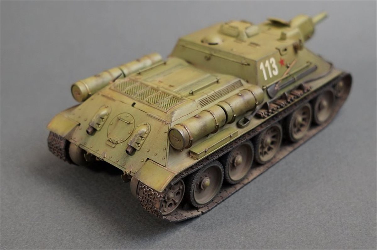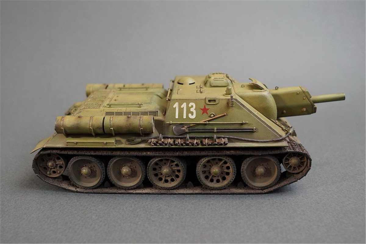 Модель самоходной артиллерийской установки СУ-122 от фирмы Тамия в масштабе 1:48. Сама по себе модель собирается приятно и достаточно легко, утяжин и облоя нет. Правда, "изкоробочная" версия мне показалась скучноватой, поэтому при сборке были использованы некоторые детали от Т-34-76 производства ХоббиБосс, а именно: крышка МТО с травленой сеткой, литые катки раннего типа, ящики ЗИП, фара и шанец. Также был добавлен металлический трос, проволочная ручка-скоба на лючке в заднем броневом листе и ремни крепления запасных траков. Проблема возникла во время установки гусениц, на них есть щели между траками под задними брызговиками. Красил модель акрилом от Тамии, базу 4БО мешал из XF-4 и XF-58 1:1, высветлял добавлением в базовый цвет темно-желтого XF-60. Фильтр и смывки Pacific88, пигменты Wilder, художественное масло.