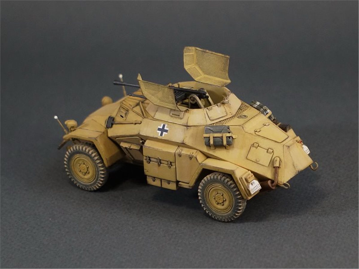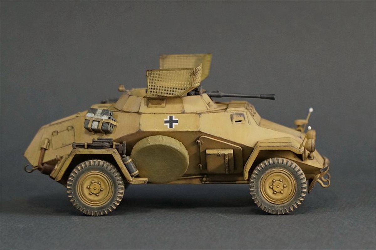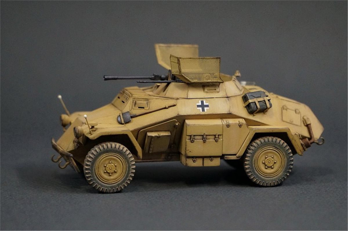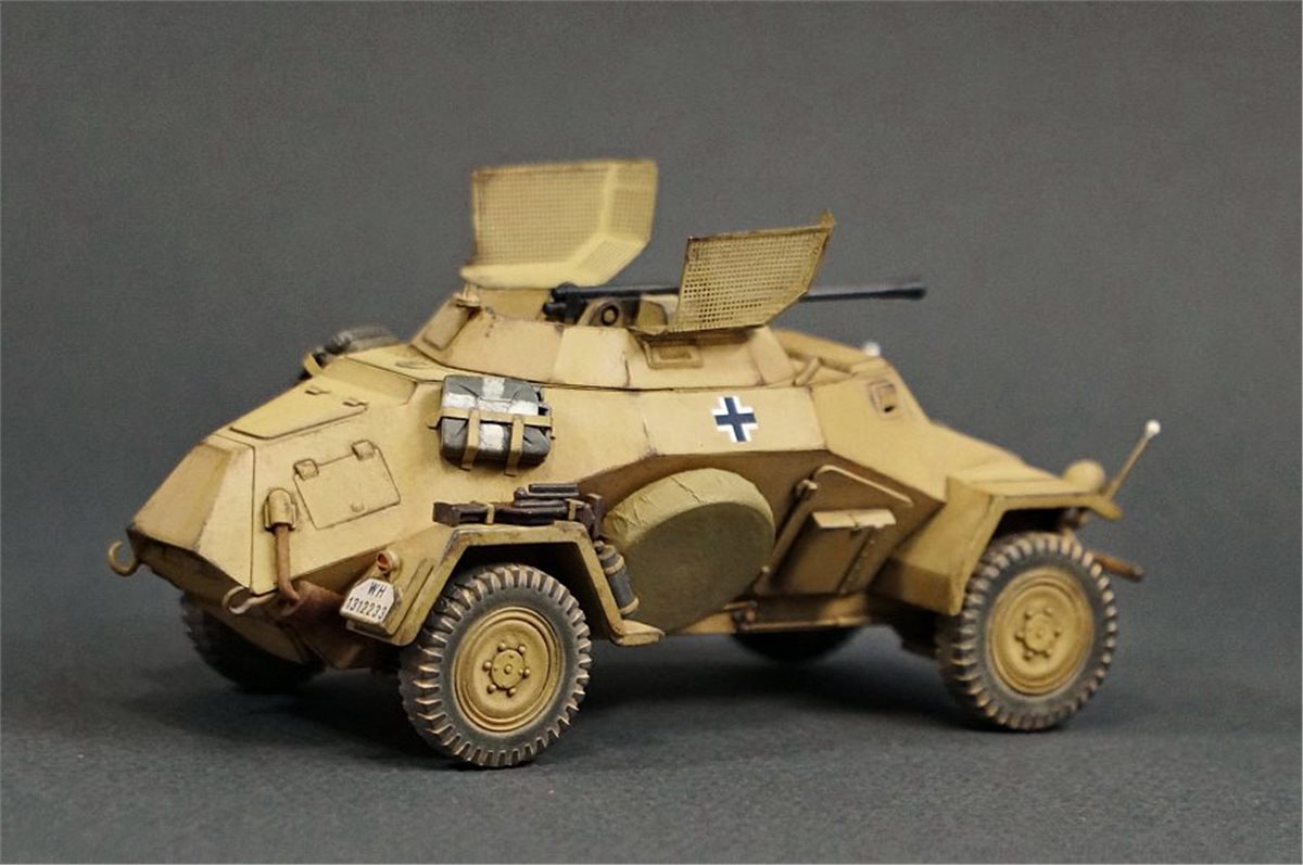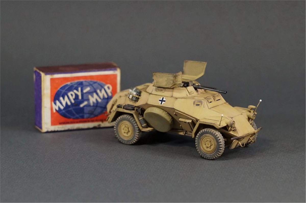 Модель немецкого бронеавтомобиля Sd.Kfz.222 от фирмы ICM в масштабе 1:48. Модель довольно приятная в сборке, хотя и имеет много упрощений детализации и из коробки смотрится бедно и пусто. Поэтому при постройке использовал много всяческой мелочевки и кое-какое