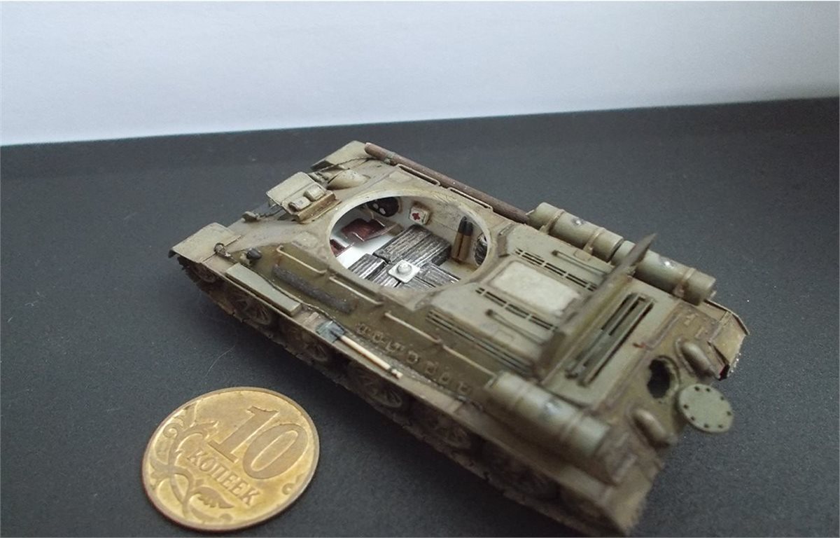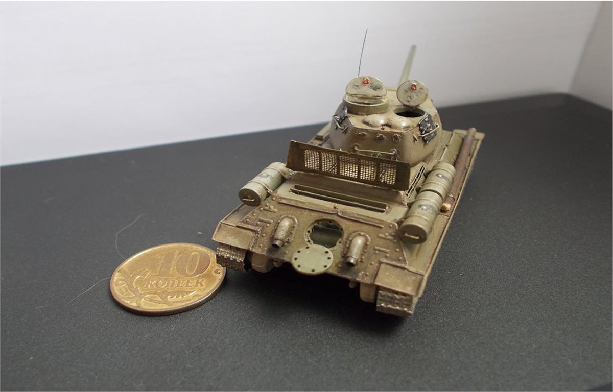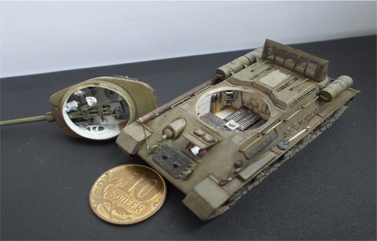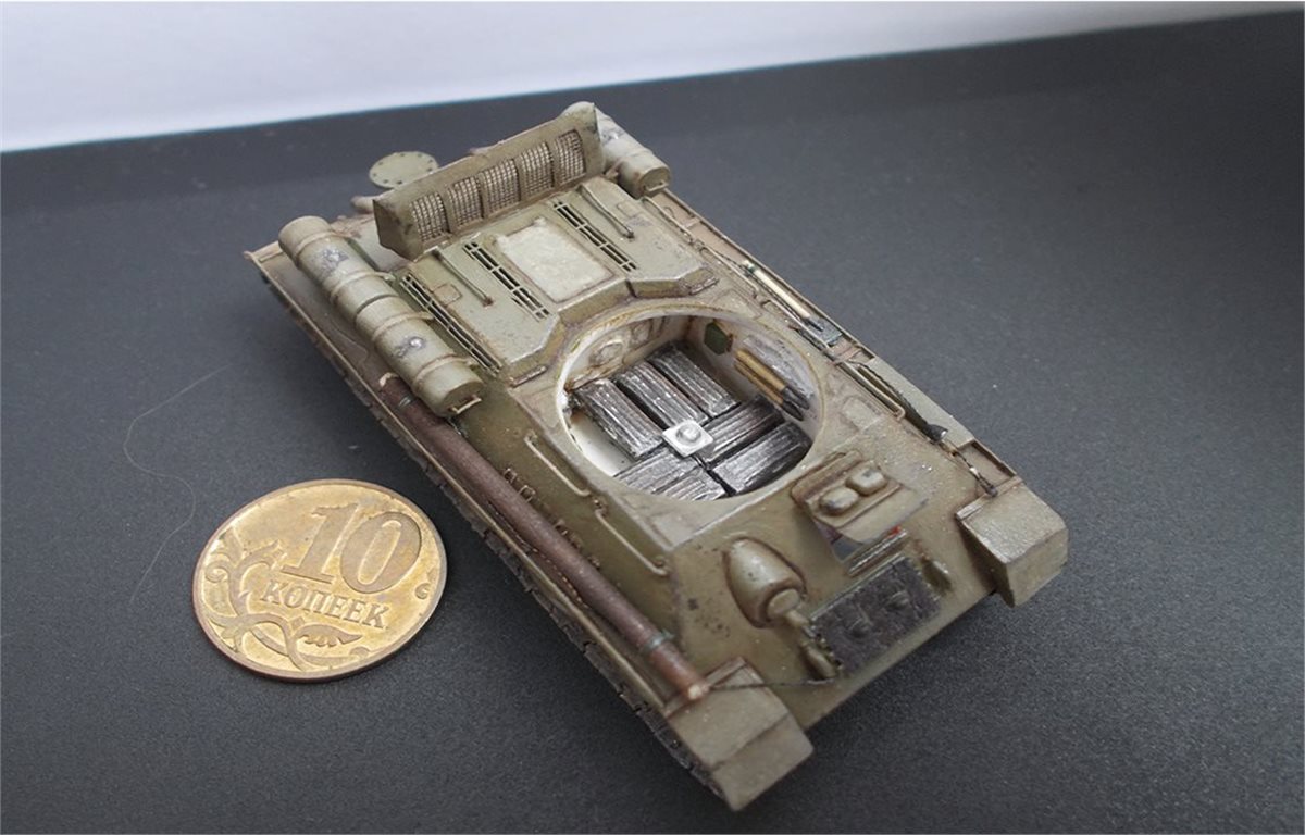 В процессе сборки модели был выполнен интерьер боевого отделения корпуса и башни. Использовался тонкий пластик и алюминиевая фольга 0,15 мм. В экстерьере модели переделаны над гусеничные полки, решётки МТО, открыты люки. Решётки выполнены из самодельного фототравления, крышка жалюзей спаяна из латуни толщиной 0,25 мм. Сделаны тросы, толщина соответствует масштабу. Заменён курсовой пулемёт и выхлопные трубы на иглы от шприцов, доработан антенный ввод, поручни. Ручки шанцевого инструмента изготовлены из дерева. В ходовой модели изготовлены гусеничные ленты из отдельных траков. Траки изготовлены из самодельного фото травления. Результат работы на фото.