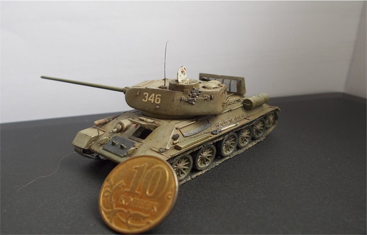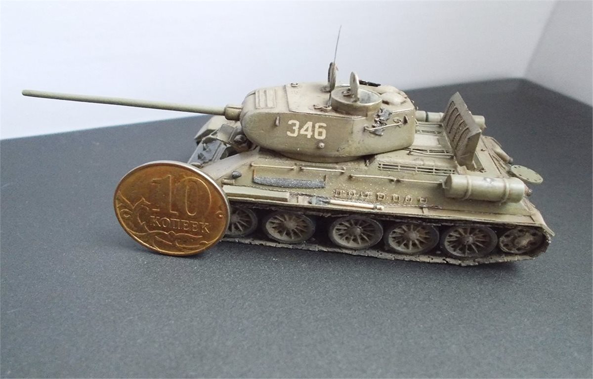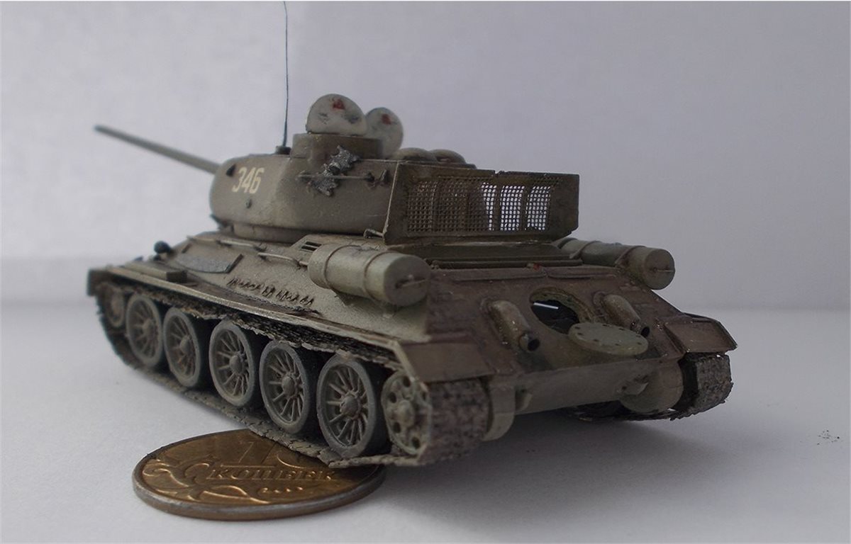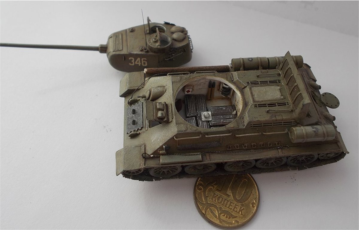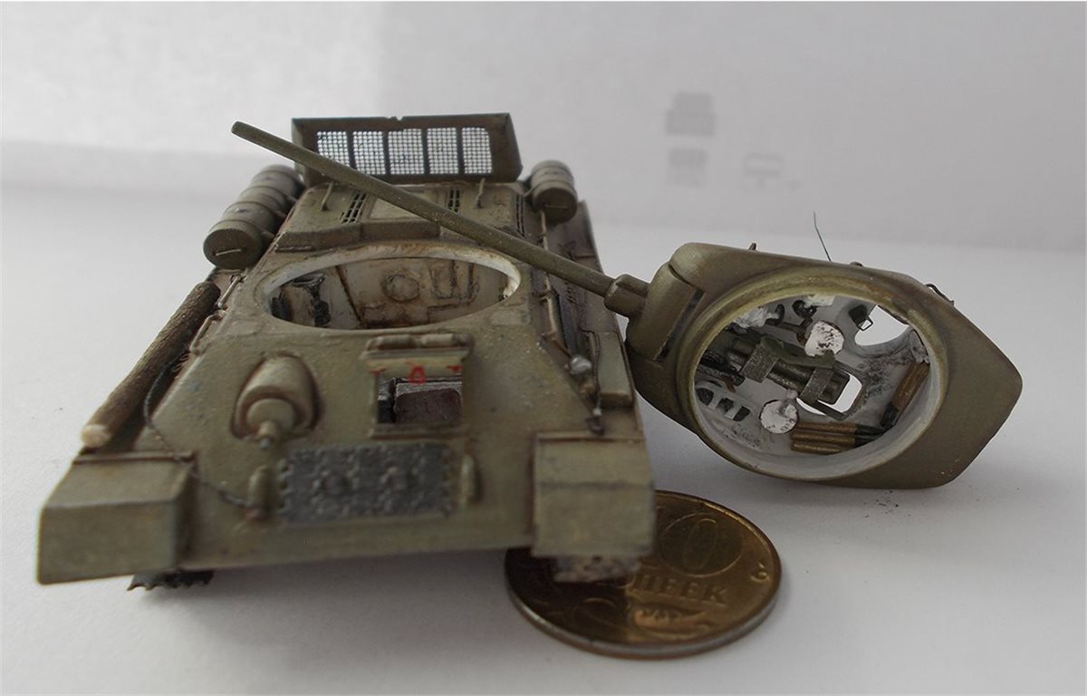 В процессе сборки модели был выполнен интерьер боевого отделения корпуса и башни. Использовался тонкий пластик и алюминиевая фольга 0,15 мм. В экстерьере модели переделаны над гусеничные полки, решётки МТО, открыты люки. Решётки выполнены из самодельного фототравления, крышка жалюзей спаяна из латуни толщиной 0,25 мм. Сделаны тросы, толщина соответствует масштабу. Заменён курсовой пулемёт и выхлопные трубы на иглы от шприцов, доработан антенный ввод, поручни. Ручки шанцевого инструмента изготовлены из дерева. В ходовой модели изготовлены гусеничные ленты из отдельных траков. Траки изготовлены из самодельного фото травления. Результат работы на фото.