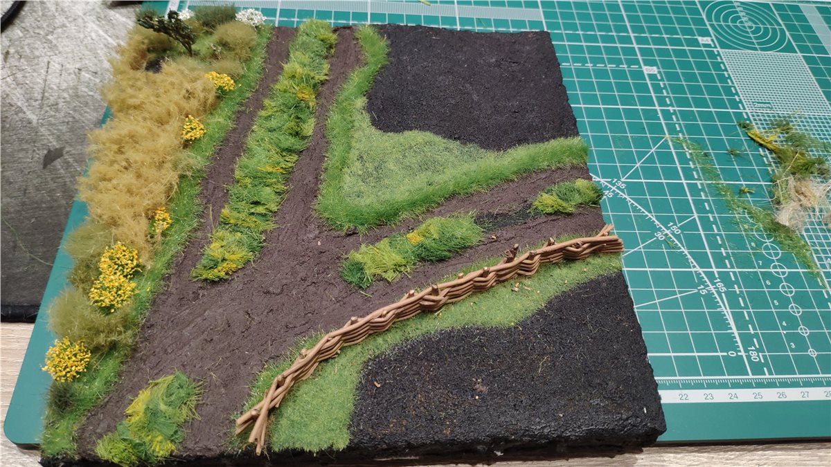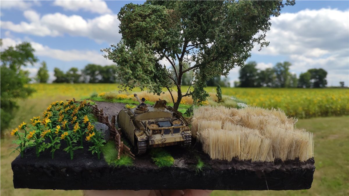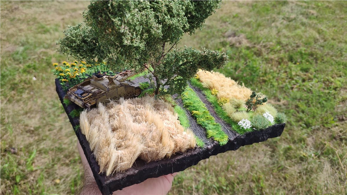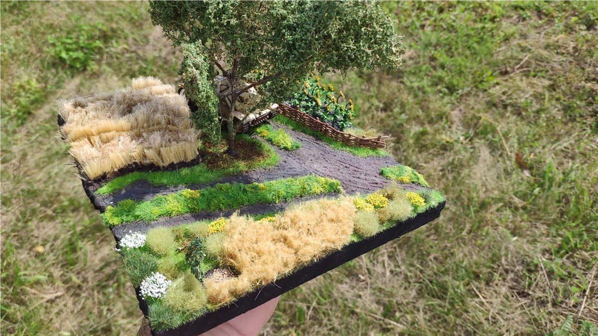 Основание диорамы пеноплекс, песок+ПВА, а также текстурные пасты Vallejo и Citadel. Флок Noch, кустки Noch, gamer's painter. Пшеница крашеный лен и щетина от щетки малярной. Дерево - из набора для создания натуральных деревьев Noch (собран из четырех пучков и наклеены на ствол кусочки салфетки для имитации текстуры коры) и листья трех оттенков Noch. Дерево красил четырмя оттенками коричневого Vallejo.