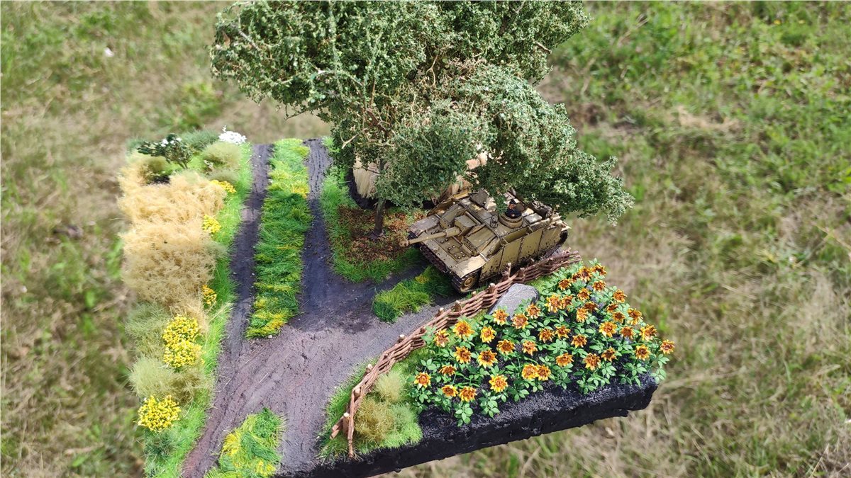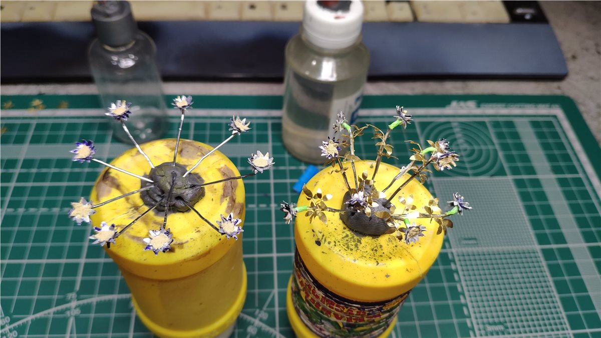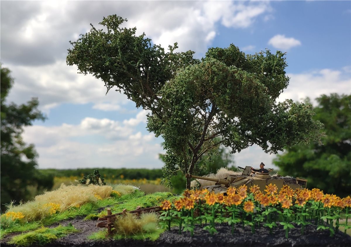 Подсолнухи сделаны так :из трех кружков пив.жести делается корона. Два круга - корона, третий - листья сзади подсолнуха, крепятся на проволочку 0,8мм. Внутри короны тестурная паста Тамия "Песок". Листики - из набора фототравления Miniwarpaint. Каждый листик кончик согнут. Листья снизу и ствол покрашены в более темный оттенок uniform green, листья сверху светлее olive green и ещё добавил полоску на каждый листик yellow green. Корона deep yellow, центр transparent orange, затем cidadel agrax earthshade, и корону прошёлся citadel seraphim sepia.