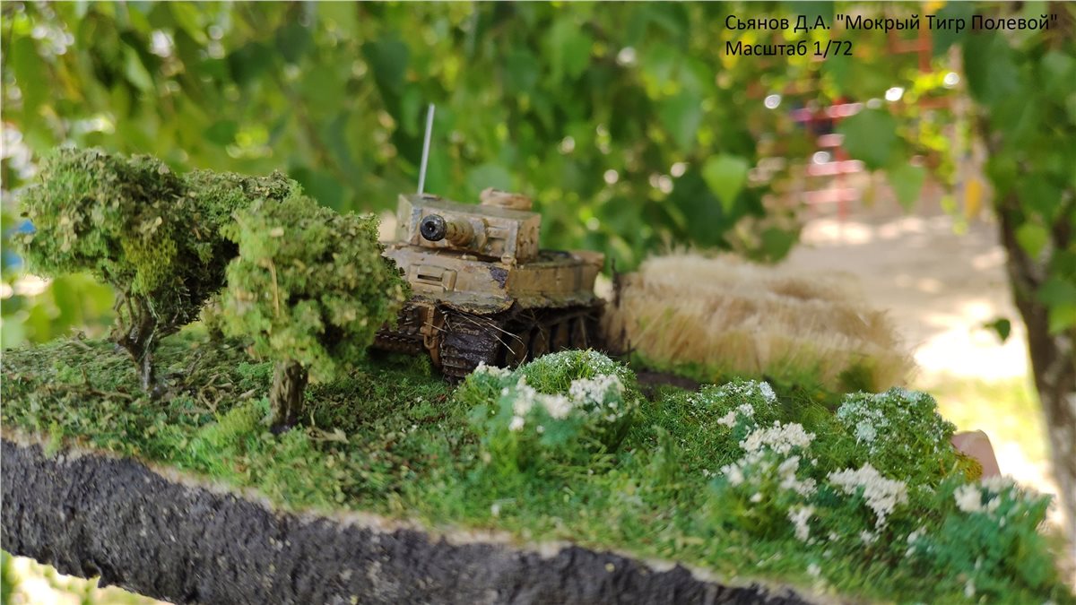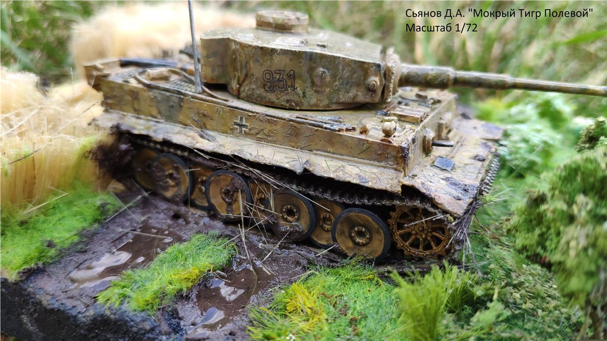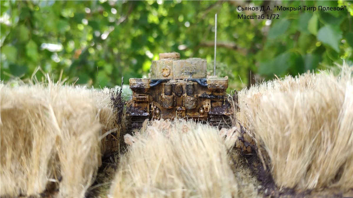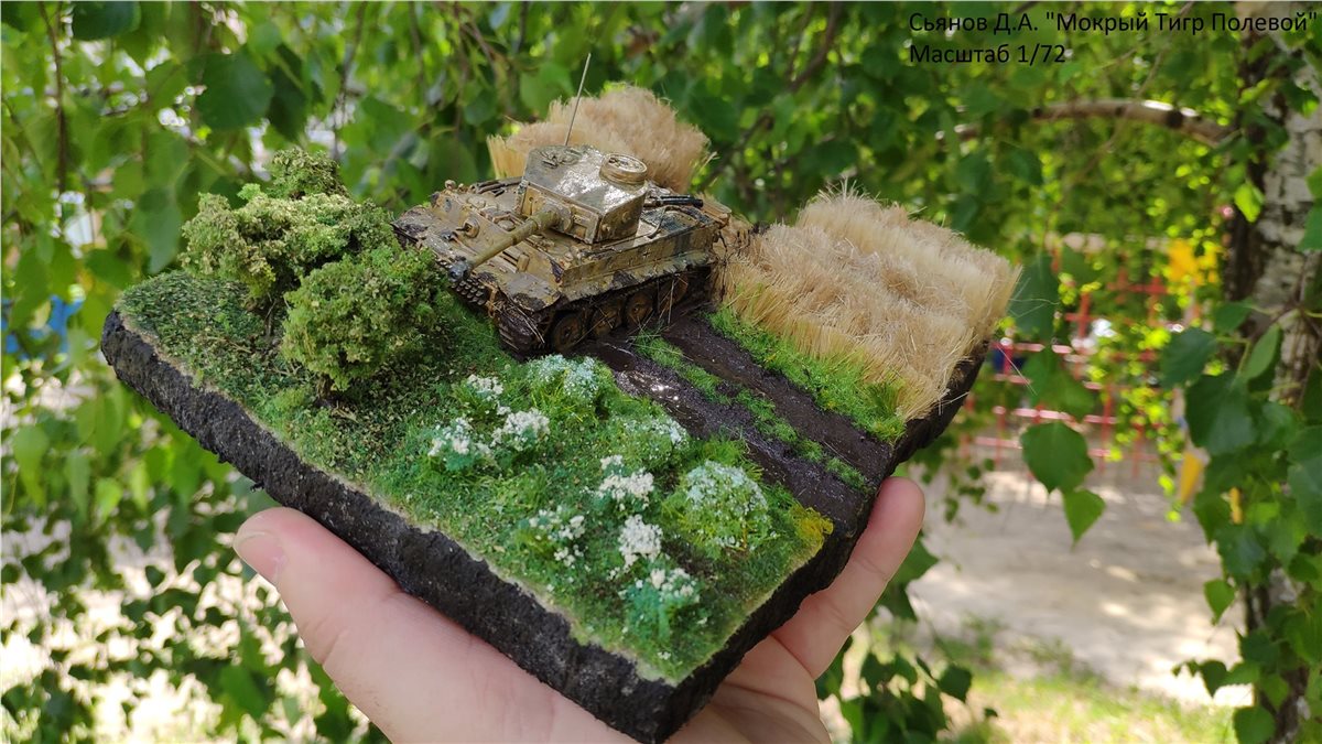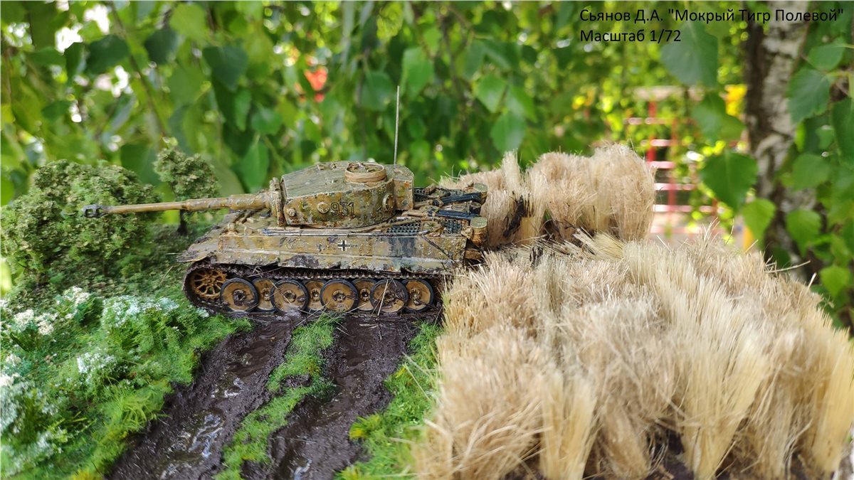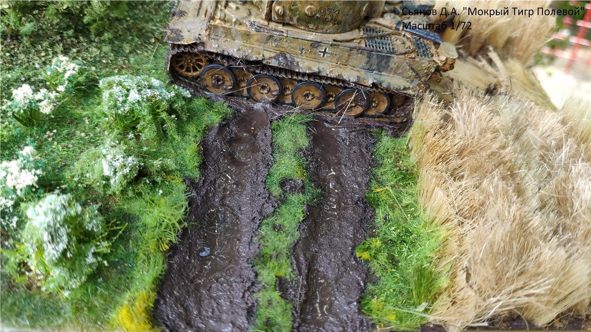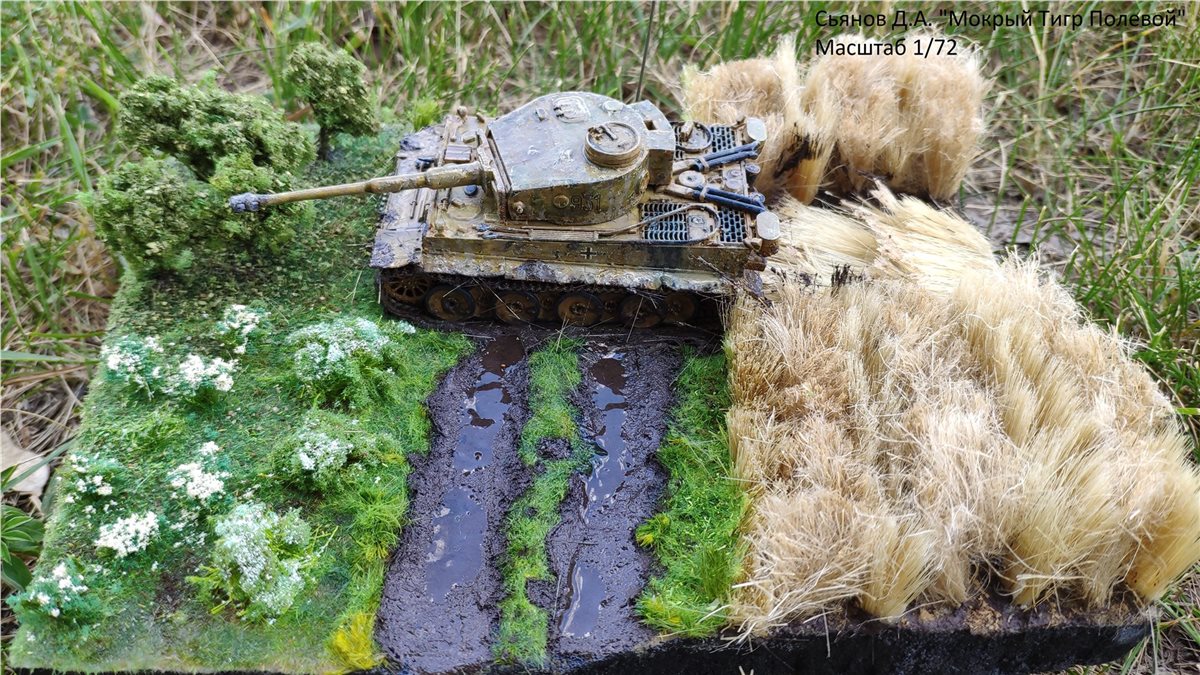Моя первая диорама "Мокрый Тигр Полевой". Задача была сделать пшеничное поле с пробитой танком стерней. А еще прошел дождь и все мокрое и грязное.