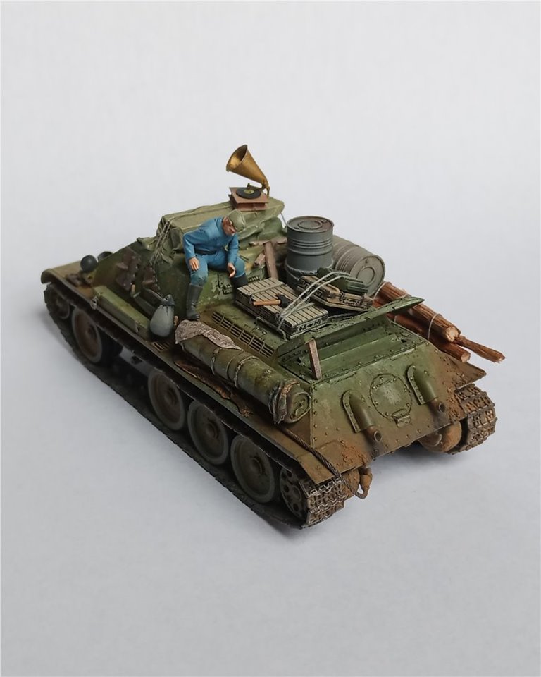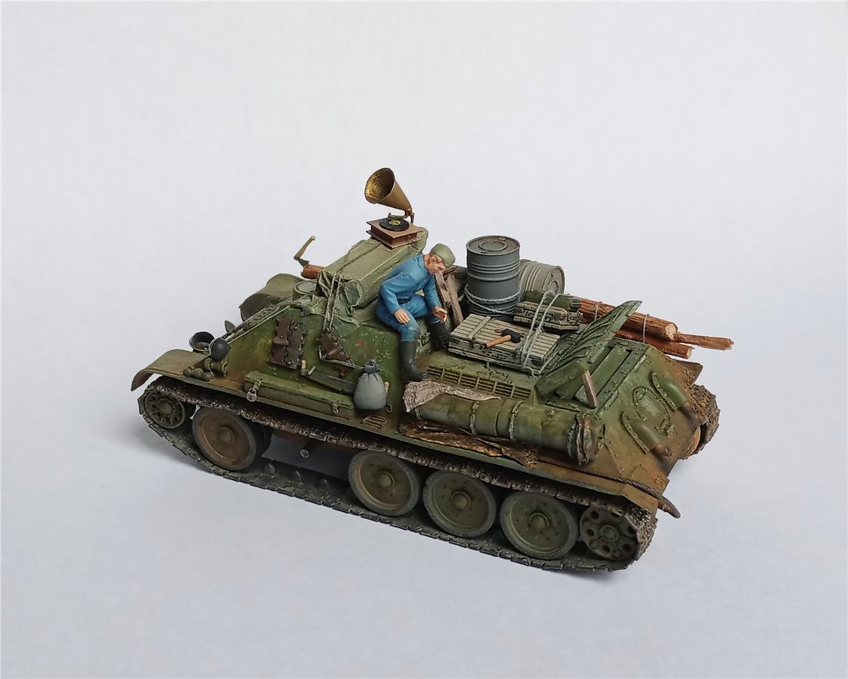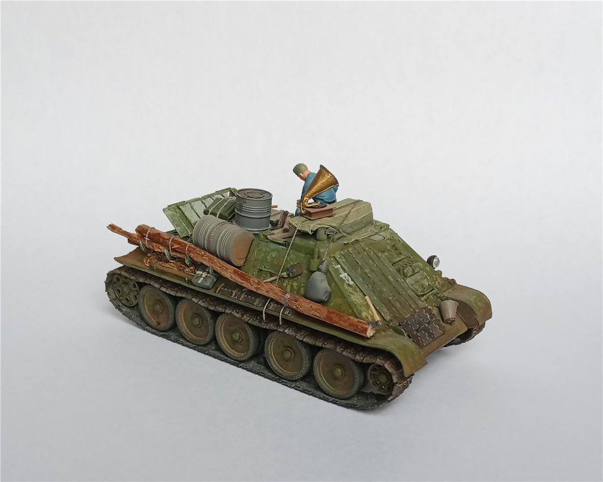 Задумка: одна из последних машин колонны "Советский старатель", работающая в роли тягача. Машина, пережившая не один ремонт. Гусеничные ленты собраны из траков разных типов. Датировка: апрель-май 45го.