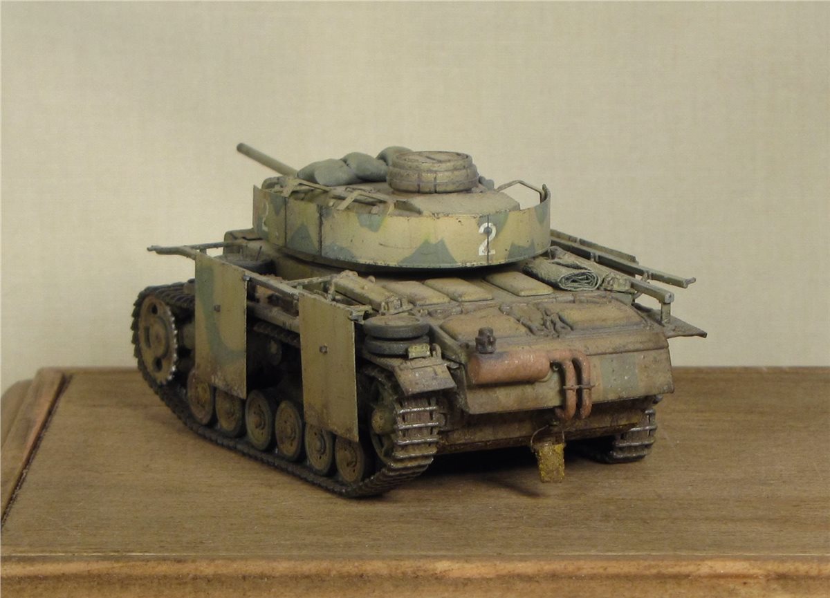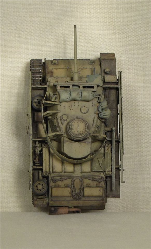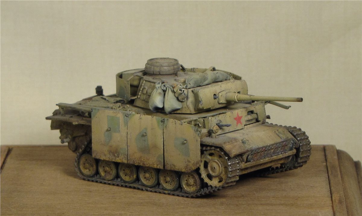 По легенде: Была захвачена Красной Армией, отремонтирована в полевой мастерской и введена в строй. Часть утерянных экранов была заменена экранами с других машин, подручными средствами (мешки с песком). Балочные кресты (ранее были нанесены на экраны корпуса