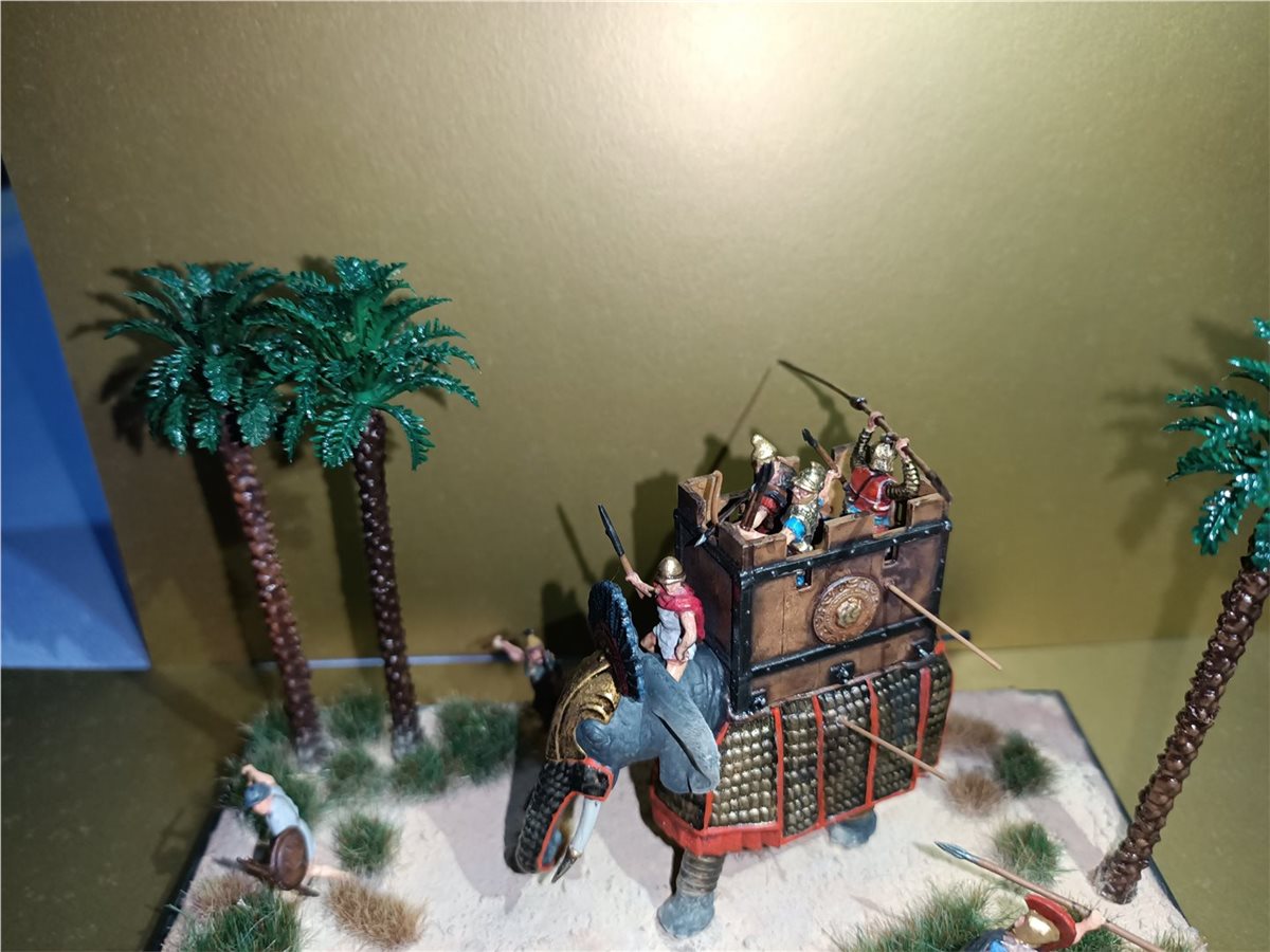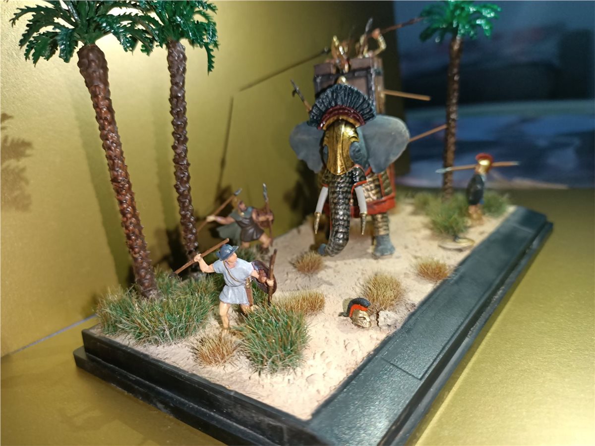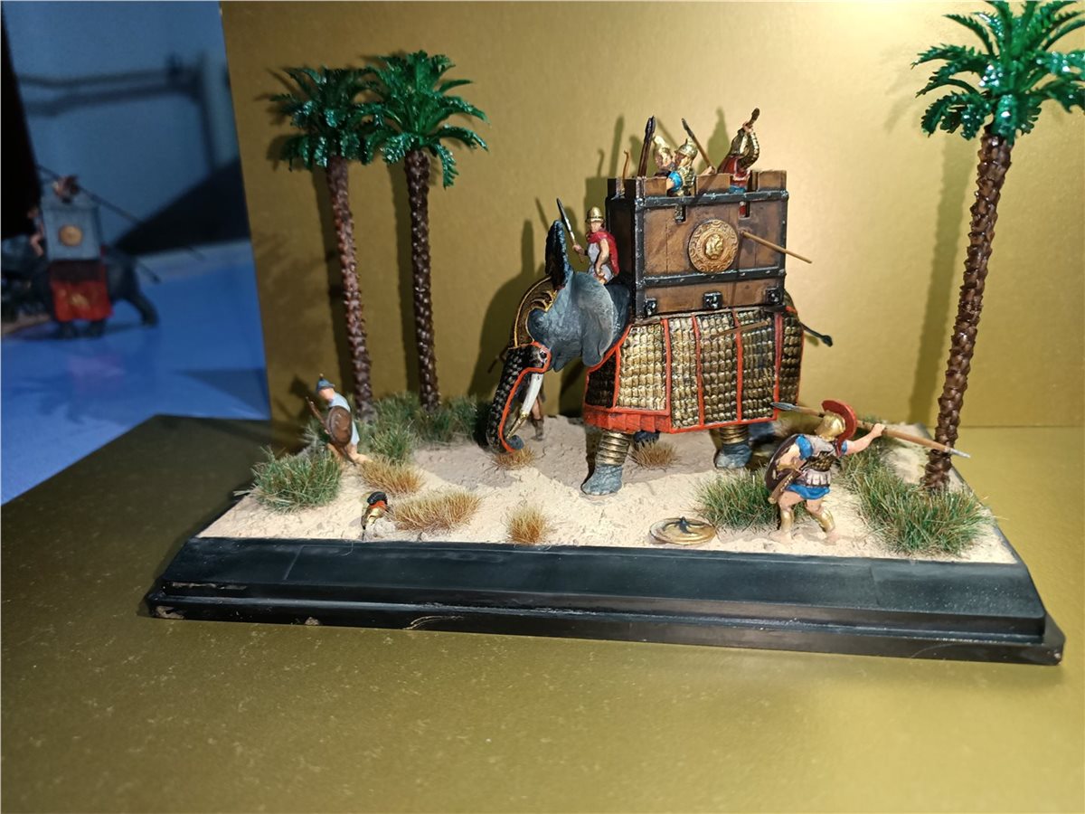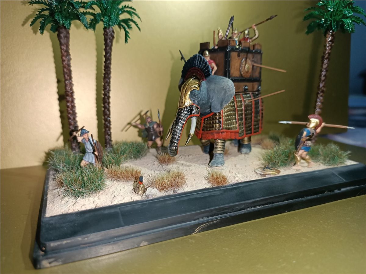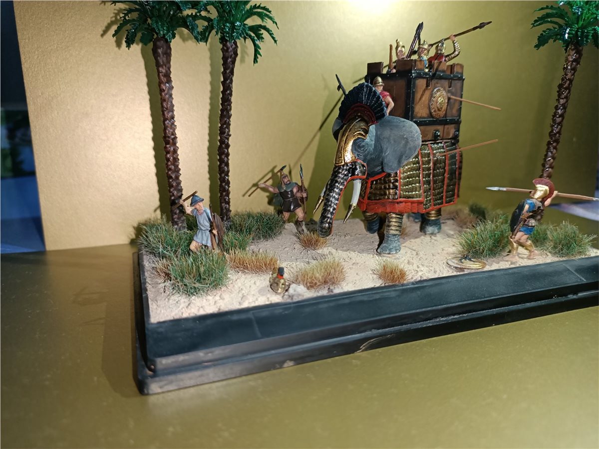 Использовал набор боевых слонов и греческую пехоту в 1/72 масштабе от фирмы "Звезда". Красилось все обычной звездой и макр. Пигменты от wilder, пальмы от фирмы ZIP. Первый опыт в создании виньеток)