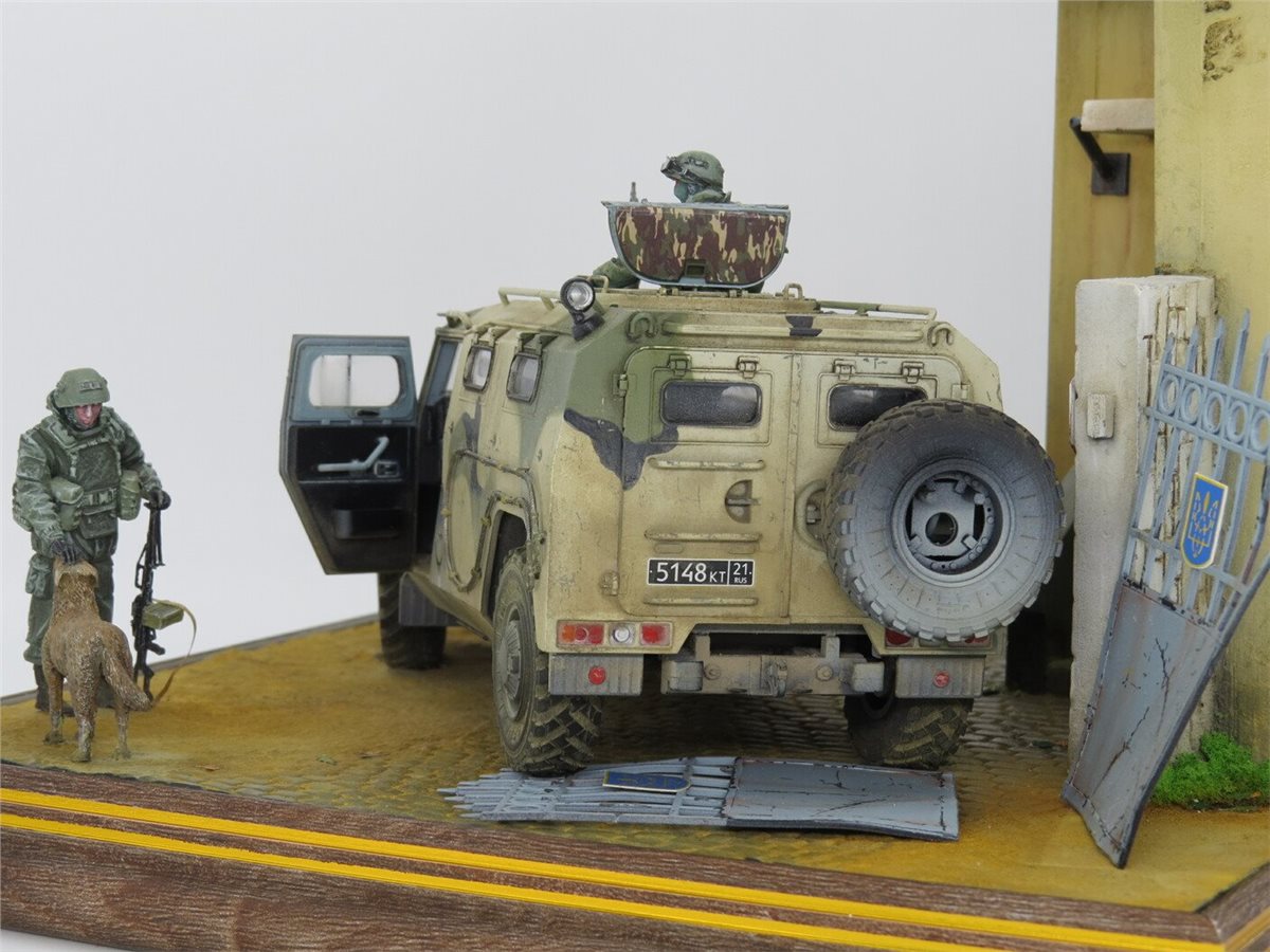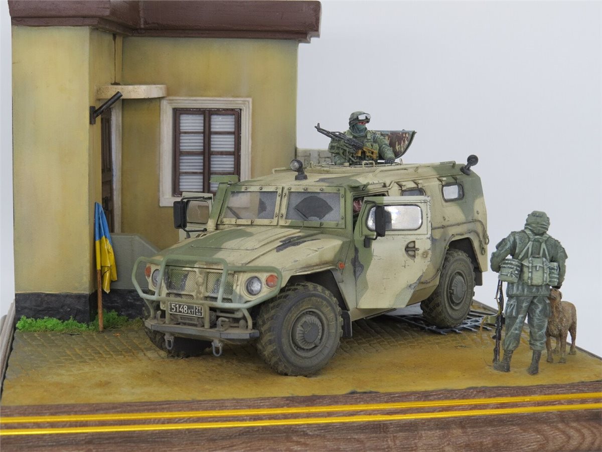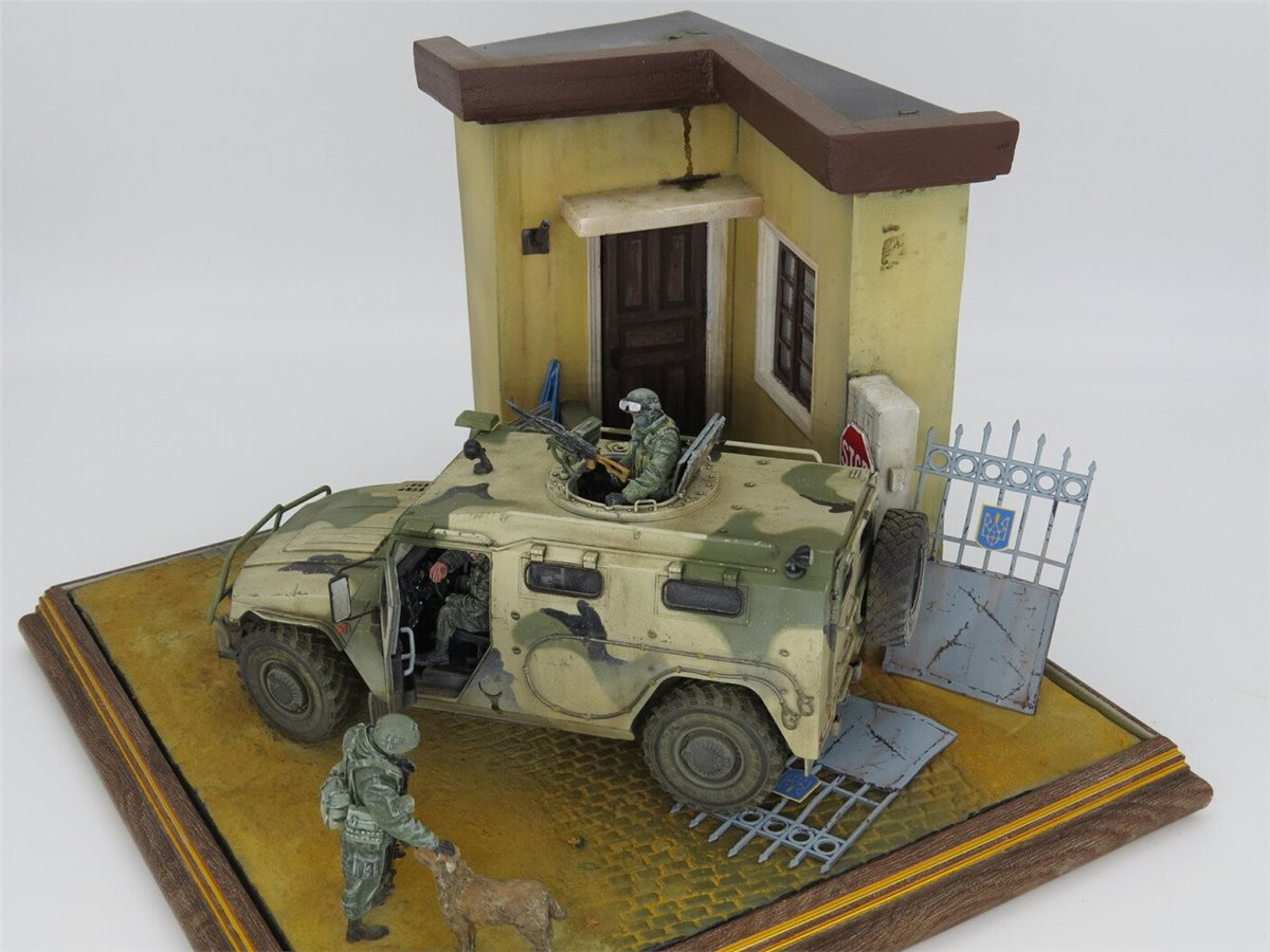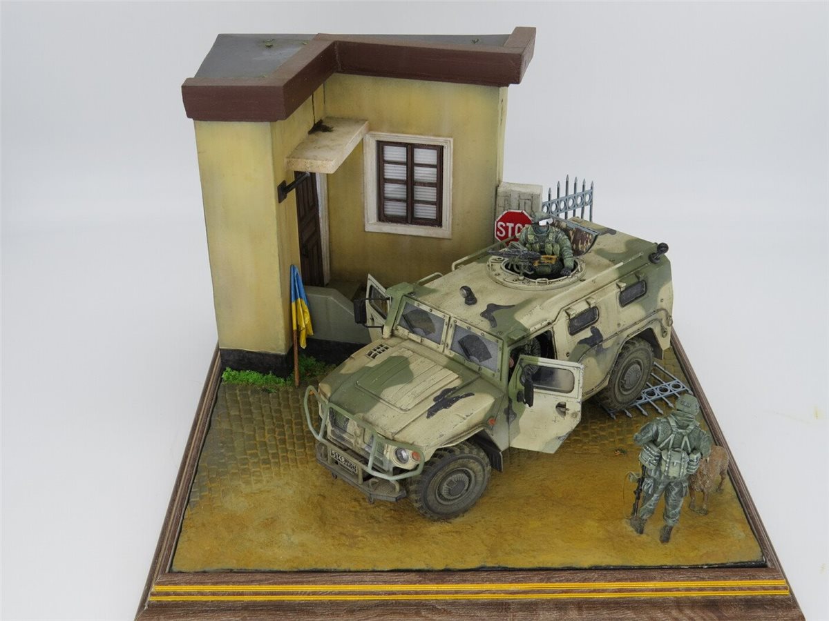 Крымские события, давшие современной России интереснейший феномен «вежливых людей», а отечественной истории — понятие «русской весны», уже оценены с разных точек зрения и будут оцениваться впредь. Однако проведенная в Крыму военная операция сама по себе настолько не соответствует привычным представлениям о российской армии постсоветского периода, что заслуживает отдельного внимания.Произошедшее с военной точки зрения можно разделить на несколько аспектов: собственно действия по взятию под контроль ключевых объектов полуострова и блокированию украинских воинских частей, последующее удержание ситуации под контролем и PR-эффект событий.Внезапное и быстрое появление отлично организованных вооруженных подразделений вызвало шок не только у отечественных наблюдателей, но и у западных, в том числе тех, кто по должности должен был отслеживать подобные перемещения.К утру 1 марта в Крыму фактически не осталось не блокированных «вежливыми силами» воинских частей украинской армии, а блокада аэродромов и портов исключала их доставку извне. По оценкам западных аналитиков, операция была проведена намного быстрее, чем требуется для обычных, даже хорошо подготовленных вооруженных сил. На блокирование основных воинских частей и аэродромов ушло менее суток. Все объекты были взяты под контроль без применения оружия.Жертв не было (не считая последовавшего уже после инцидента в Симферополе), хотя в составе украинских войск в Крыму имелась определенная доля «мотивированного» контингента из Западной и Центральной Украины. Это говорит о хорошо выполненной предварительной фазе психологической обработки и исключительной выдержке задействованных в операции войск.В данной работе был использован общеизвестный кит "Тигра" от компании Meng, смоляные фигурки и часть элементов строения из набора Миниарт, которые переделал под себя. Нутрянка авто деталирована, (благо производитель это предлагает), а вот открывать все двери не стал посчитал через чур лишним в данном контексте.В работе использованы краски Pacific и АК. для окраски фигурок использую, как всегда, темперу.