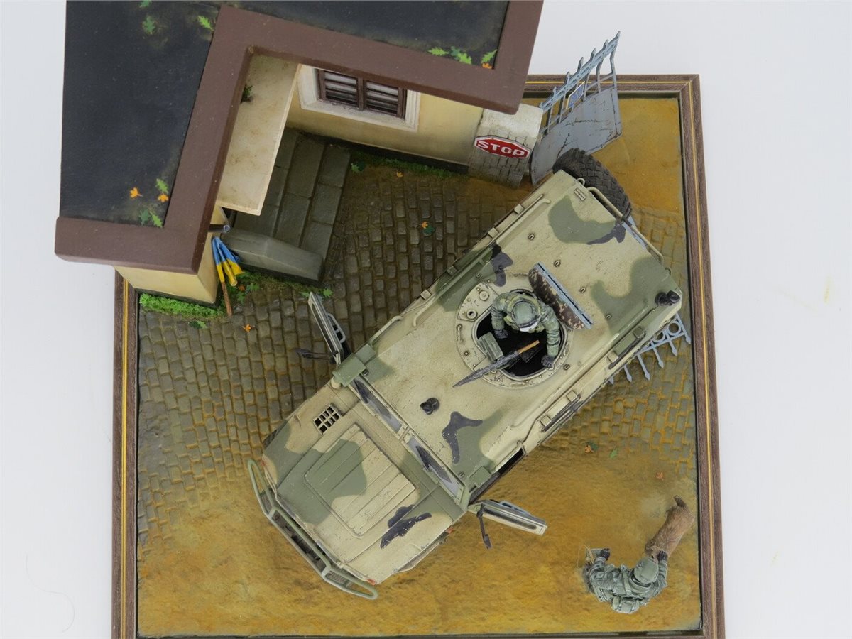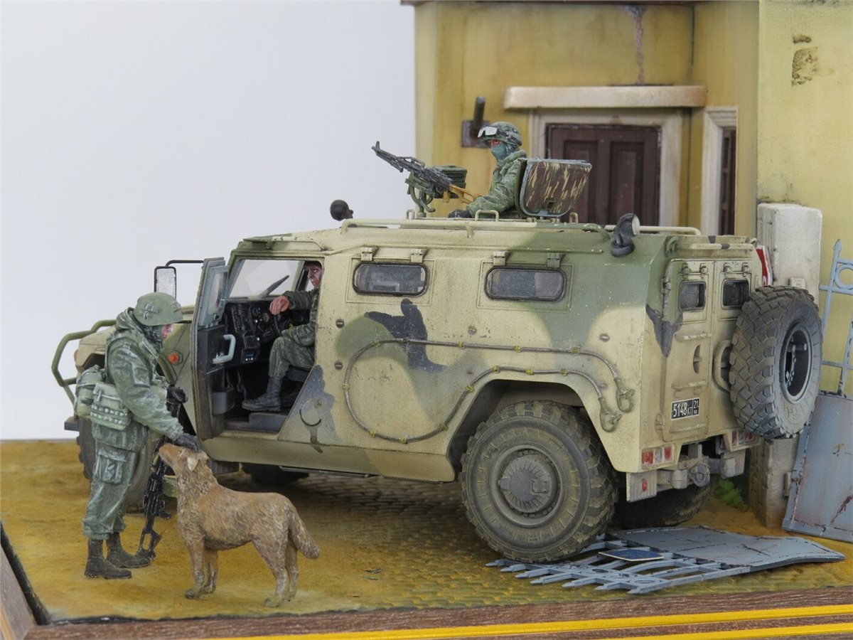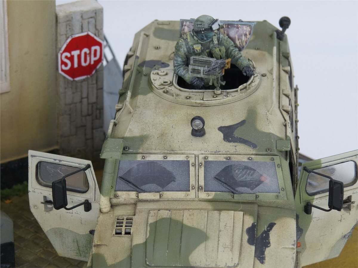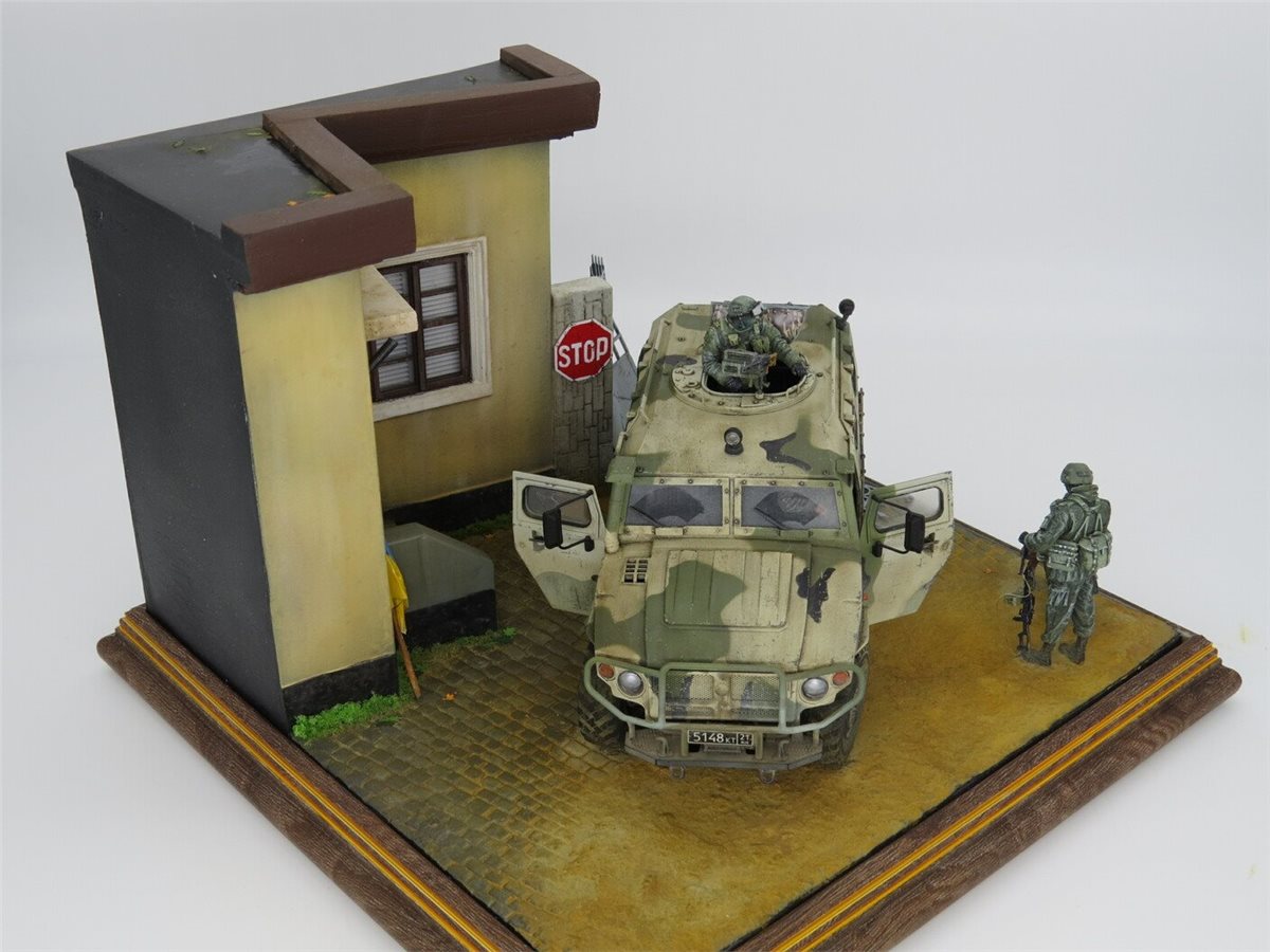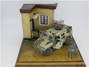Крымские события, давшие современной России интереснейший феномен «вежливых людей», а отечественной истории — понятие «русской весны», уже оценены с разных точек зрения и будут оцениваться впредь. Однако проведенная в Крыму военная операция сама по себе настолько не соответствует привычным представлениям о российской армии постсоветского периода, что заслуживает отдельного внимания.Произошедшее с военной точки зрения можно разделить на несколько аспектов: собственно действия по взятию под контроль ключевых объектов полуострова и блокированию украинских воинских частей, последующее удержание ситуации под контролем и PR-эффект событий.Внезапное и быстрое появление отлично организованных вооруженных подразделений вызвало шок не только у отечественных наблюдателей, но и у западных, в том числе тех, кто по должности должен был отслеживать подобные перемещения.К утру 1 марта в Крыму фактически не осталось не блокированных «вежливыми силами» воинских частей украинской армии, а блокада аэродромов и портов исключала их доставку извне. По оценкам западных аналитиков, операция была проведена намного быстрее, чем требуется для обычных, даже хорошо подготовленных вооруженных сил. На блокирование основных воинских частей и аэродромов ушло менее суток. Все объекты были взяты под контроль без применения оружия.Жертв не было (не считая последовавшего уже после инцидента в Симферополе), хотя в составе украинских войск в Крыму имелась определенная доля «мотивированного» контингента из Западной и Центральной Украины. Это говорит о хорошо выполненной предварительной фазе психологической обработки и исключительной выдержке задействованных в операции войск.В данной работе был использован общеизвестный кит "Тигра" от компании Meng, смоляные фигурки и часть элементов строения из набора Миниарт, которые переделал под себя. Нутрянка авто деталирована, (благо производитель это предлагает), а вот открывать все двери не стал посчитал через чур лишним в данном контексте.В работе использованы краски Pacific и АК. для окраски фигурок использую, как всегда, темперу.